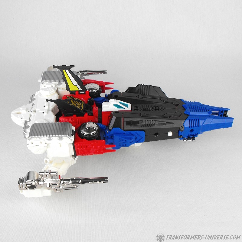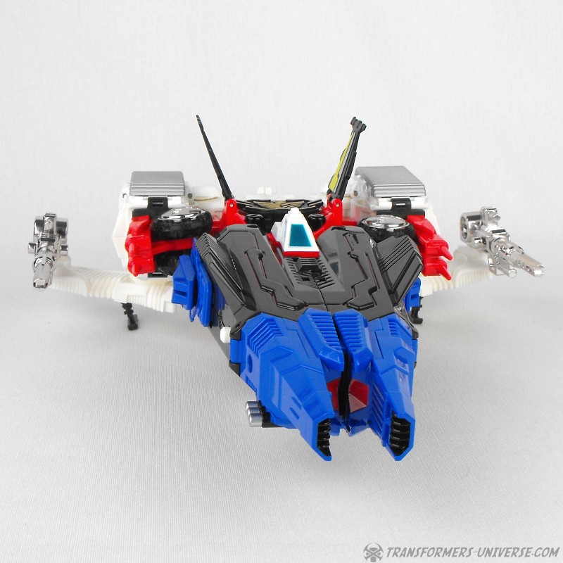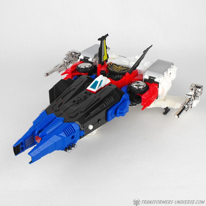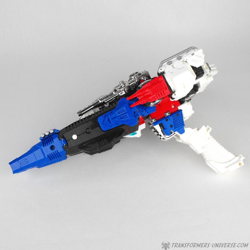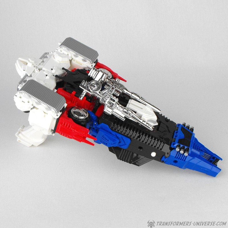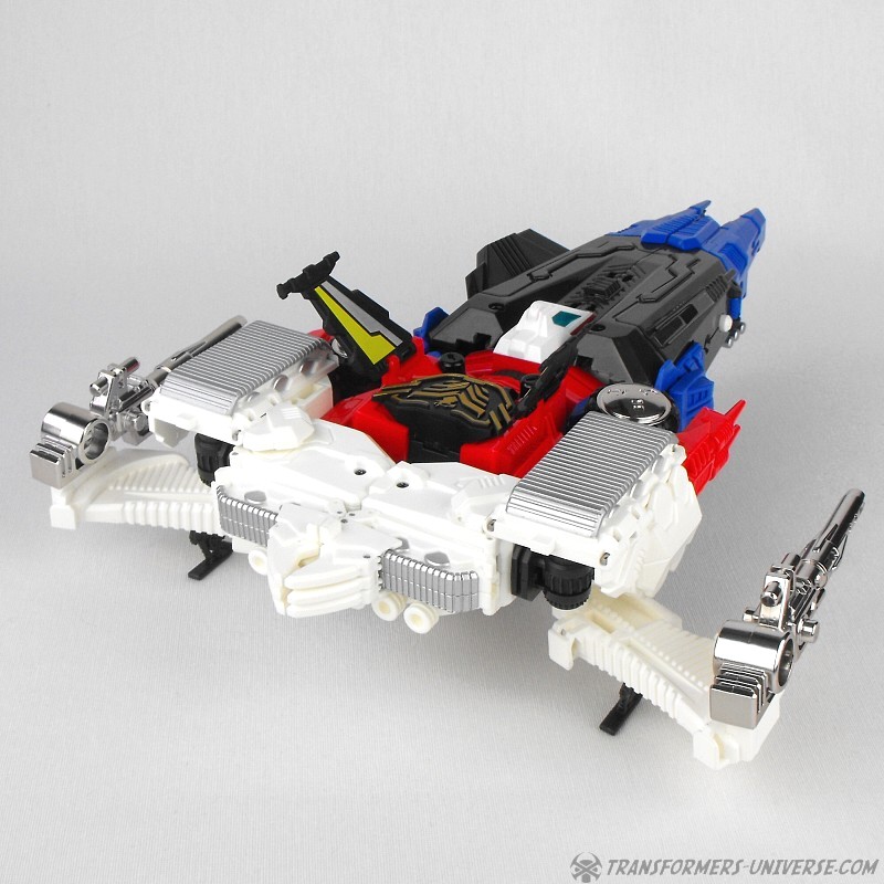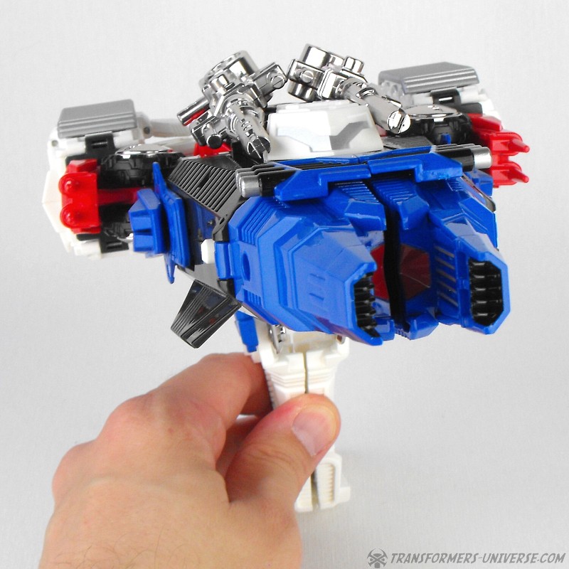 Der fünfte und für mich gelungenste Fahrzeugmodus: der Weltraumjäger. Für mich der schnittigste von Grandus‘ Modi und auch der mit den wenigsten überbleibenden Anhängseln. Er sieht tatsächlich recht aerodynamisch aus (also einigermaßen zumindest) und könnte durchaus in einem Science Fiction Film vorkommen. Das Fahrgestell ist jetzt nicht besonders toll, nur zwei winzige Kufen, die aus den Flügeln ausklappen, sowie einem Anhängsel das vorgibt eine Kufe zu sein in der Mitte, aber es funktioniert. Somit ganz klar: sollte ich Grandus nochmal transformieren, dann wohl am ehesten in den Jetmodus.