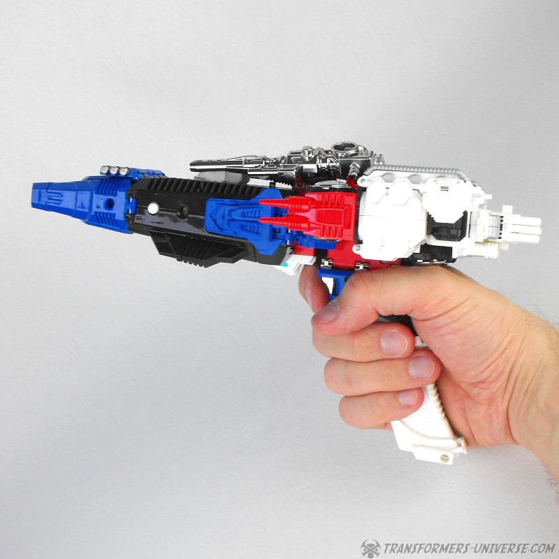 Und dann ist da noch der Waffenmodus, im Prinzip der Jetmodus mit den Flügeln runtergeklappt, die dann den Griff bilden. Es gibt nur sehr, sehr, sehr wenige Transformer, die einen guten Waffenmodus haben und nein, Grandus Hexatron gehört nicht dazu. Also... ja, haken wir diesen Punkt ab.