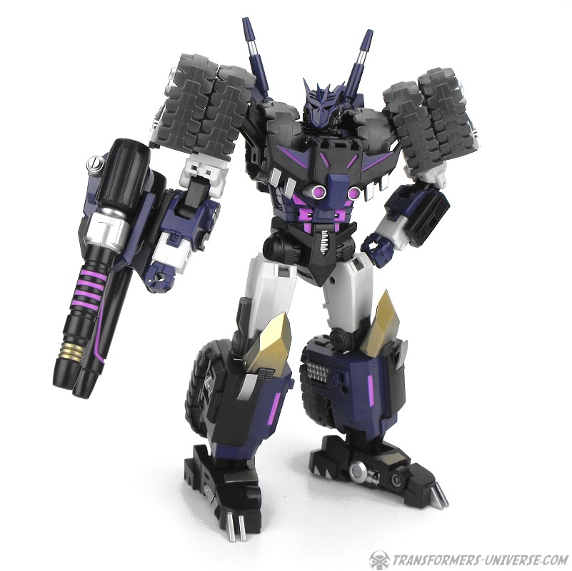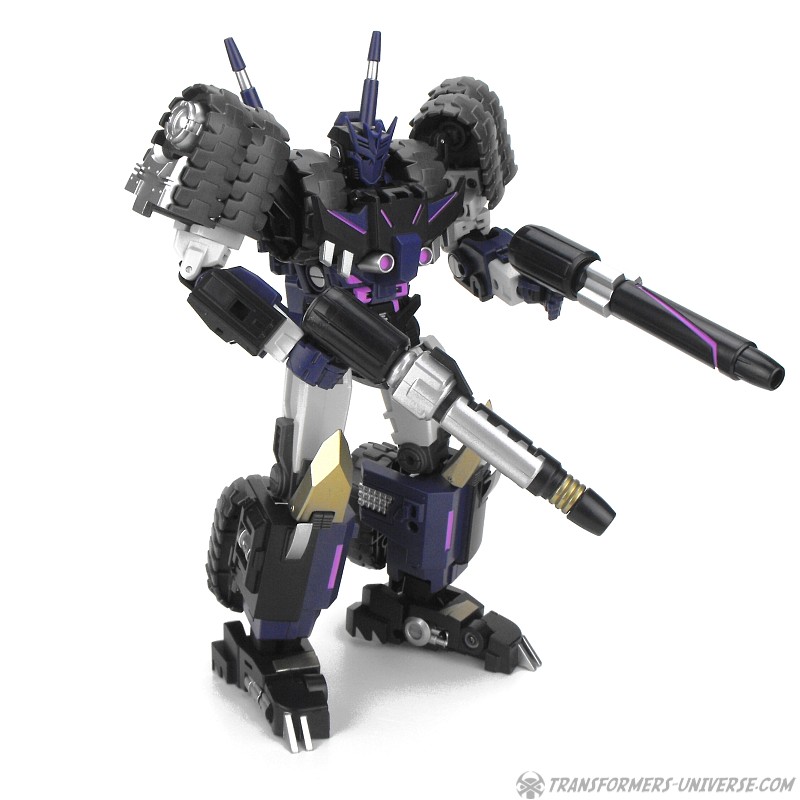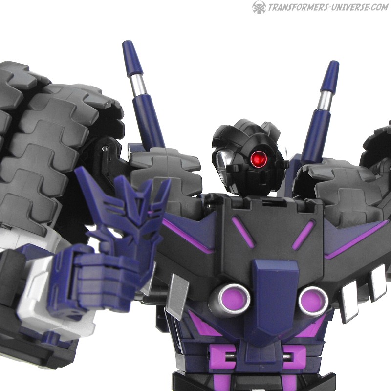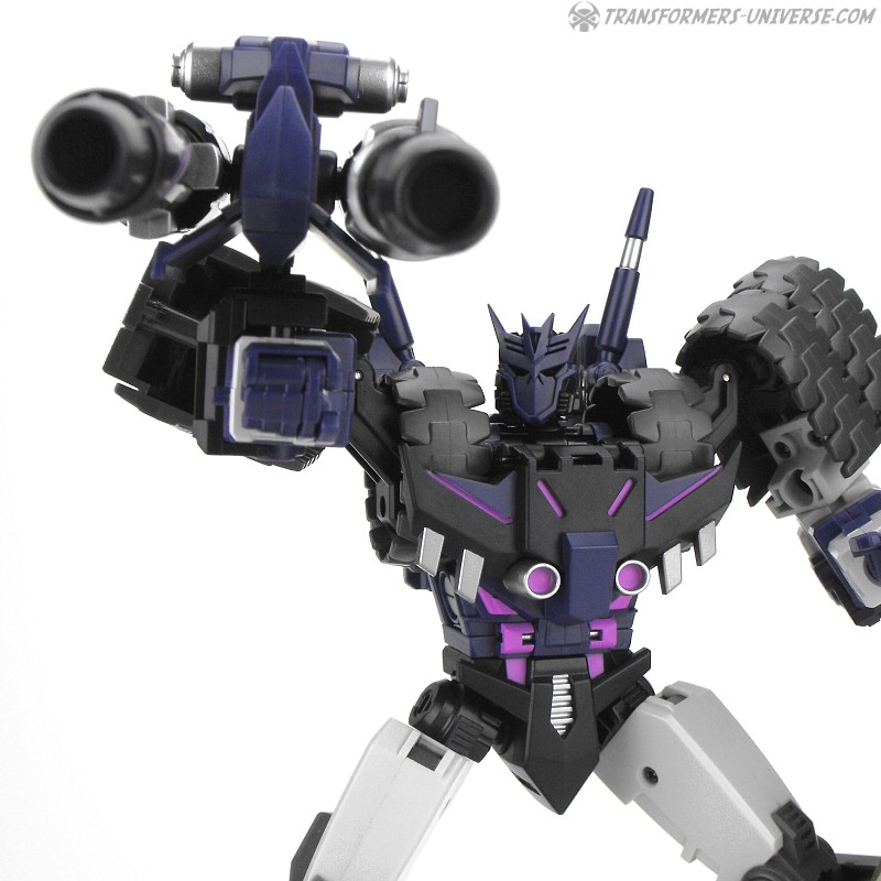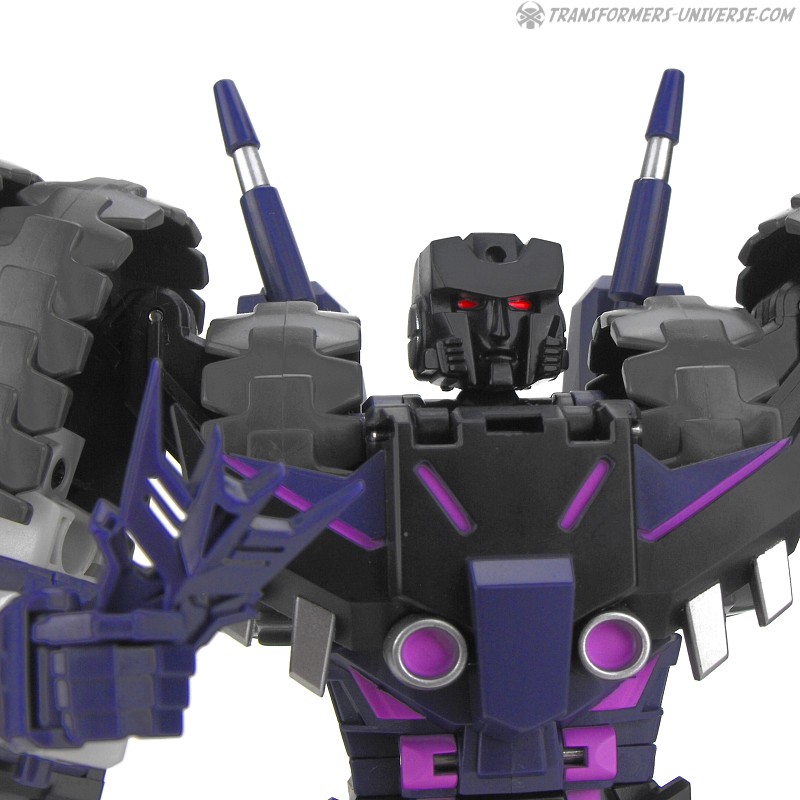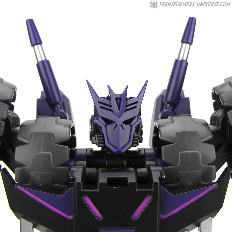 Robotermodus: Vom Design her ist Kultur einer der am coolsten aussehenden Roboter seit langem für mich. Sowohl in Form als auch Farbe ist er der quintessentielle Decepticon. Da ist natürlich seine Maske, die dem Decepticon Symbol entspricht, aber auch sein Torso ist so ein wenig dem Symbol nachempfunden. Die dreifachen Panzerketten, die seine Schultern bilden, lassen ihn enorm breit und kräftig wirken. Dazu dann die Doppelkanone am Arm und der Look ist perfekt. Ja, das hier ist ein böser Roboter, ein Decepticon! Kein Zweifel!