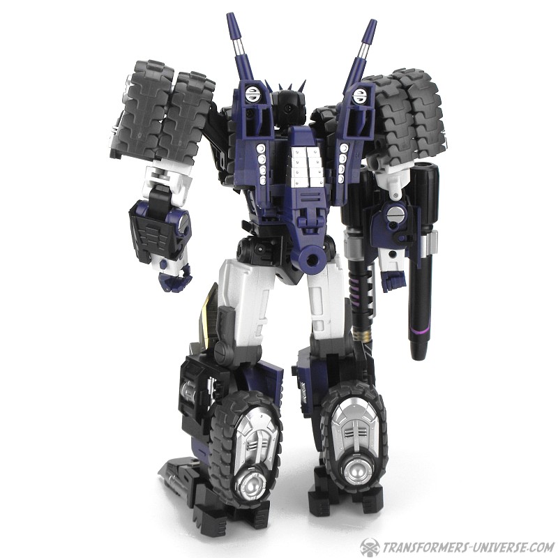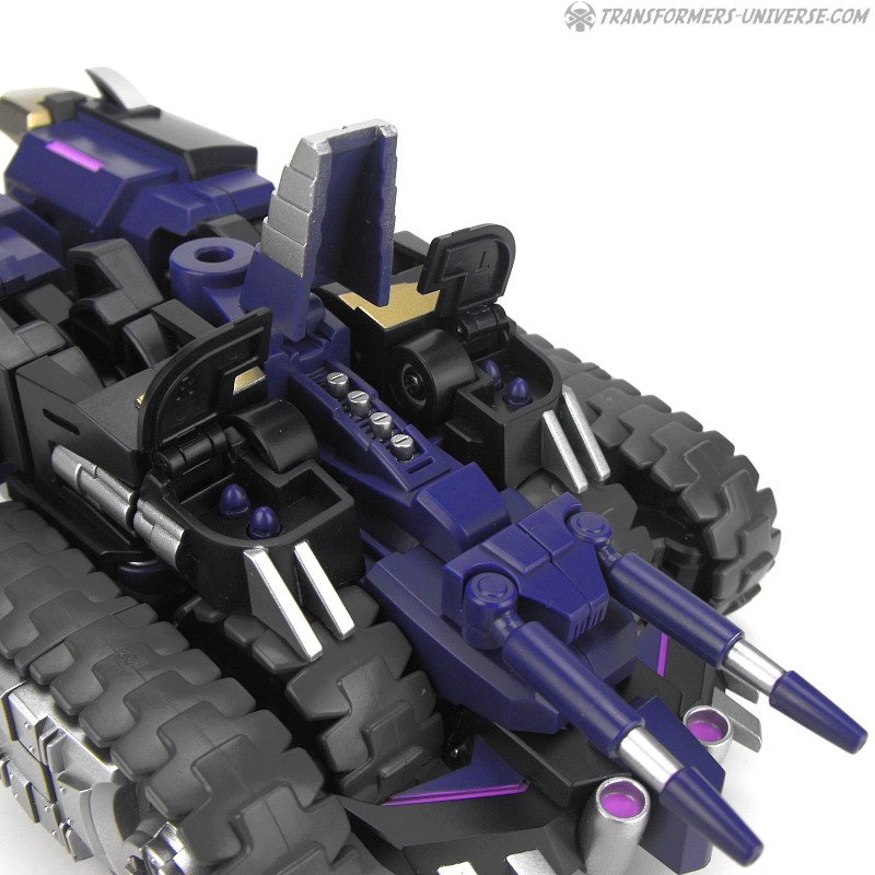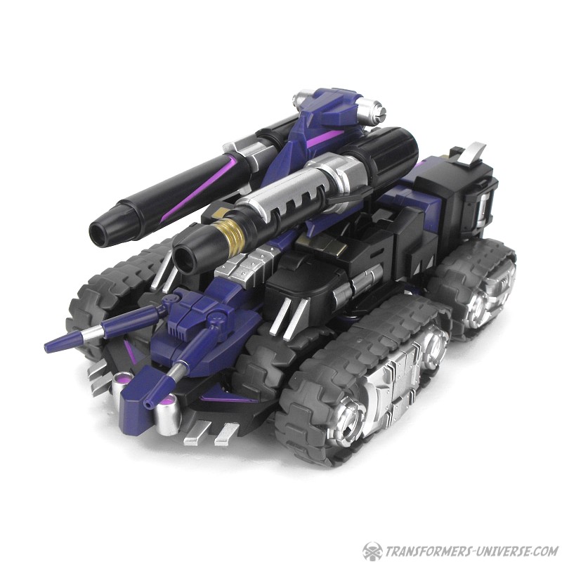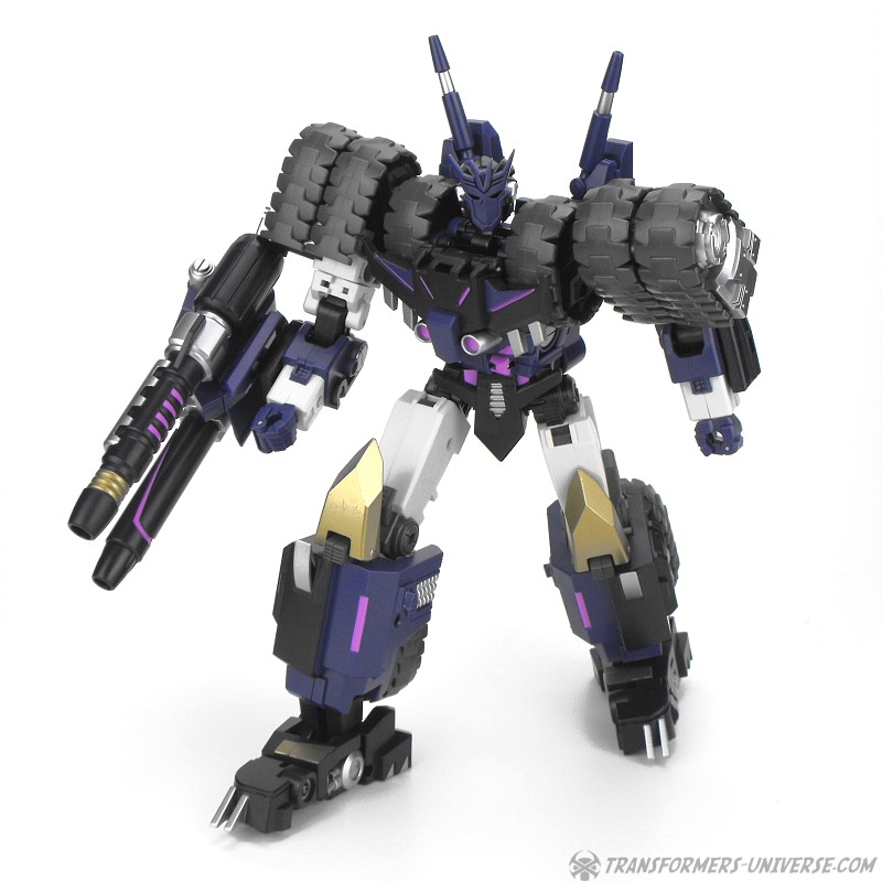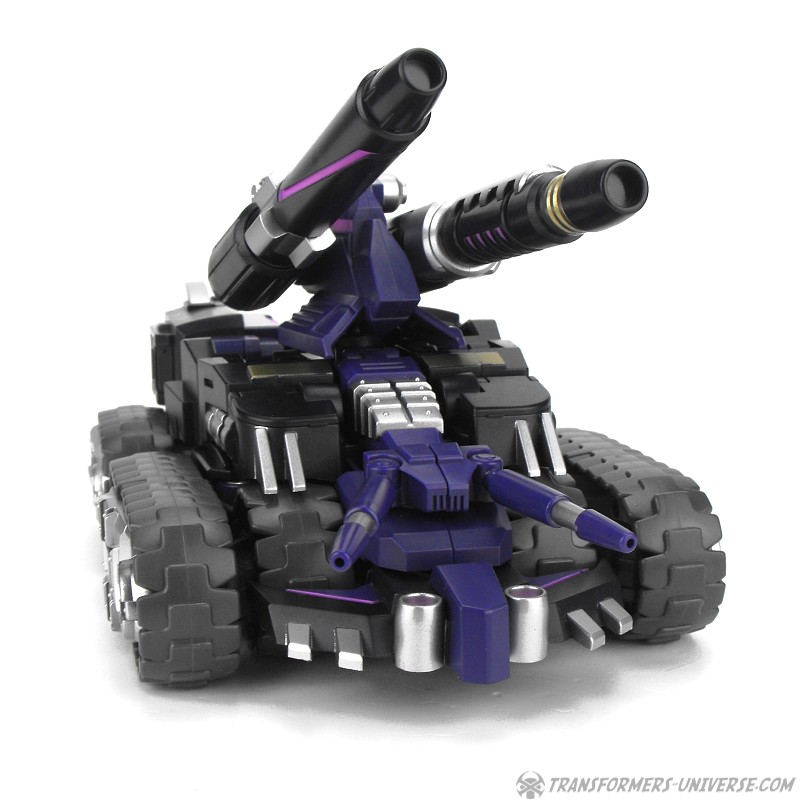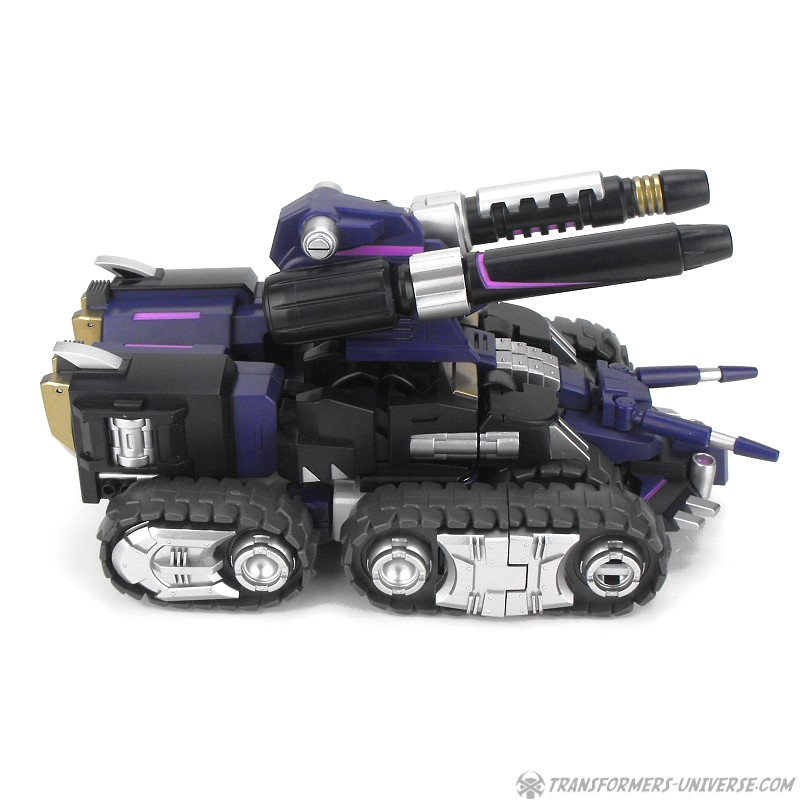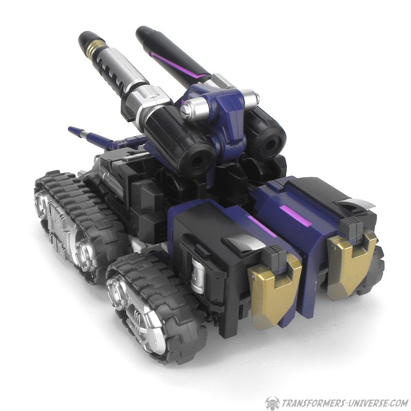Robotermodus: Vom Design her ist Kultur einer der am coolsten aussehenden Roboter seit langem für mich. Sowohl in Form als auch Farbe ist er der quintessentielle Decepticon. Da ist natürlich seine Maske, die dem Decepticon Symbol entspricht, aber auch sein Torso ist so ein wenig dem Symbol nachempfunden. Die dreifachen Panzerketten, die seine Schultern bilden, lassen ihn enorm breit und kräftig wirken. Dazu dann die Doppelkanone am Arm und der Look ist perfekt. Ja, das hier ist ein böser Roboter, ein Decepticon! Kein Zweifel!