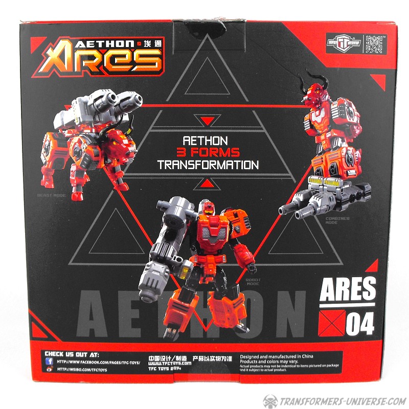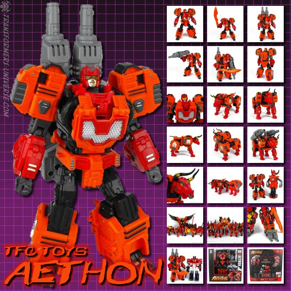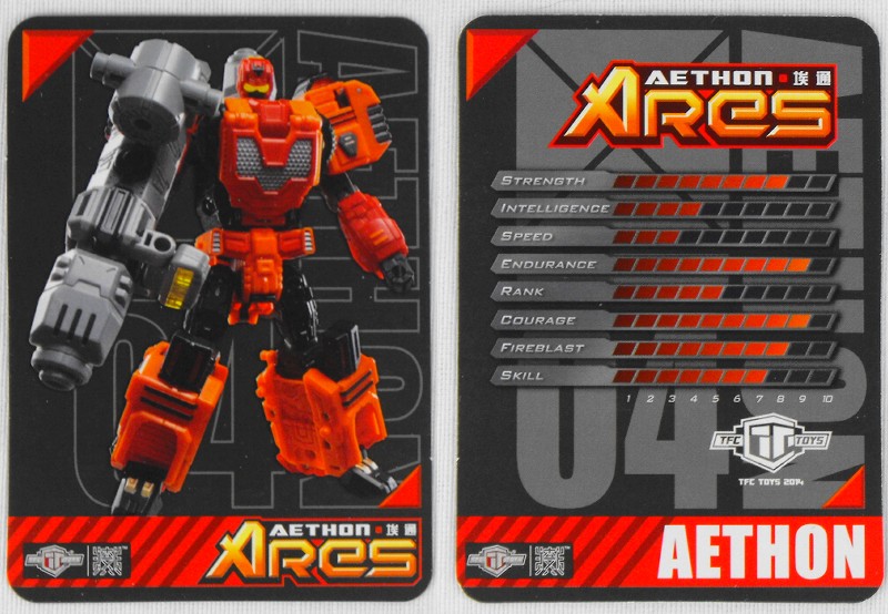 Aethon ist der dritte TFC Predacon der nach einem von Ares‘ feuerspeienden Pferden aus der griechischen Mythologie benannt ist. Das griechische Wort aithôn bedeutet soviel wie „brennend“ oder „grell“ und wurde auch mal von Odysseus als Alias benutzt. Was die Figur selbst angeht, ist sie für mich persönlich die schlechteste der fünf TFC Predacons, wenn auch nur um Haaresbreite. Aethon ist jetzt keine schlechte Figur, aber angesichts des Preises holt man ihn sich nur deshalb, damit Ares zwei Beine hat. Kein anderer Grund.