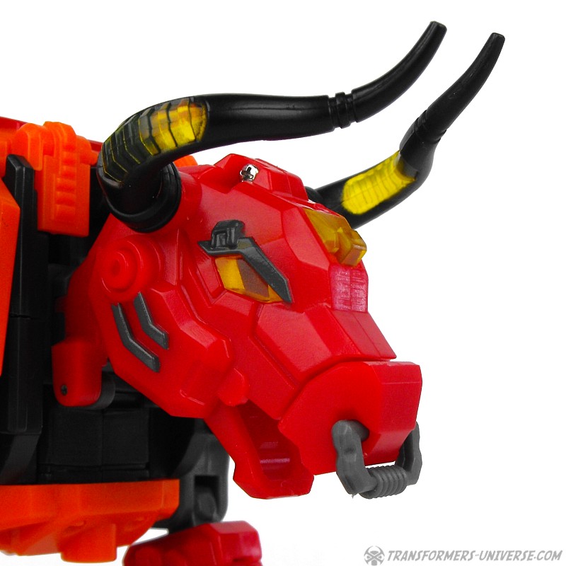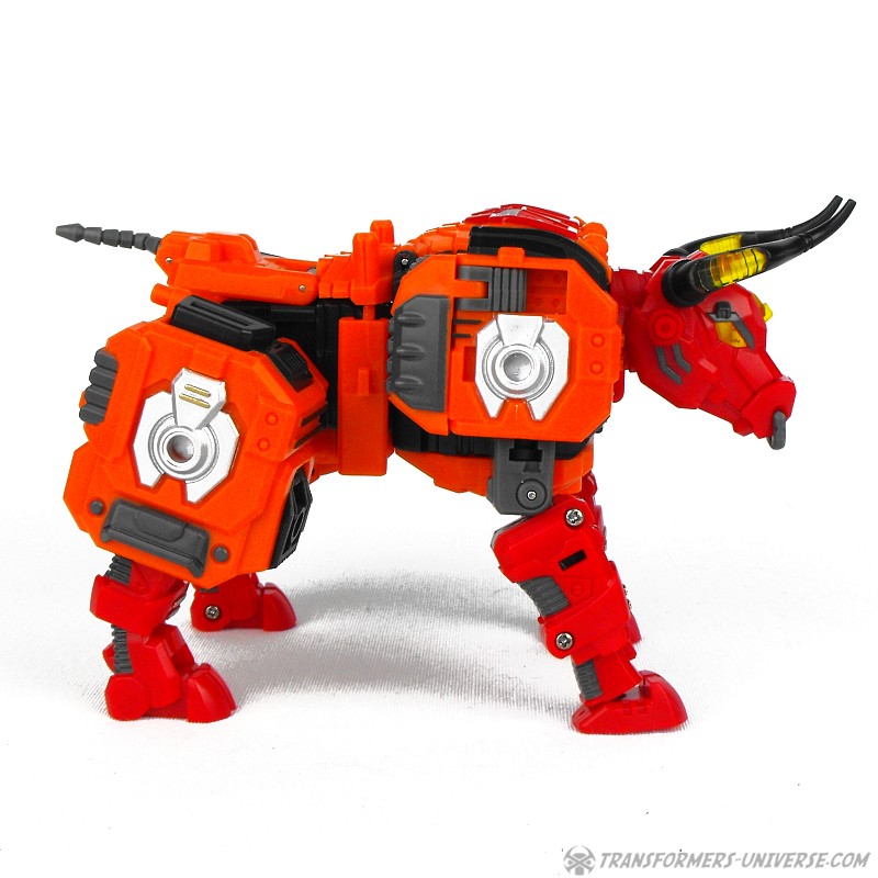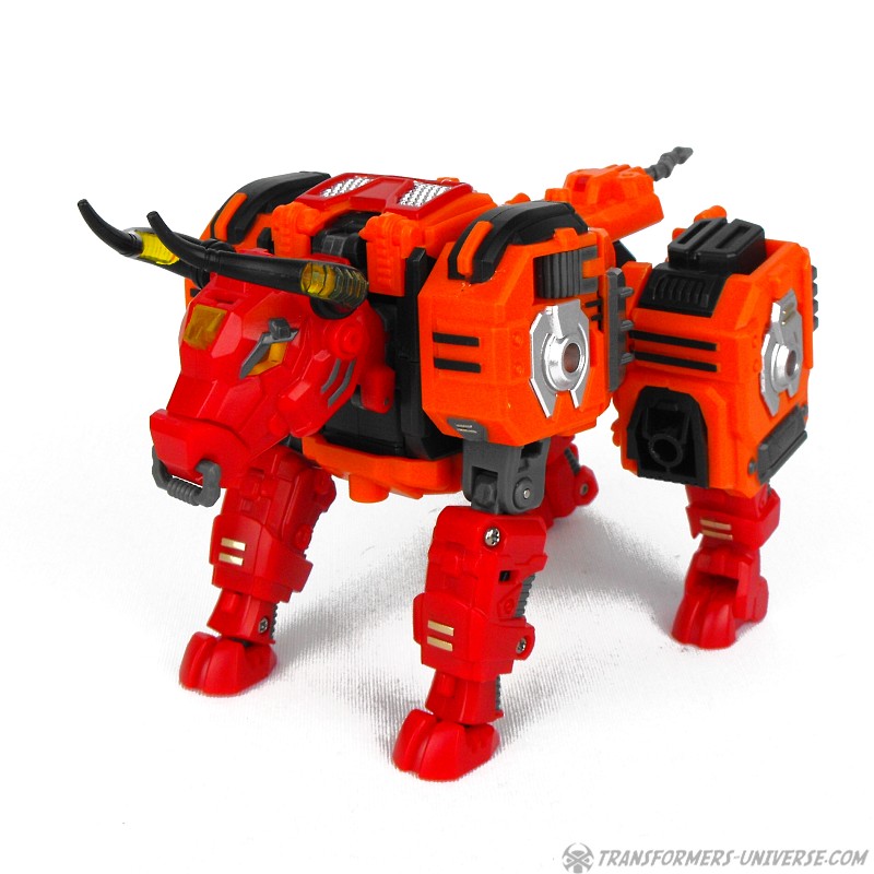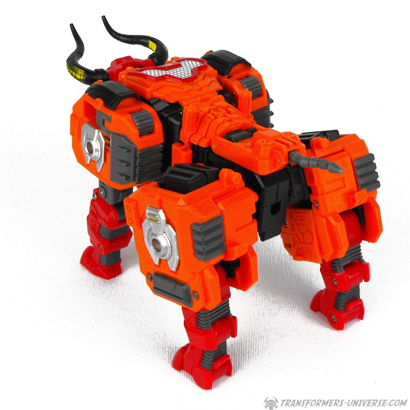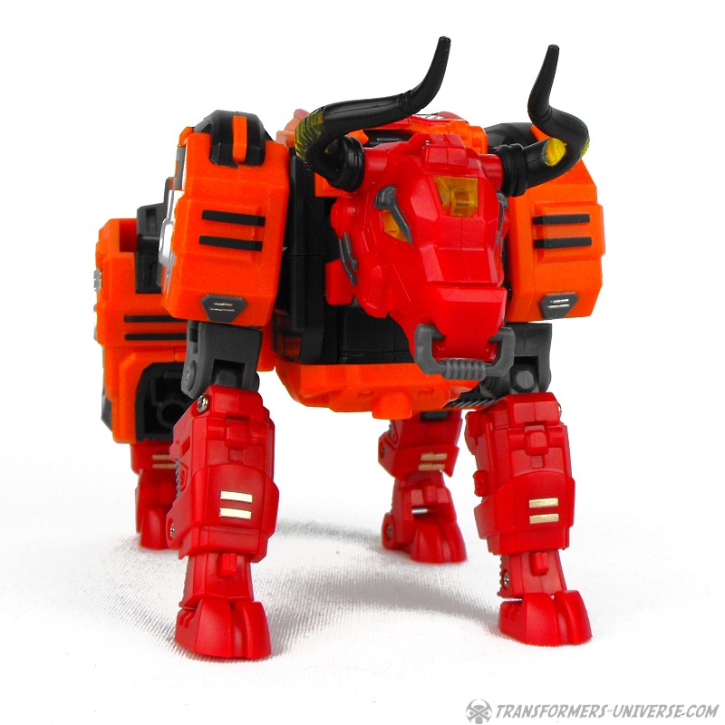 Alternativmodus: Wie schon sein G1 Vorgänger verwandelt sich Aethon auch in einen mechanischen Wasserbüffel (lat. Bubalus Arnee). Hier ist die Ähnlichkeit zwischen TFC und G1 Figur deutlich ausgeprägter, da sie zum gleichen Tier werden und die Farben hier deutlich näher aneinander liegen. Hier also klar der gleiche Charakter. Aethon ist auch in diesem Modus gut beweglich. Alle vier Beine sind gelenkig, ebenso oder Kopf mit dem sich öffnenden Mund und wer Lust hat kann noch seinen Nasenring bewegen (wem’s Spaß macht).