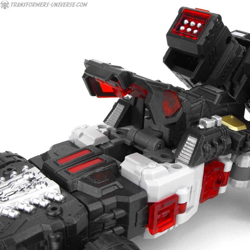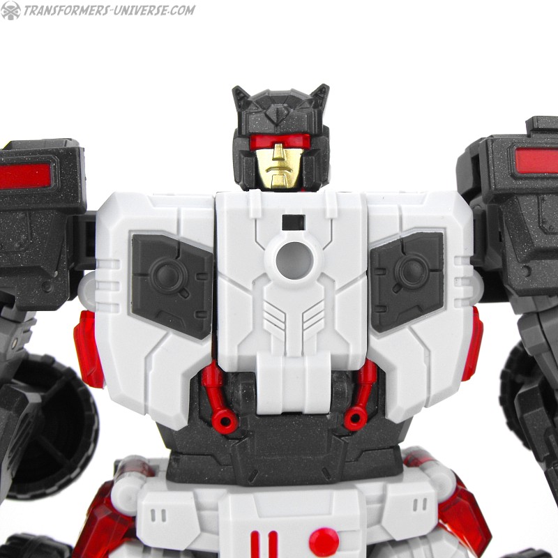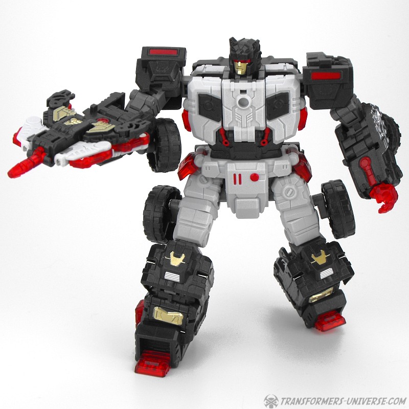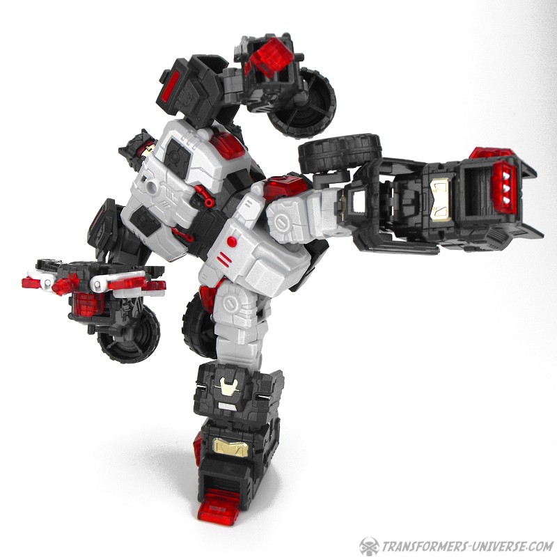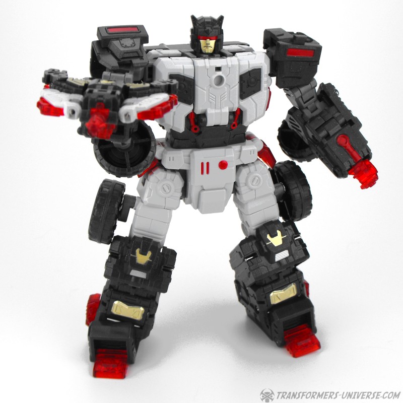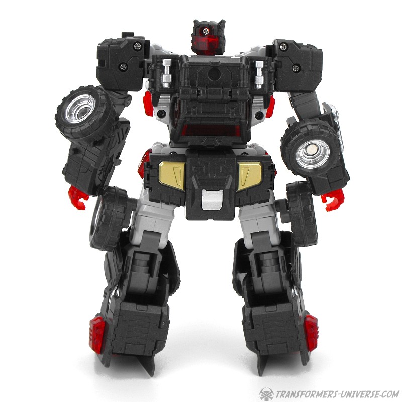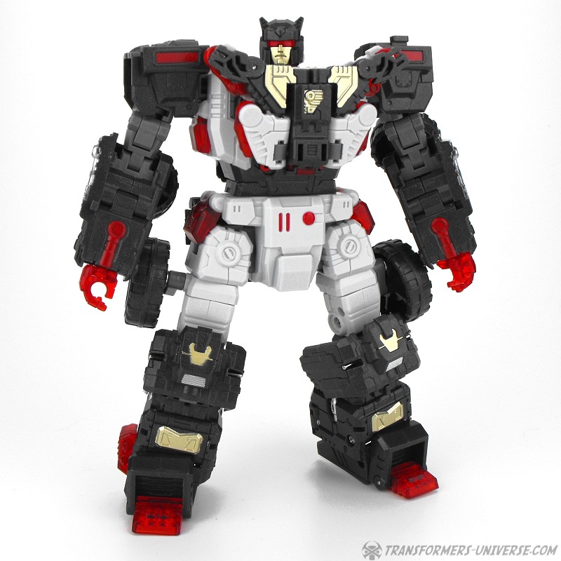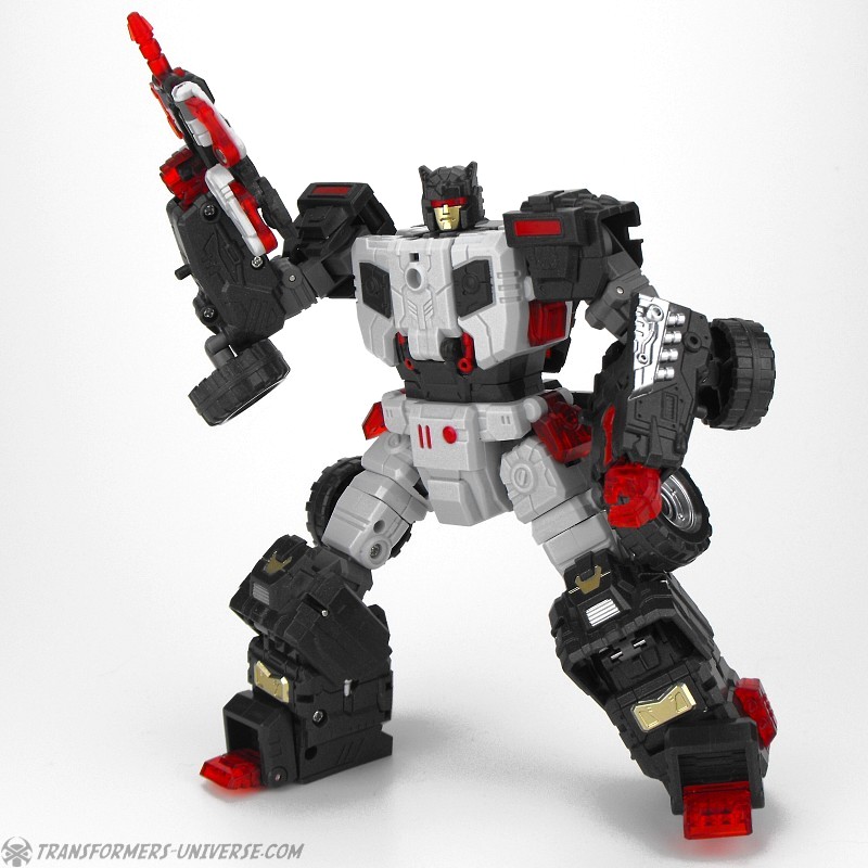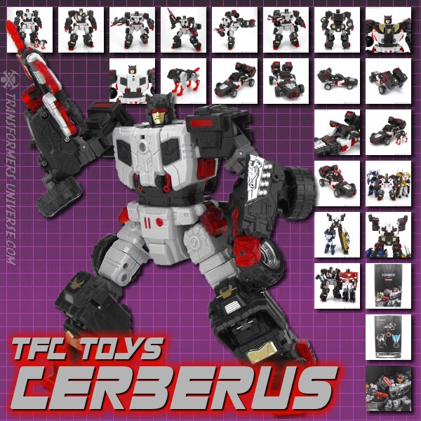 Robotermodus: Cerberus ist ein schwarz-weißer (also eigentlich dunkel-/hellgrauer), sehr stämmiger Roboter. Außer den Rädern an seinen Hüften weißt erstmal nichts darauf hin, in was er sich verwandelt, da die fahrzeugspezifischen Teile sonst alle am Rücken sind. Seine Stämmigkeit resultiert natürlich daraus, dass er der Unterleib des Hades Combiners wird, was bedeutet seine Hüfte ist auch die des deutlich größeren Hades. Und wenn euch die Beine an die von TFC Blackbird (alias Silverbolt) erinnern, nun, sie sind auch beinahe identisch.