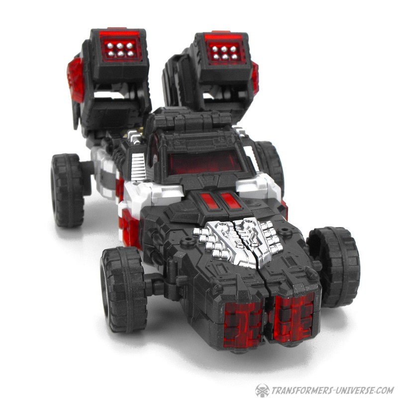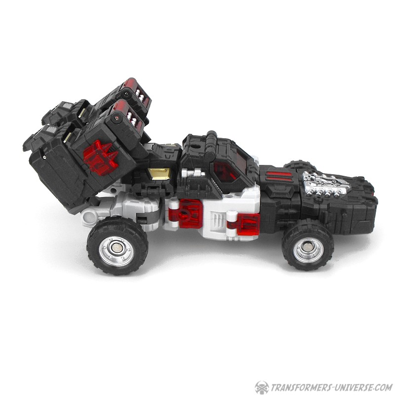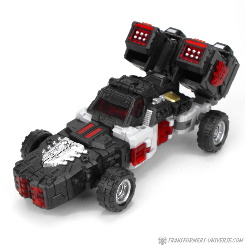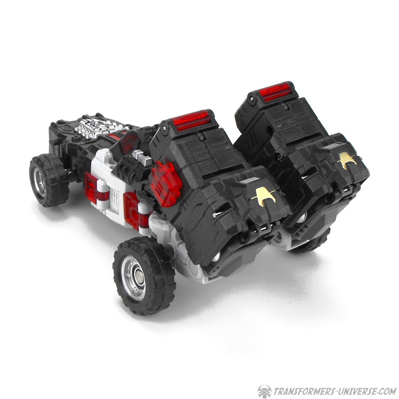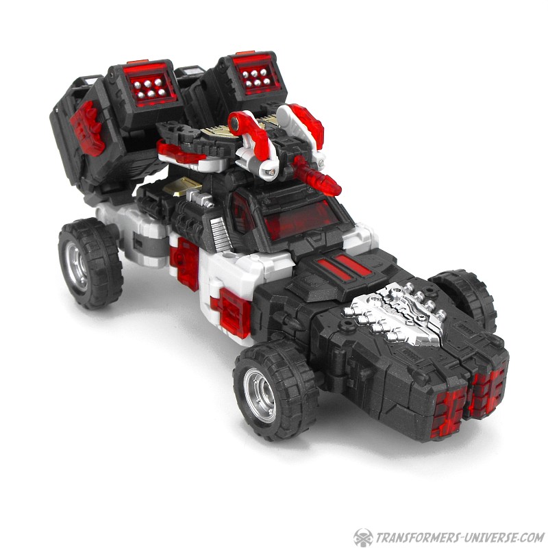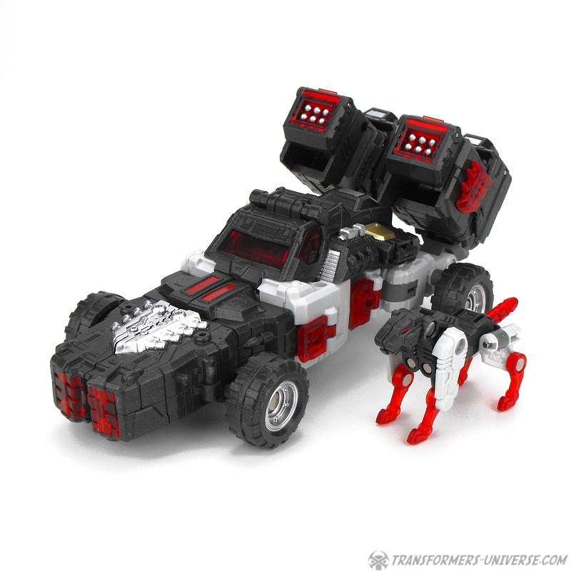 Alternativmodus: Cerberus verwandelt sich in einen dunkelgrauen Rennbuggy im Baja-Stil, inklusive dachmontierte (nicht-feuernde) Raketenwerfer. Im Prinzip ist es der Roboter auf dem Bauch liegend, die Arme nach oben gestreckt um die Motorhaube zu formen und die Beine eingeklappt als Raketenwerfer. Der resultierende Buggy sieht jetzt nicht unbedingt hyperrealistisch aus, ist aber klar als das erkennbar, was er sein soll, und es gibt keine sichtbaren Roboterteile. Na ja, okay, wenn man die Tatsache ignoriert, das der Raketenwerfer von der Seite gesehen schon einem Paar Beine ähnelt. Aber gut, der Fahrzeugmodus ist okay. In keinster Weise spektakulär, aber er tut seinen Job.