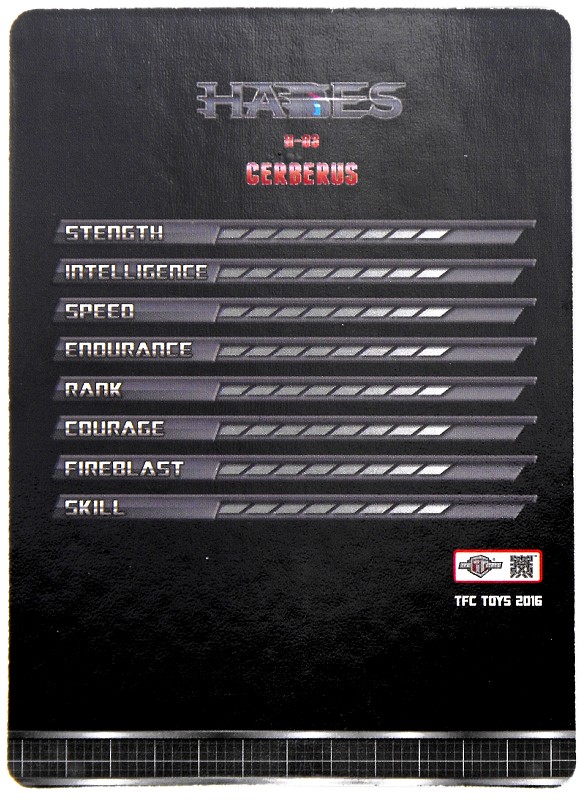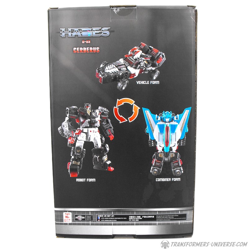 Vorwort: Das Rechtliche wie immer vorweg. Cerberus ist keine Figur von Hasbro oder Takara-Tomy und somit kein offizieller Transformer. Er stammt vom Drittanbieter TFC Toys und soll natürlich Jarugar von der Breastforce darstellen, darf aber aus rechtlichen Gründen nicht so heißen. Stattdessen hat auch er einen Namen aus den griechischen Mythen, nämlich Cerberus, der dreiköpfige Höllenhund, der den Eingang in den Hades bewacht (jeder denke sich seinen Teil dazu, dass Cerberus hier den Unterleib des Hades Combiners darstellt).