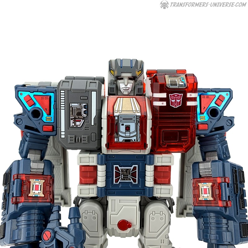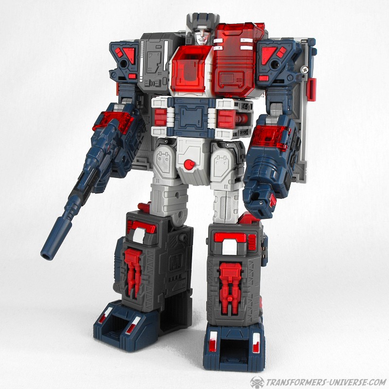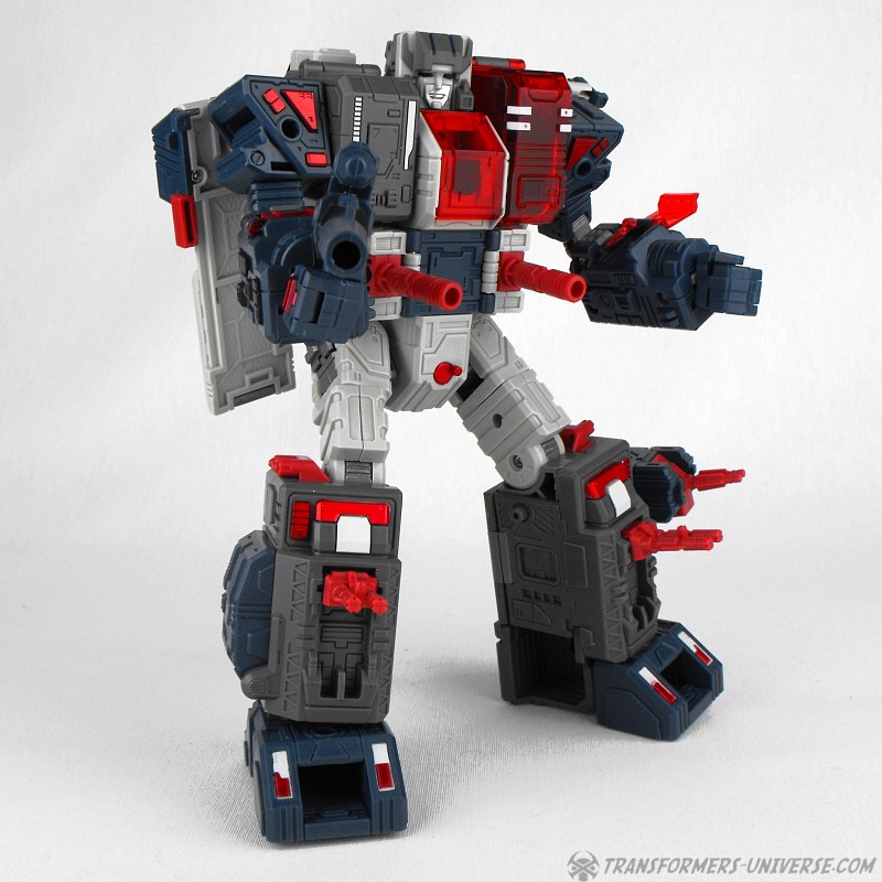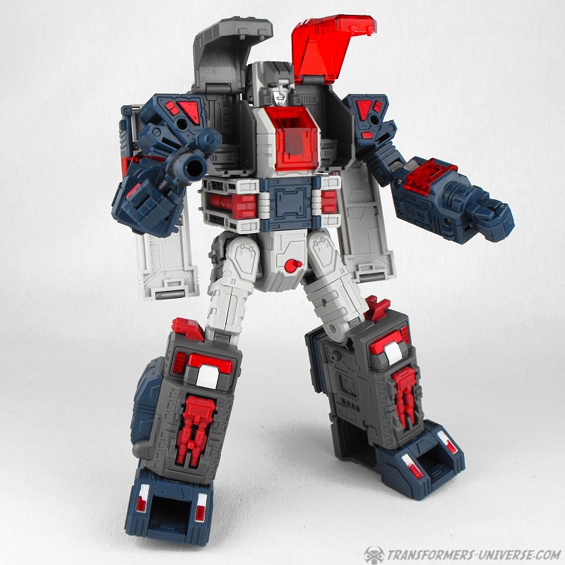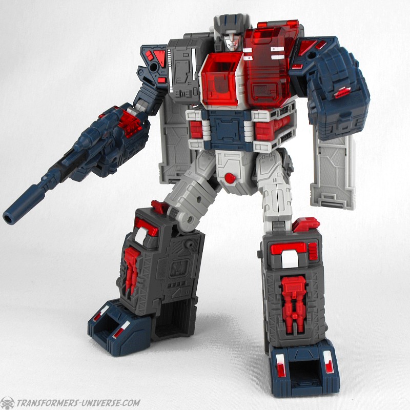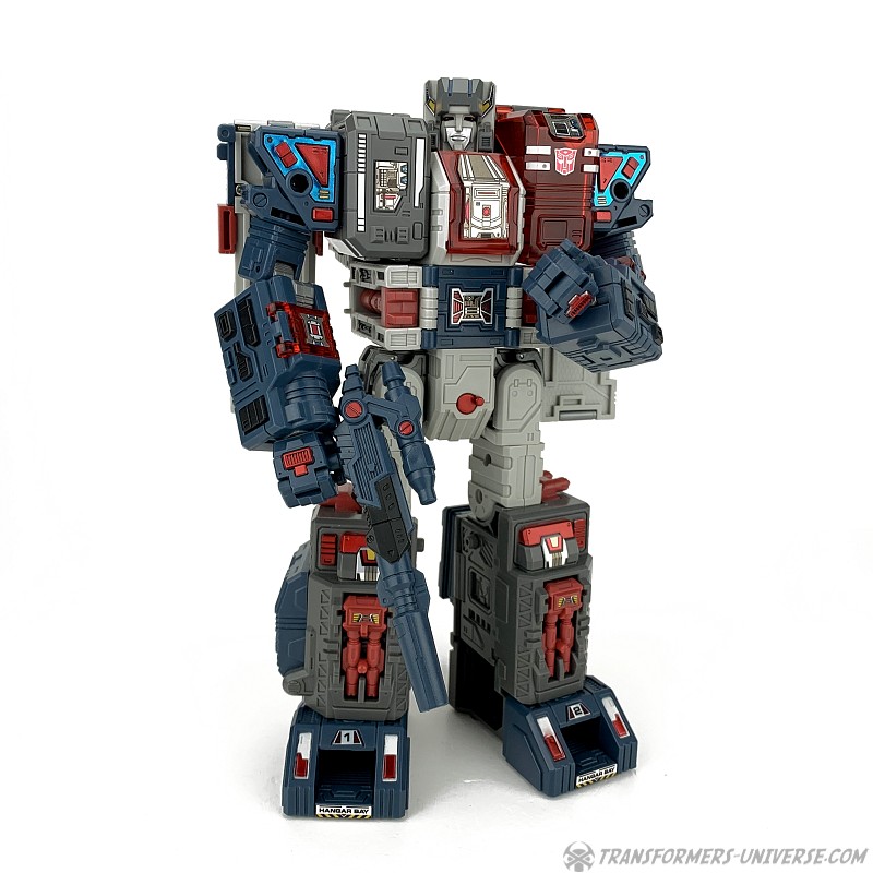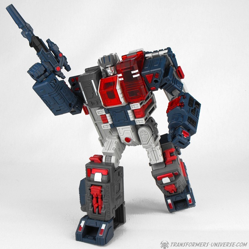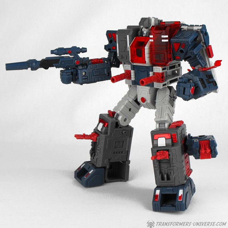 Robotermodus: Es ist wohl unvermeidbar dass diese Rezension hier mehrfach die originale Fortress Maximus Figur von Hasbro, sowie auch Warden von Perfect Effect, der ebenfalls Fortress Maximus darstellt, referenzieren wird. Fangen wir mit dem Offensichtlichen an: Infinitor ist im Prinzip G1 Fortress Maximus, nur geschrumpft auf ungefähr Ultra-Klasse Größe und mit deutlich besserer Beweglichkeit. Er hat fast alle Gimmicks, die auch der größere Maximus hatte, übernommen, inklusive der berühmten Beinkanonen (die Warden nur über ein Upgrade Kit bekommt). Und wo wir schon von Waffen reden, Infinitor hat noch einige mehr davon. Zwei große Geschütze klappen an der Hüfte aus, er hat Kanonen in den Unterarmen, eine separate Waffenplattform am linken Bein und natürlich sein blaues Gewehr.