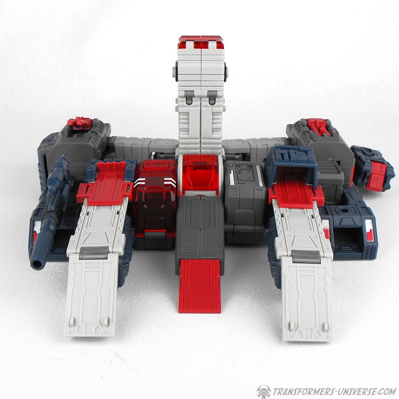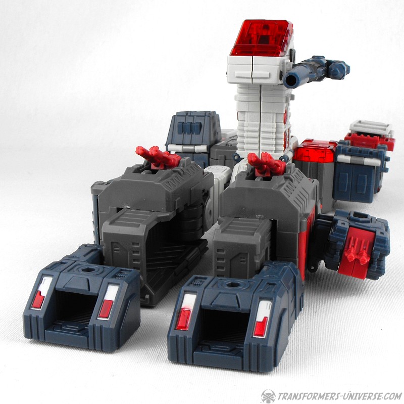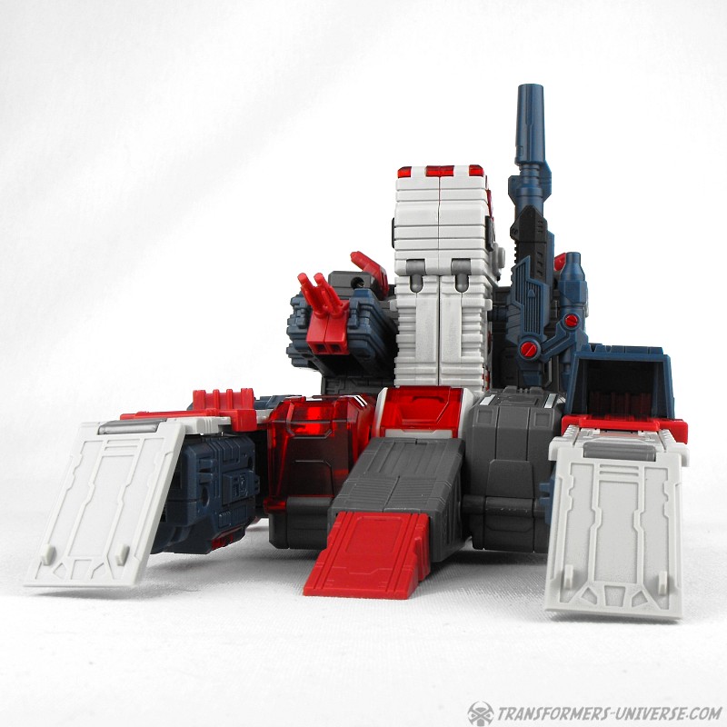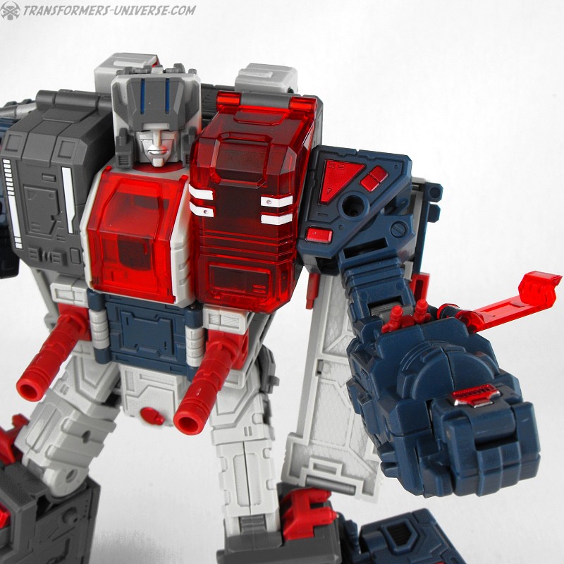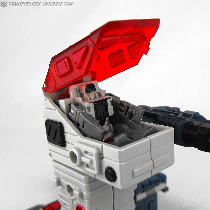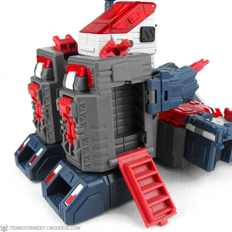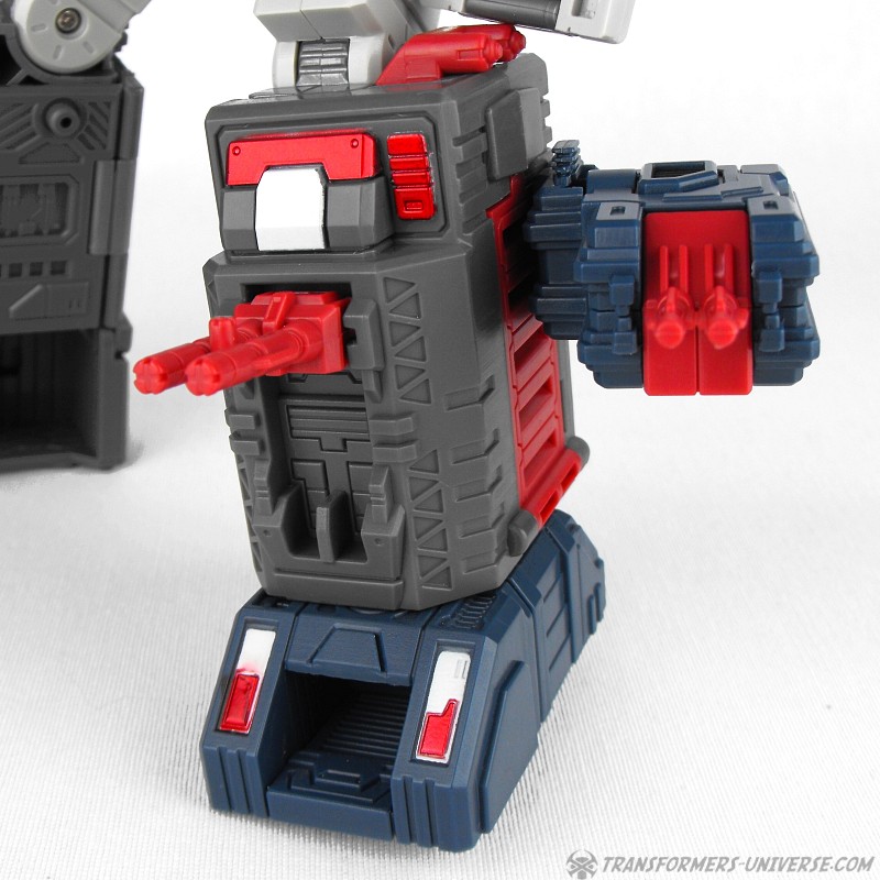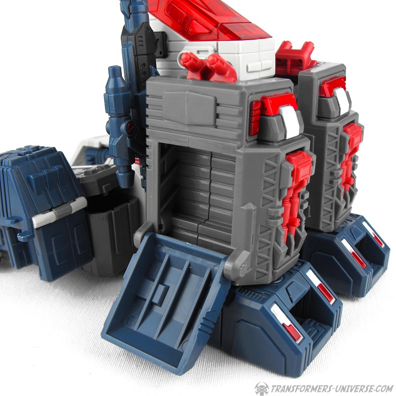 Ein paar Unterschiede zu Fortress Maximus gibt es natürlich. Infinitor fehlen die zusätzlichen Waffenläufe, die Fort Max auf dem Handrücken hatte, wobei das größentechnisch hier denke ich schwer geworden wäre. Auch der obere Torso ist ein wenig anders gestaltet. Genau wie Fort Max hat auch Infinitor hier zwei sich öffnende Klappen als ‚Brüste‘, sie sehen aber anders aus. Die Rampen an den Armen sind nicht festgeklemmt, sondern sitzen an einem beweglichen Gelenk, so dass man sie frei nach Schnauze wegdrehen oder –klappen kann. Infinitor hat im Schritt zwar auch diesen kleinen roten Drehhebel, den Fort Max da hat, allerdings ist er hier nur Verzierung und nicht zum Rotieren einer Radarschüssel gedacht. Und dann ist da natürlich noch die deutlich überlegene Beweglichkeit. Fort Max war zwar nicht so unbeweglich wie andere G1 Figuren, ein Verrenkungskünstler war er aber sicherlich nicht. Infinitor kann hingegen frei posieren und hat sogar bewegliche Füße, um in jeder Pose einen festen Stand zu gewährleisten. Hier also keinerlei Beschwerden.