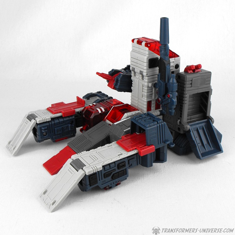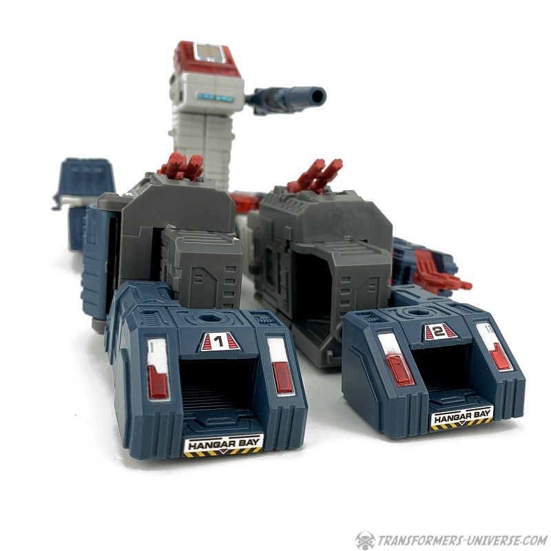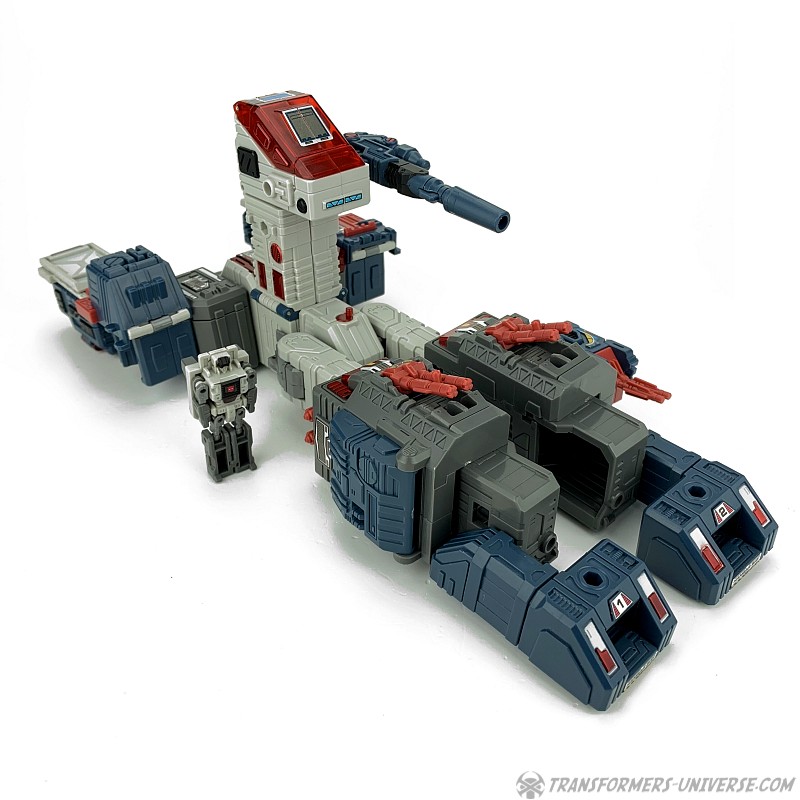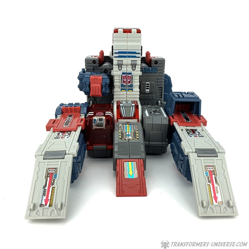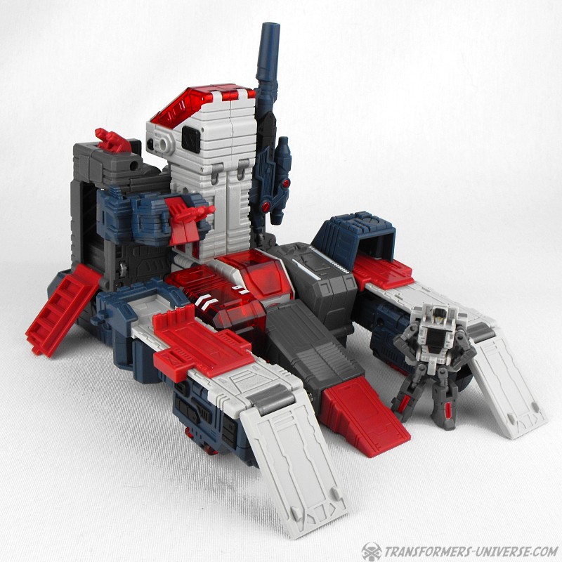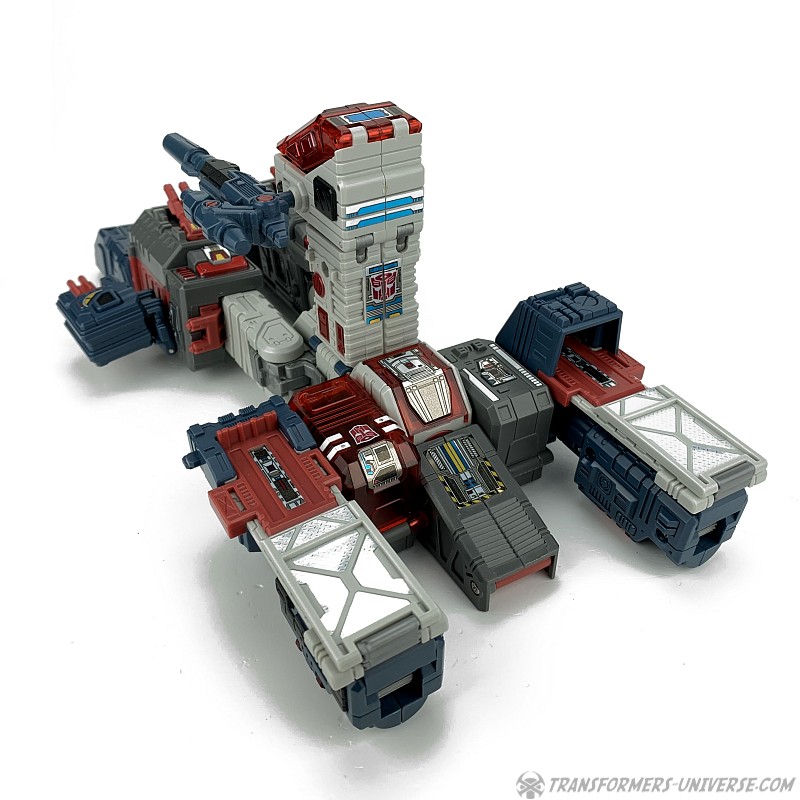 Weiter mit dem Citymodus. Fortress Maximus hat meiner Meinung nach den mit Abstand besten Citymodus aller Transformer überhaupt. Infinitor setzt diesen vorbildgetreu in kleinerem Maßstab um. Natürlich gehen dabei einige der Gimmicks verloren, die in Fortress‘ gigantisches Volumen reingepasst haben. Die Laderampen links und rechts in den Roboterbeinen klappen auf, aber in der einen fehlt das rote Gitter, das es zur Gefängniszelle gemacht hat. Es gibt keinen internen Lift, der ein Auto zur Abschussrampe hochfahren könnte, einfach eine Sache der Größe. Und es gibt auch keinen Platz um Cerebros als Kommunikationsmodul anzubringen, einfach weil es keinen Cerebros gibt. Ansonsten aber ist alles da, was man von Maximus kennt und liebt, einfach ein fantastischer Citymodus in kleinerem Maßstab, sehr schön gemacht.