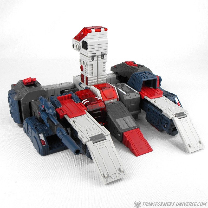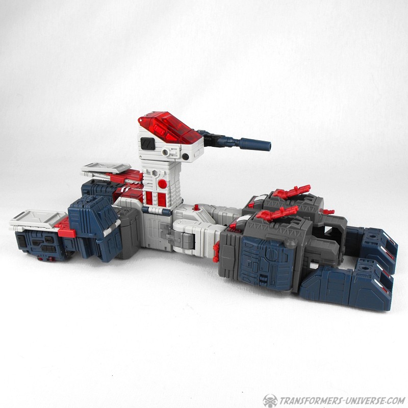 Alternativmodi: Der originale Fortress Maximus war ein Triple Changer mit einem City- / Basismodus und einem Raumschiffmodus. Und natürlich hat Infinitor die gleichen Alternativmodi, nur eben kleiner und mit ein paar kleinen Unterschieden. Fangen wir mit dem Raumschiff an, welches im Prinzip der auf dem Rücken liegende Roboter ist, mit dem Kontrollturm hochgeklappt und den Armen über den (fehlenden) Kopf hinweg ausgestreckt. Früher mochte ich diesen Modus ja gar nicht, muss ich sagen, aber inzwischen finde ich ihn eigentlich nicht schlecht. Ist halt ein Cybertronisches Raumschiff, das größtenteils wie ein Roboter aussieht, ja, aber mir gefällt’s. Die Beine strecken nach vorne aus mit den Bein-Kanonen hochgeklappt, der Headmaster kann im Cockpit des Kontrollturms platznehmen und das große Gewehr kann rechts wie links am Turm befestigt werden. Fertig ist das Schiff. Übrigens, diese Klammern an Infinitors Hüfte dienen dazu, die Beine für diesen Modus hier zu stabilisieren. Nicht unbedingt notwenidg, aber ein gutes Detail.
