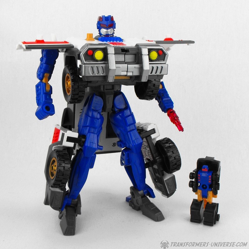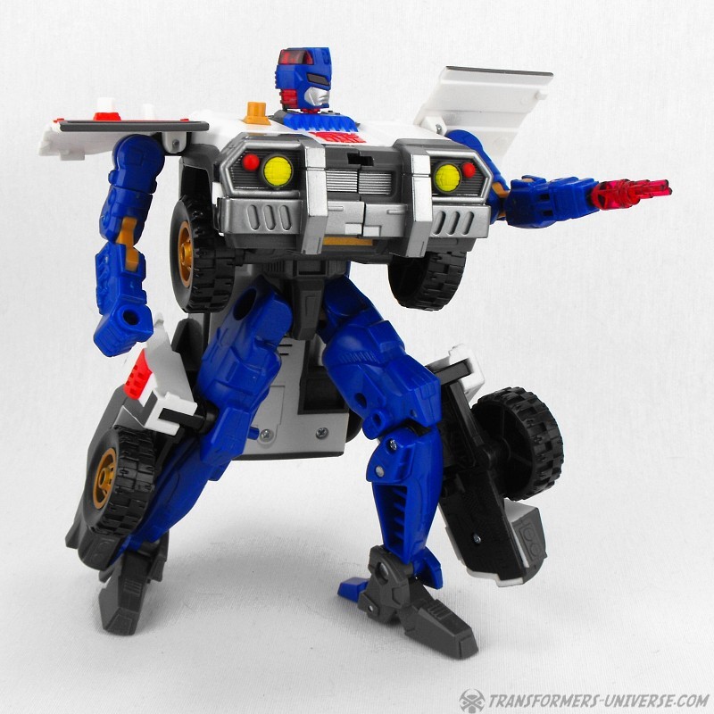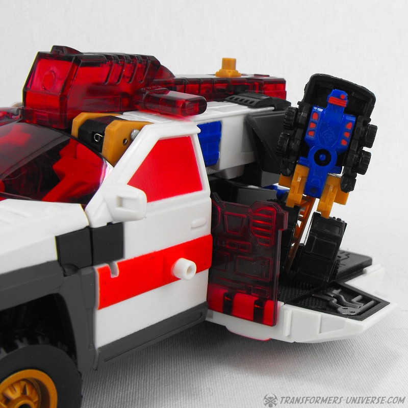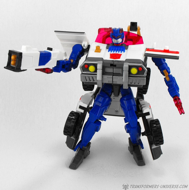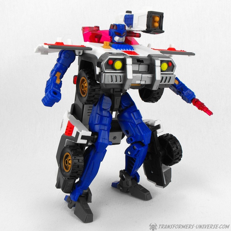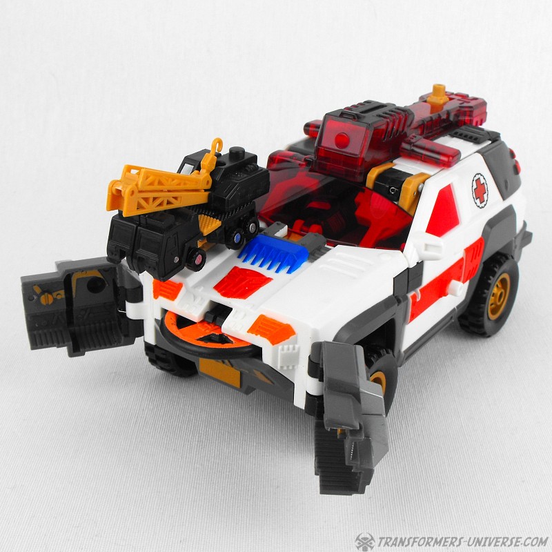 Fahrzeug Modus: Red Alert verwandelt sich in einen Geländewagen mit Feuerwehr-Look und gibt dabei eine gute Figur ab. Fast alle seine Gimmicks aus dem Robotermodus können auch hier Anwendung finden, was seinen Spielspaß stark erhöht. Das Auto hätte vielleicht etwas realistischer gestaltet werden können, aber ansonsten habe ich nichts auszusetzen.