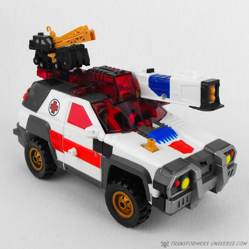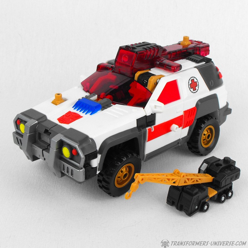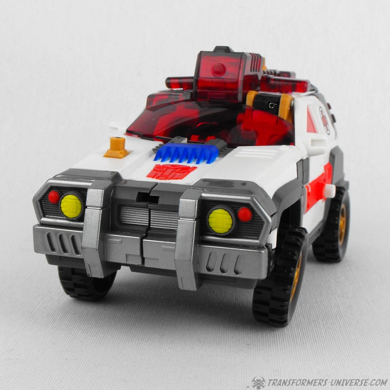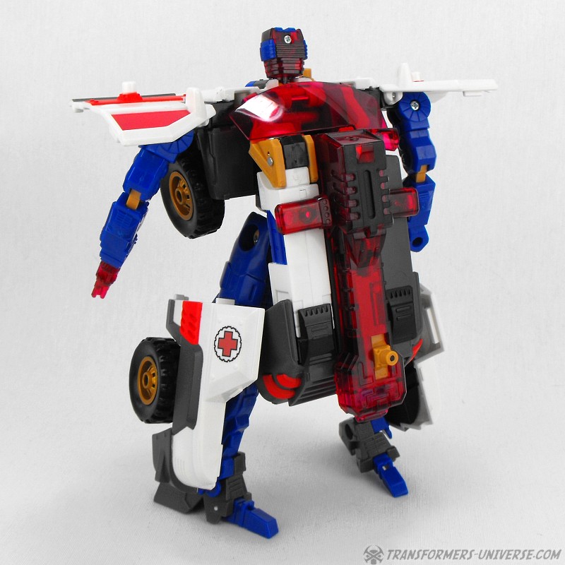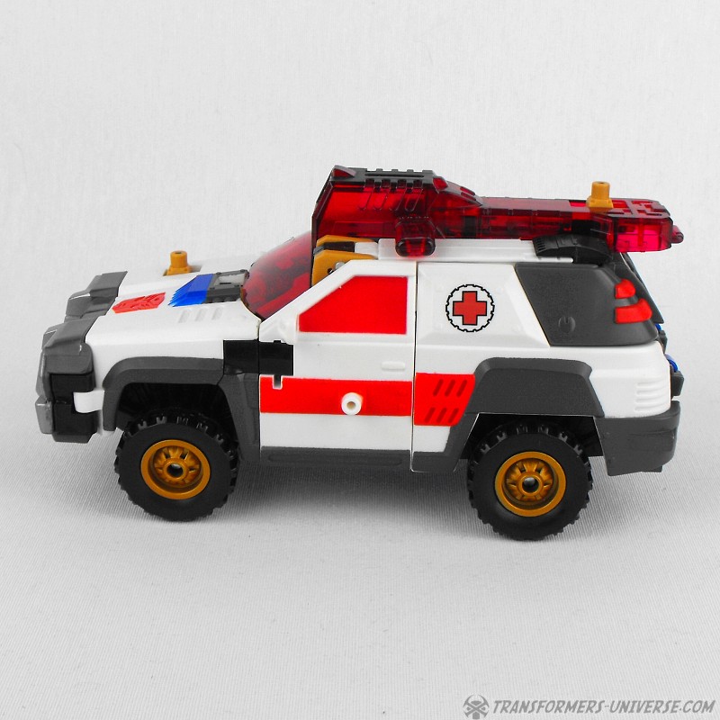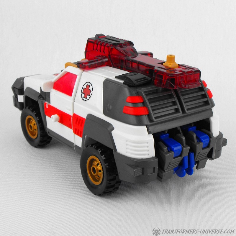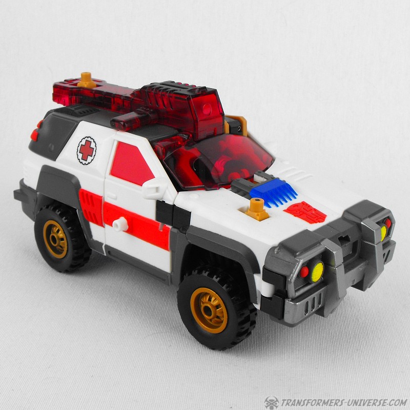 Roboter Modus: Red Alert ist ein großer Roboter mit einem leicht deformierten Look. Seine kastenförmige Brust kombiniert mit seinen dürren Beinen lassen ihn etwas seltsam aussehen. Er ist jedoch überraschend beweglich und vielseitig. Sein Robotermodus bietet zahlreiche Gimmicks, so z.B. austauschbare Hände, die seine Funktion als Arzt unterstreichen. Ein Raketenwerfer kann auf seine Schulter ausgeklappt oder als Handwaffe benutzt werden. In der Brust verbirgt sich ein Diskuswerfer. Sein Look ist klassisch angehaucht und macht ihn zu einem rundum anständigen Roboter.