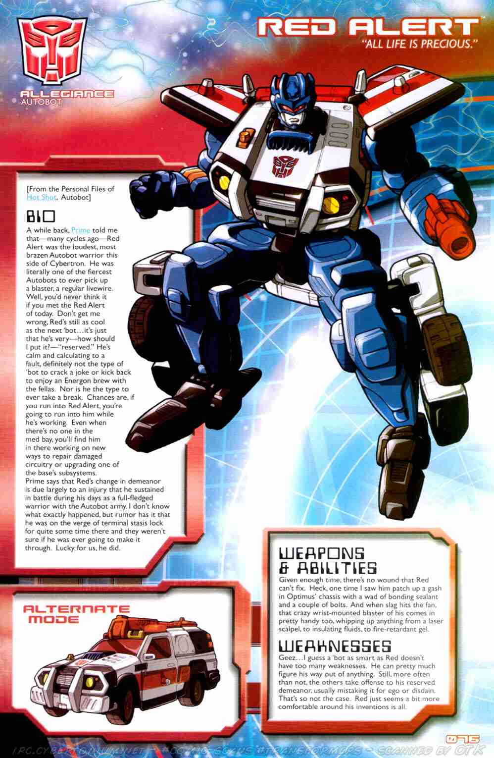 Red Alert ist ein geschätzter Arzt und Wissenschaftler, der das Leben vieler Autobots gerettet hat. Sein Streben Leben zu retten hat ihn neue Wege finden lassen beschädigte Schaltkreise zu reparieren. Schon oft hat er sein Leben riskiert um verwundete Kameraden zu bergen. Der alte Freund von Optimus Prime war früher ein wilder und heldenhafter Krieger, bis er selbst schwer verwundet wurde und den Wert des Lebens zu schätzen begann. Wird dieser neue Krieg sein Kriegerherz wieder erwecken?