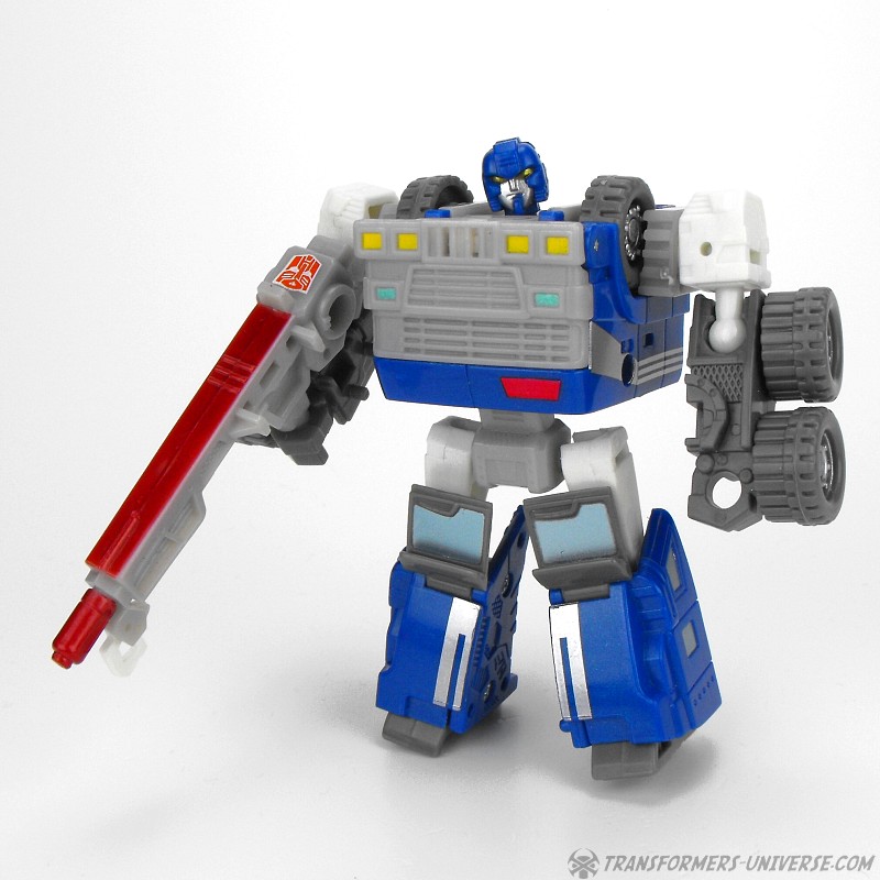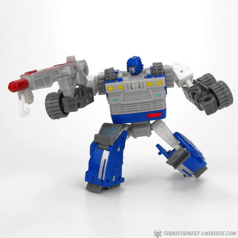 Robotermodus: Armorhide ist ein kleiner, beweglicher Roboter, der aber irgendwie langweilig aussieht. Der Kühlergrill des Trucks bildet seine Brust, was nicht viel Platz für Detaillierung lässt. Mir gefällt aber sein Gesicht, es lässt ihn irgendwie beinhart aussehen. Als Waffe trägt er den Abschleppkran aus seinem Fahrzeugmodus. Außerdem kann der Cyberschlüssel den Kühlergrill hochklappen, worunter ein riesiger Raketenwerfer zum Vorschein kommt, der fast seinen gesamten Oberkörper einnimmt. Ein wenig übertrieben, aber irgendwie cool. Alles in allem ein anständiger Robotermodus.