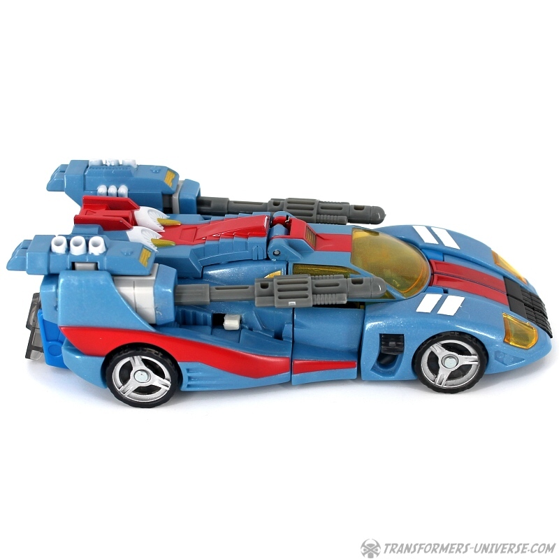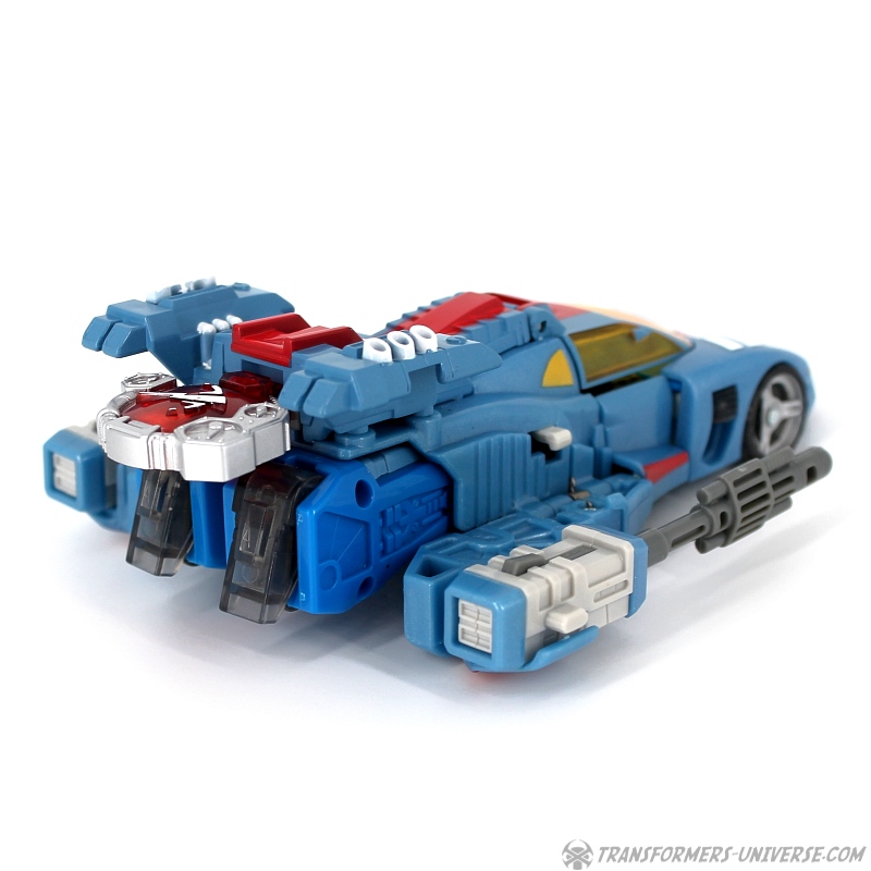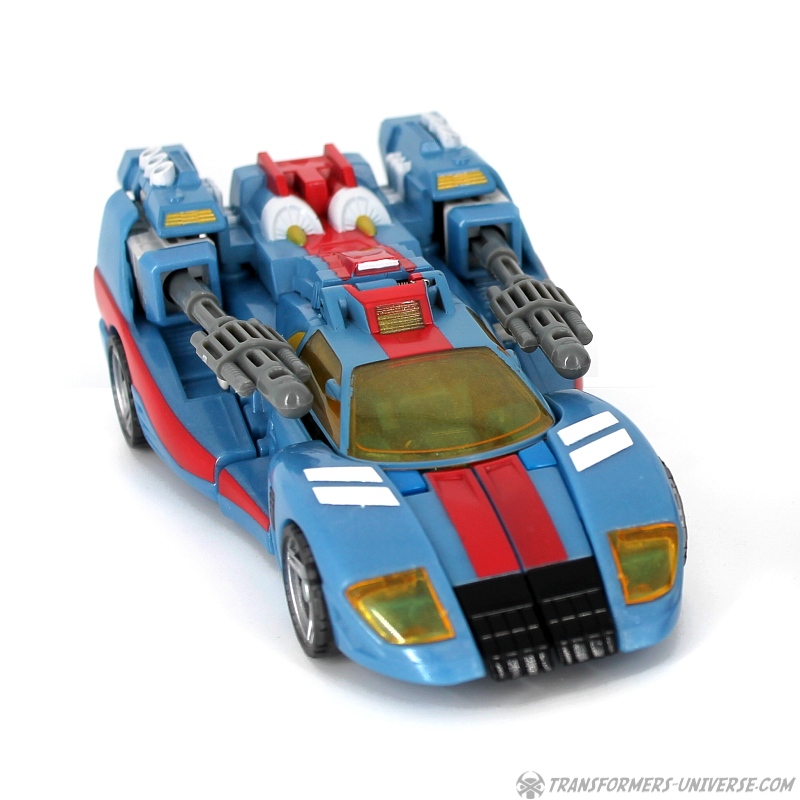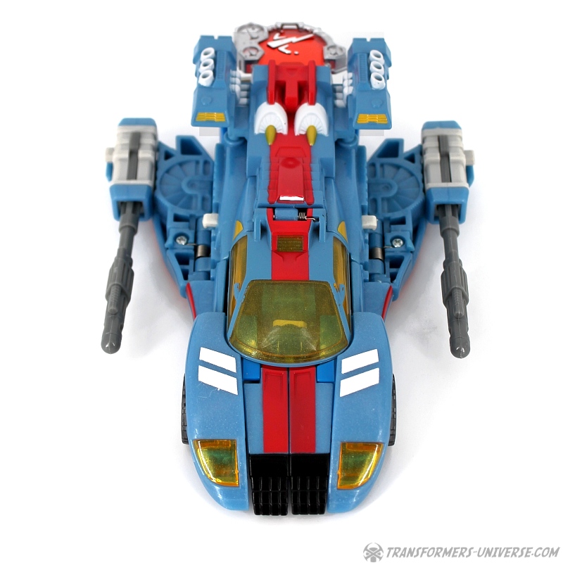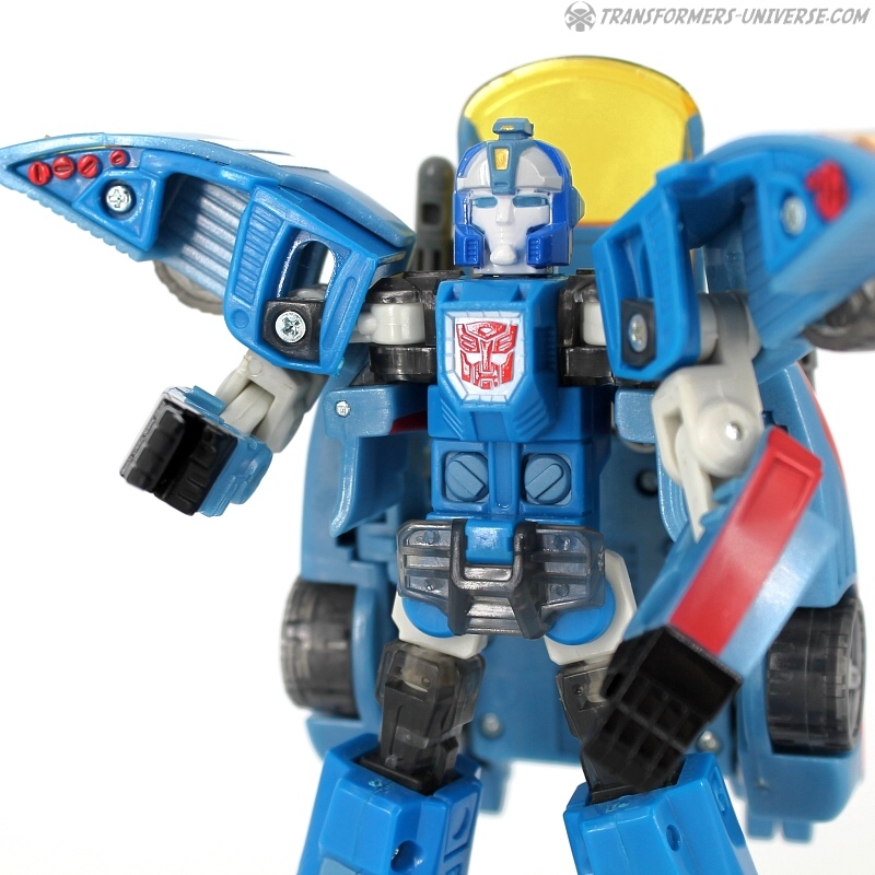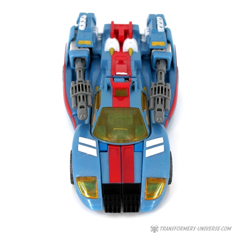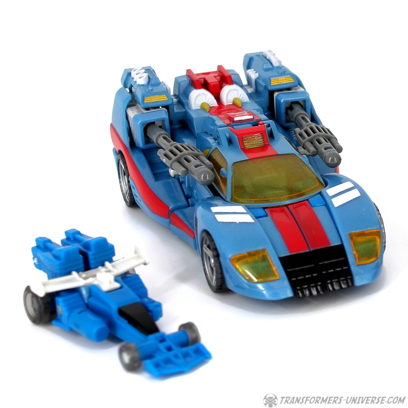 Bemerkungen: Galaxy Force Blurr, der beinahe komplett identisch mit seinem Hasbro Gegenstück Cybertron Blurr ist, ist ein Retool von Armada Blurr, den ich bereits rezensiert habe. Blurr wurde neu designt, damit sein Gimmick jetzt mit einem Cyberkey funktioniert anstatt mit einem Mini-Con. Außerdem gab's einen komplett neuen Kopf, basierend auf G1 Blurr. Seine Raketenwerfer wurden ebenfalls neu designt, inklusive neuer Griffe und jetzt ohne Mini-Con Pegs. In Japan gab es diese Figur nur im Doppelpack mit Galaxy Force Buzzsaw, während die Hasbro Version einzeln verkauft wurde. Der einzige Unterschied zwischen der Hasbro und der Takara Version ist der Cyberkey Code, der auf der Rückseite des Cyberschlüssels der Hasbro Version ist.