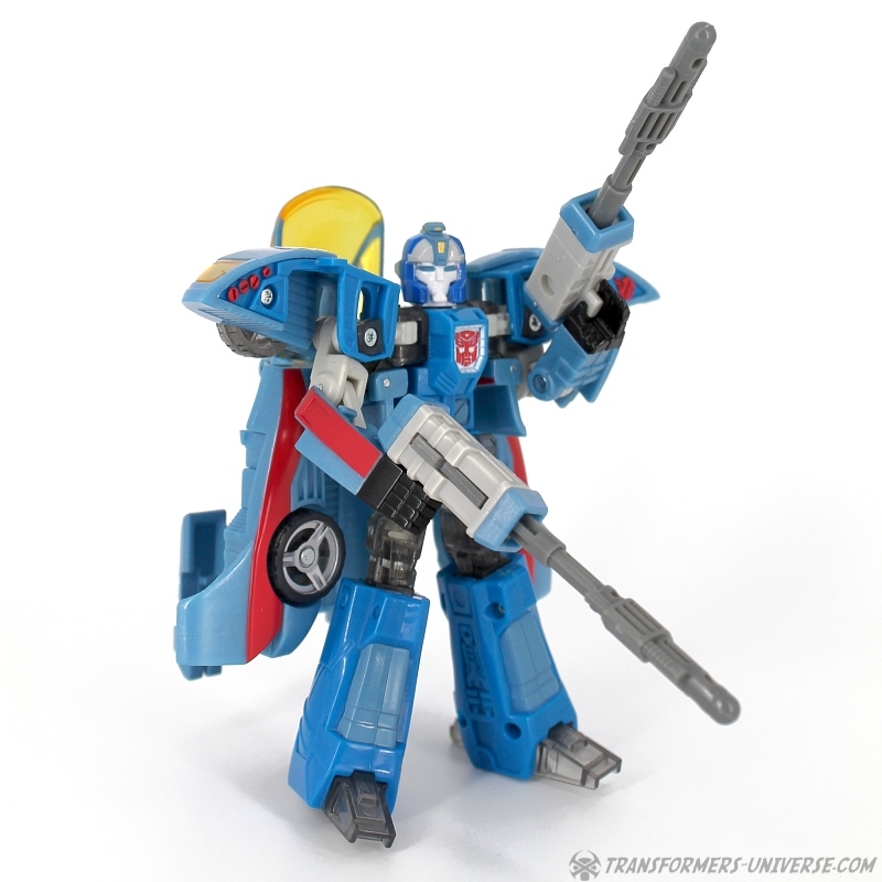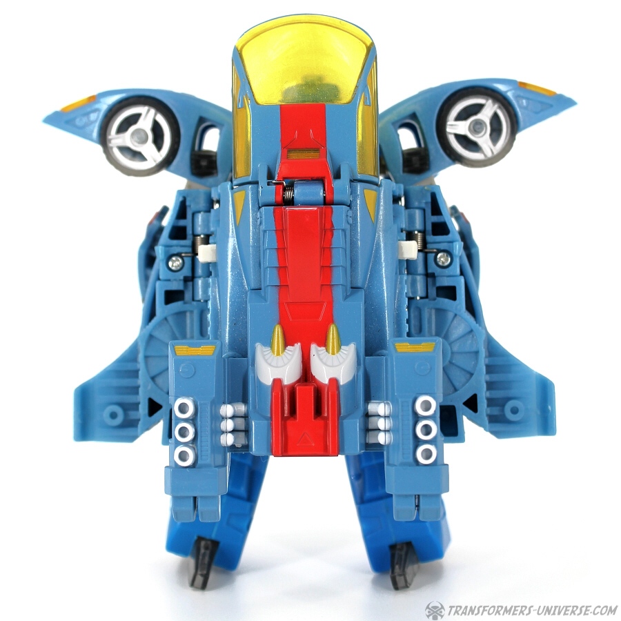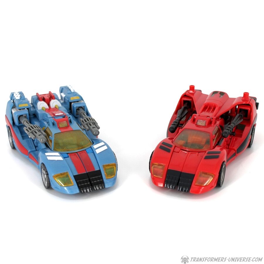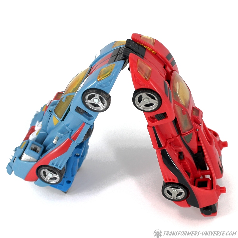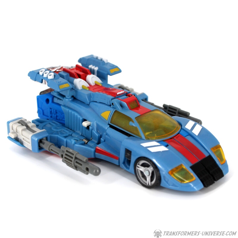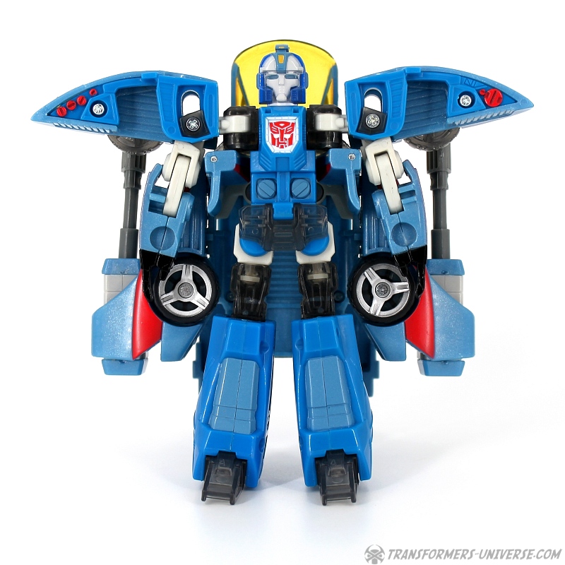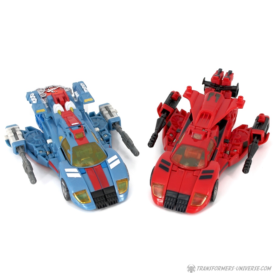 Bemerkungen: Galaxy Force Blurr, der beinahe komplett identisch mit seinem Hasbro Gegenstück Cybertron Blurr ist, ist ein Retool von Armada Blurr, den ich bereits rezensiert habe. Blurr wurde neu designt, damit sein Gimmick jetzt mit einem Cyberkey funktioniert anstatt mit einem Mini-Con. Außerdem gab's einen komplett neuen Kopf, basierend auf G1 Blurr. Seine Raketenwerfer wurden ebenfalls neu designt, inklusive neuer Griffe und jetzt ohne Mini-Con Pegs. In Japan gab es diese Figur nur im Doppelpack mit Galaxy Force Buzzsaw, während die Hasbro Version einzeln verkauft wurde. Der einzige Unterschied zwischen der Hasbro und der Takara Version ist der Cyberkey Code, der auf der Rückseite des Cyberschlüssels der Hasbro Version ist.