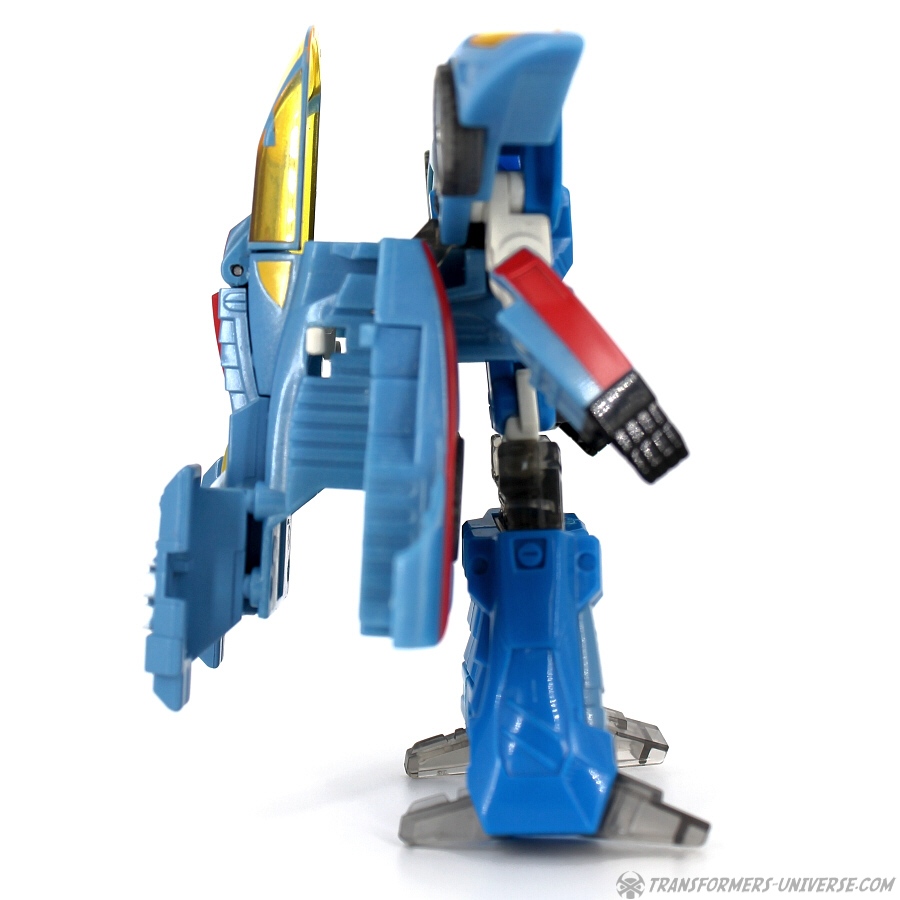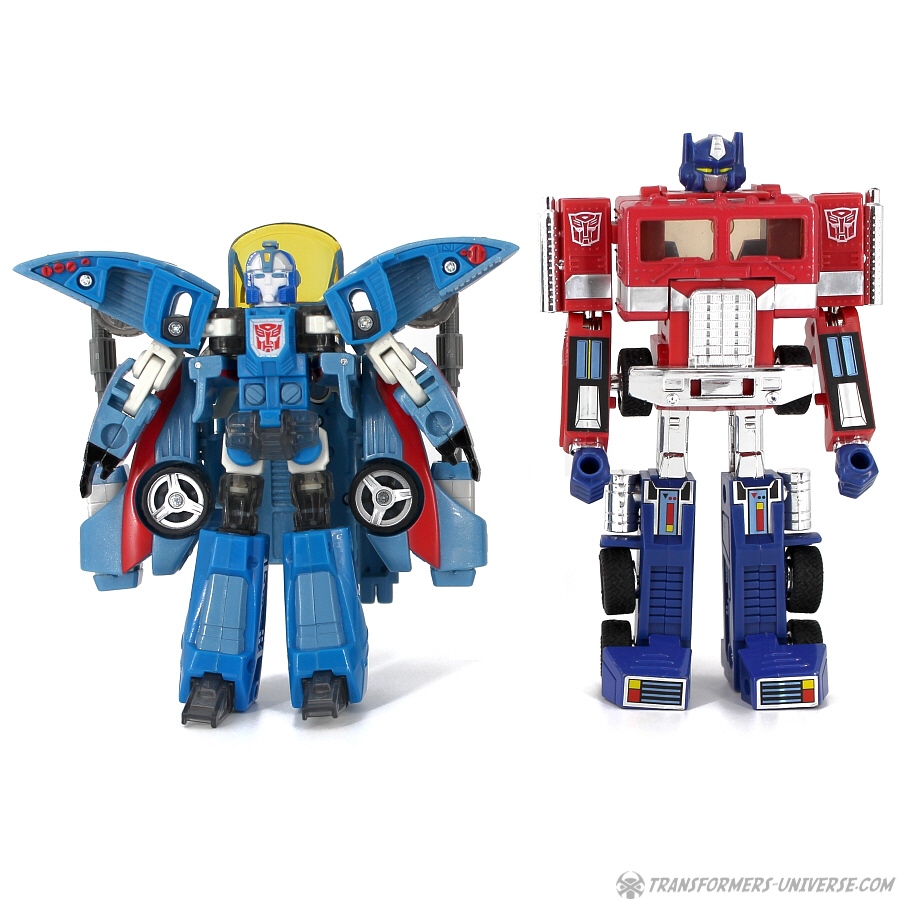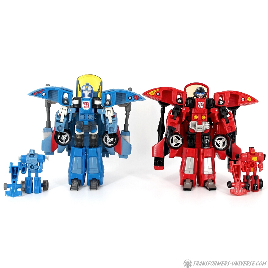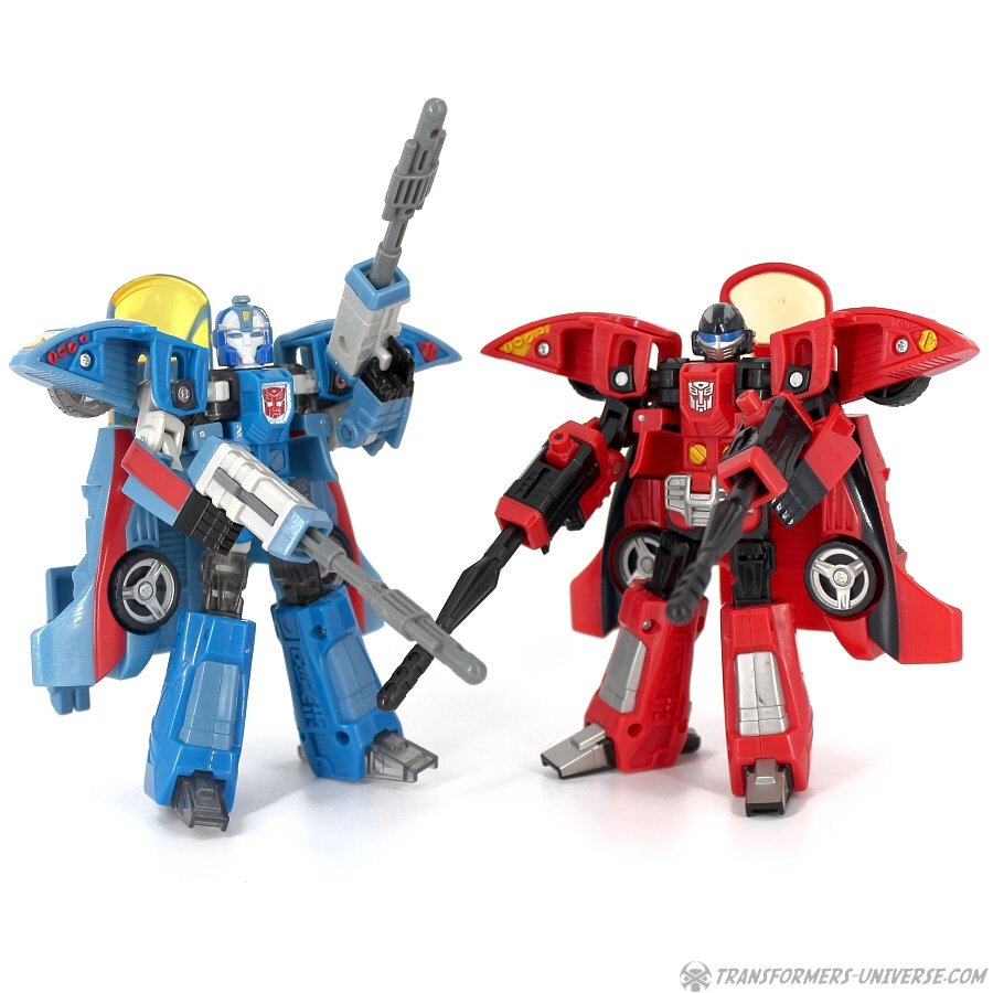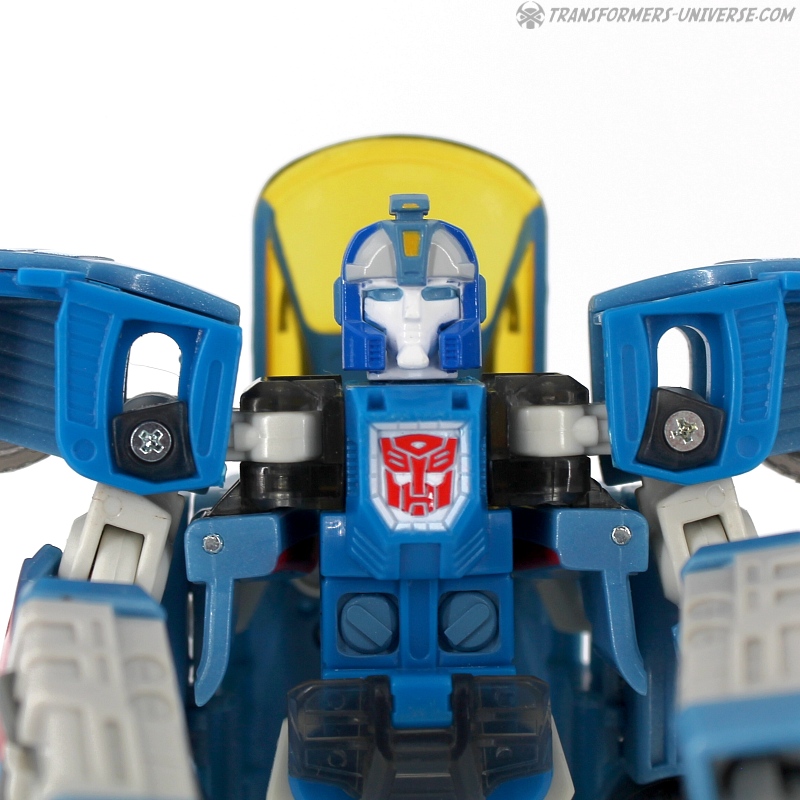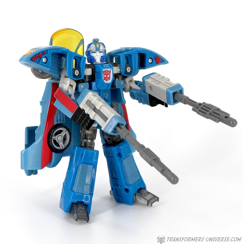 Bemerkungen: Galaxy Force Blurr, der beinahe komplett identisch mit seinem Hasbro Gegenstück Cybertron Blurr ist, ist ein Retool von Armada Blurr, den ich bereits rezensiert habe. Blurr wurde neu designt, damit sein Gimmick jetzt mit einem Cyberkey funktioniert anstatt mit einem Mini-Con. Außerdem gab's einen komplett neuen Kopf, basierend auf G1 Blurr. Seine Raketenwerfer wurden ebenfalls neu designt, inklusive neuer Griffe und jetzt ohne Mini-Con Pegs. In Japan gab es diese Figur nur im Doppelpack mit Galaxy Force Buzzsaw, während die Hasbro Version einzeln verkauft wurde. Der einzige Unterschied zwischen der Hasbro und der Takara Version ist der Cyberkey Code, der auf der Rückseite des Cyberschlüssels der Hasbro Version ist.