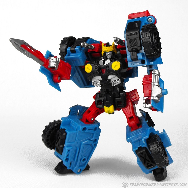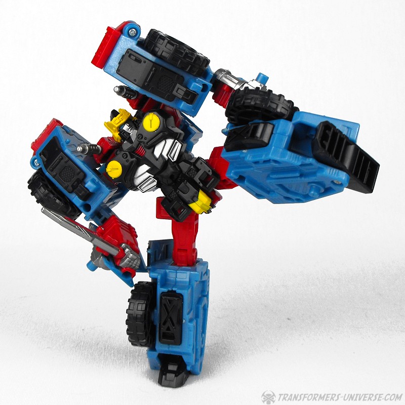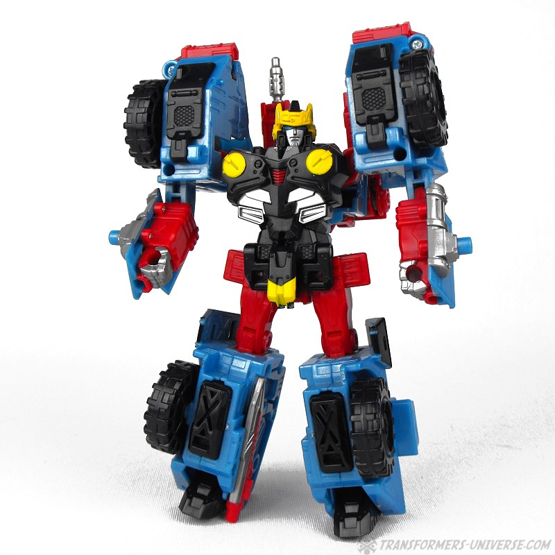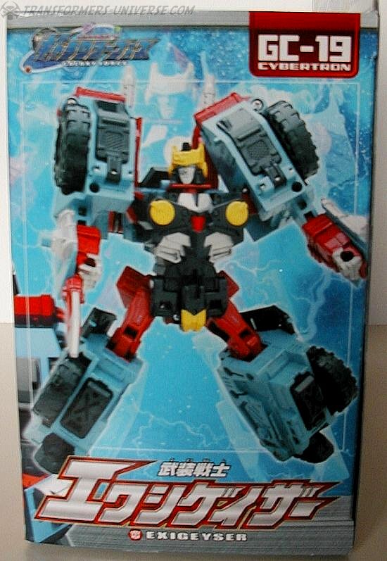 Roboter Modus: Exigeyser ist ein beweglicher Roboter mit coolem Look und jeder Menge Feuerkraft. Im normalen Modus kann er sein am Bein verstautes Messer für den Nahkampf nutzen oder die Geschütze auf seinen Schultern ausklappen. Setzt man seinen Force Chip ein klappen die Geschütze auf, so dass Raketenwerfer zum Vorschein kommen. Ebenso enthalten seine Schultern und Beine weitere Raketenwerfer, was ihm jede Menge Feuerkraft gibt. Er hat genug Ähnlichkeit mit Hot Shot/Exillion um klar zu machen, dass sie eigentlich der selbe Charakter sind. Meine einzige Kritik an dieser Figur ist, dass sie, obwohl sie ja ein Upgrade von Exillion darstellen soll, kleiner ist als sein "schwächerer" Vorgänger. Sie hätten ihn größer machen sollen. Ansonsten aber ein hervorragender Robotermodus.