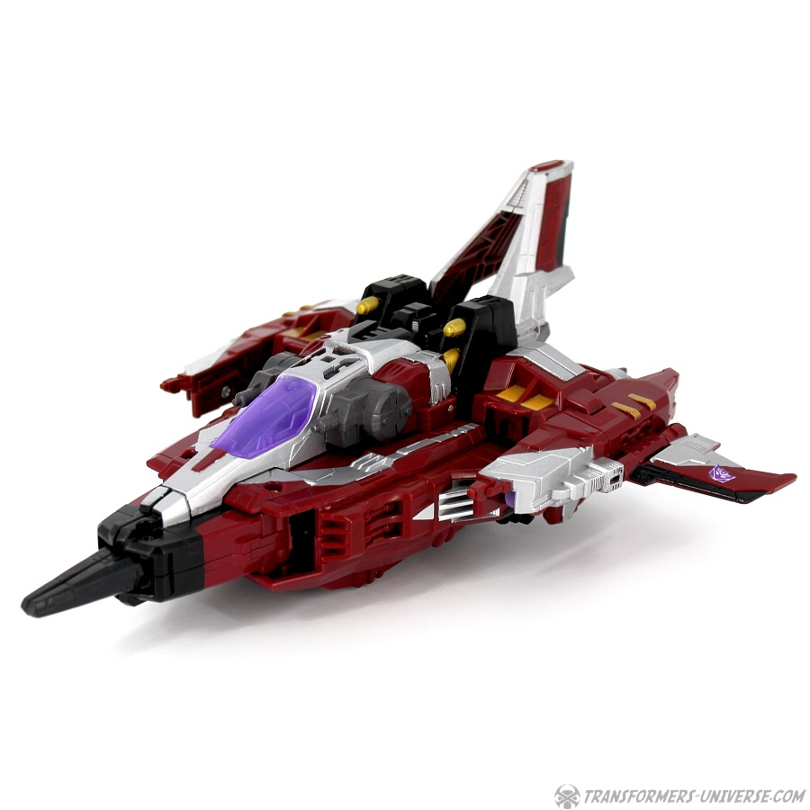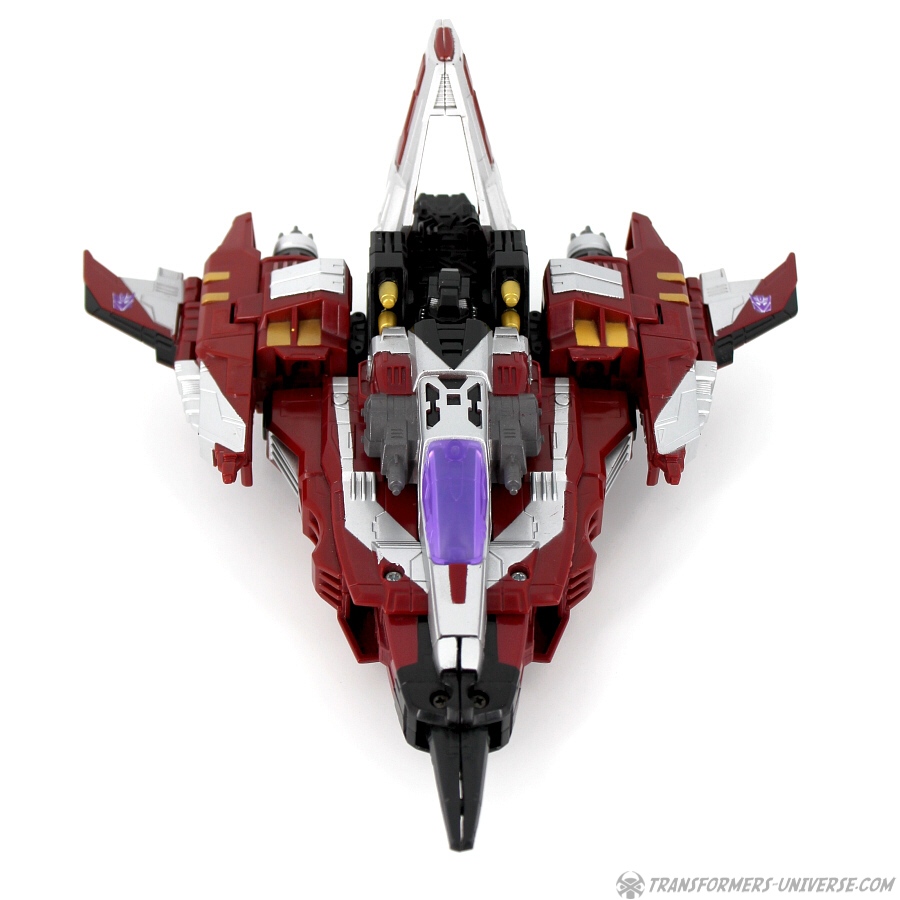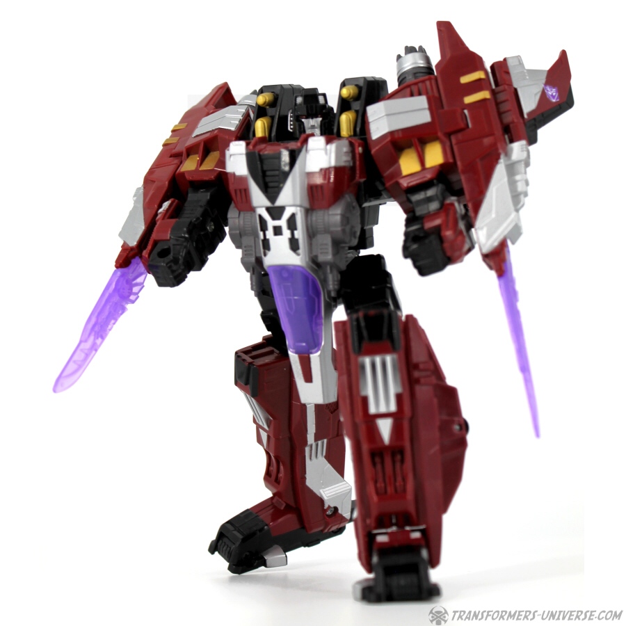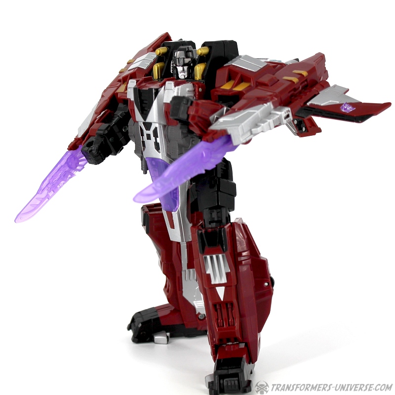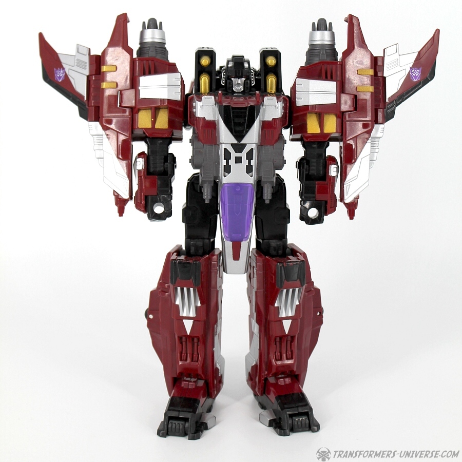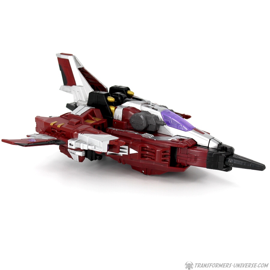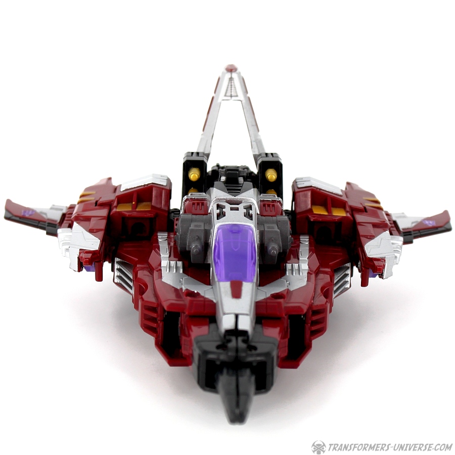 Robotermodus: Diese Figur hier ist ein Repaint von Galaxy Force Starscream, den ich erstmals im Jahr 2006 rezensiert habe (und seine Repaints Botcon Shattered Glass Starscream in 2008 und Universe Dirge in 2009). Ist auf jeden Fall schon eine Weile her, also kann man sich die Figur ruhig nochmal im Detail angucken.