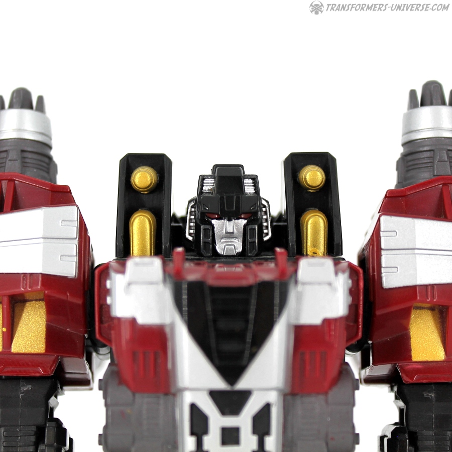 Die einzigen kleinen Nachteile dieses ansonsten tollen Roboters sind zum einen die unbeweglichen Kanonen auf der Brust (im Cartoon konnte er sie nach vorne ausrichten) und zum anderen, dass er von hinten so ein wenig unfertig aussieht (vor allem die komplett offenen Waden). Außerdem hat er eine Handwaffe dabei, die eine einzelne Rakete verschießt und irgendwie komplett überflüssig ist (er hatte sie auch nie im Cartoon). Somit unterm Strich: immer noch ein toller Robotermodus, mein Lieblings-Starscream aus der Unicron Trilogie. Von den vier Farbvarianten allerdings finde ich diese hier am langweiligsten.