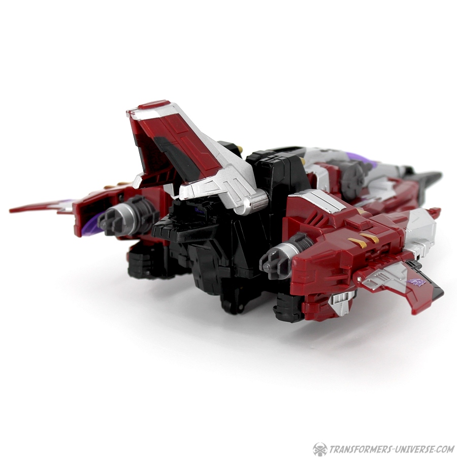 Alternativmodus: Starscream verwandelt sich in einen großen Weltraumjet, so ein wenig inspiriert von den Tetrajets aus dem G1 Cartoon Piloten More Than Meets the Eye und vermutlich der direkte Vorgänger der Seeker Designs aus den War for Cybertron / Fall of Cybertron Spielen von Moon Studios. Die Transformation ist ziemlich einfach und geradlinig. Wobei es etwas schwieriger ist, ihn wieder in den Robotermodus zurück zu verwandeln, denn wenn die Füße erstmal vorne einrasten, um die Spitze des Jets zu bilden, dann kriegt man sie nicht mehr so ganz einfach auseinander.