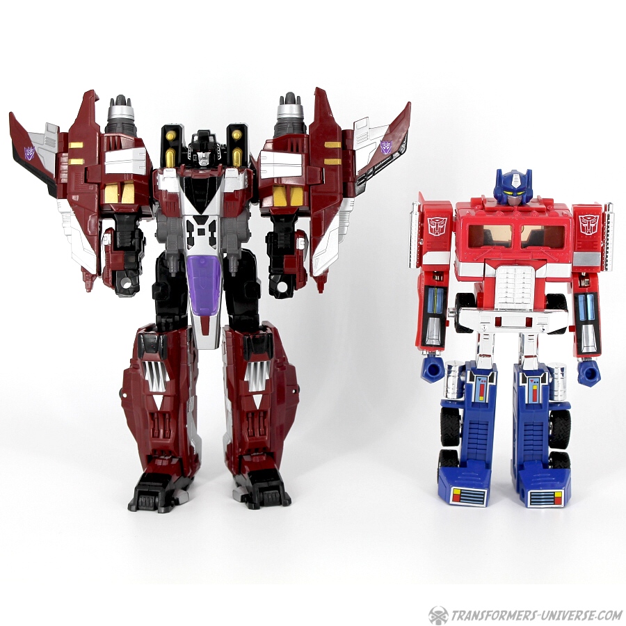 Vorwort: Hey, Du erinnerst Dich an diese geniale Voyager-Klasse Starscream Figur aus Takaras Galaxy Force Reihe? Schlechte Nachrichten, die kriegst Du nicht in der Cybertron Reihe. Warum kaufst Du stattdessen nicht diesen riesigen Supreme-Klasse Starscream? Nein? Okay, wir sind mal nicht so. Du kriegst den Voyager Starscream, aber nur im Doppelpack mit einer Vector Prime Figur, die Du vermutlich schon hast, und auch nur bei Toys R’Us. Ach so, und die Figur hat eine andere Bemalung als im Cartoon. Was meinst du bitte mit unfair? Die Supreme Version hat den Cartoon-Anstrich, aber die wolltest Du ja nicht! Mann, diesen Transformers Fans kann man es auch einfach nicht recht machen. Los geht’s!