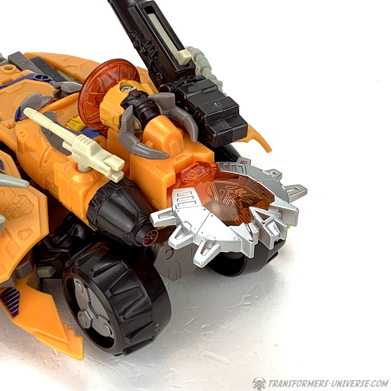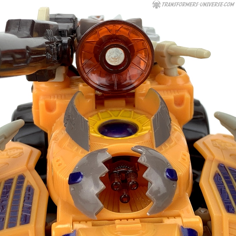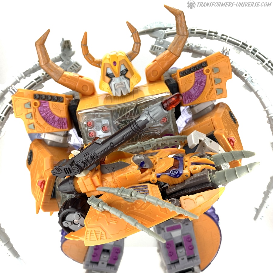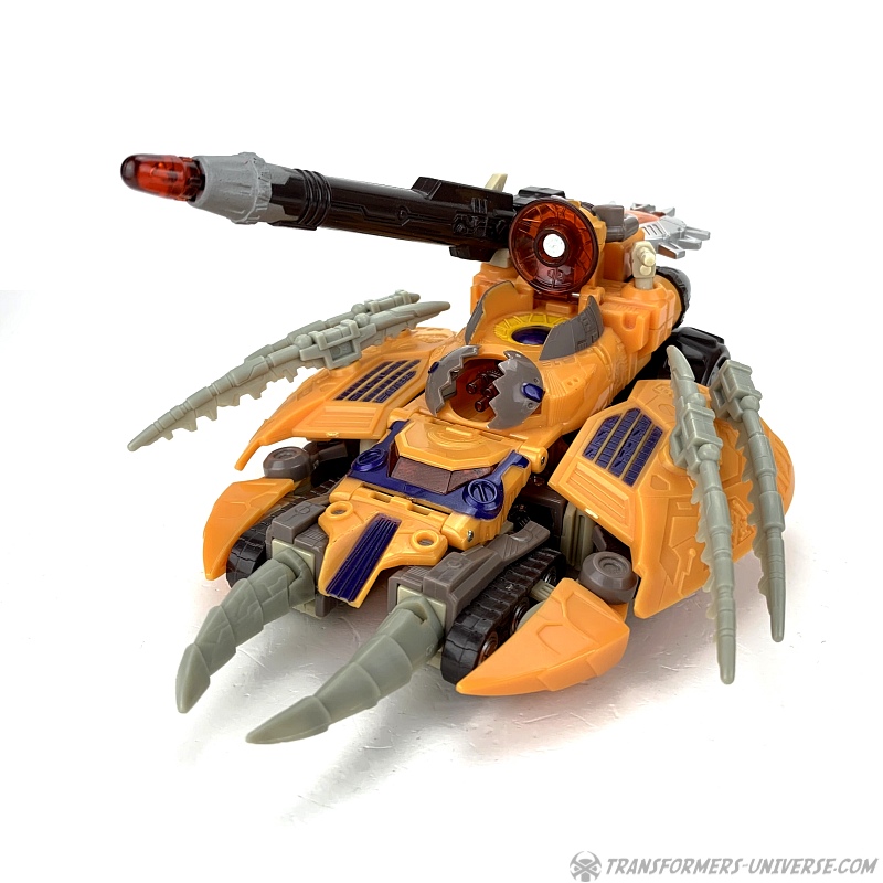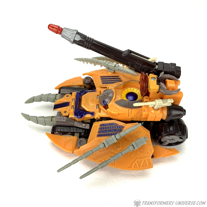 Fahrzeugmodus: Unicrons Alternativmodus ist ein Panzer, der mich ein wenig an die alten Ferengi Marauder Schiffe aus Star Trek: Das nächste Jahrhundert erinnert. Auf jeden Fall ähnelt er keinem irdischen Panzer, sieht aber trotzdem nicht schlecht aus. Der Panzer enthält einige Elemente von Unicrons ursprünglichem Planetenmodus, so wie die Greifer an der Seite oder der 'Schlund', der auch in diesem Modus geöffnet werden kann. Alles in allem ist der Panzer ein anständiger Modus, wenn es mich auch ein wenig irritiert dass der Roboterkopf einfach nach hinten klappt und als Radarschüssel dient. Sieht irgendwie dämlich aus. Ist aber mein einziger Kritikpunkt.