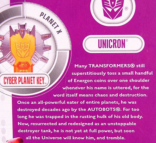 Bemerkungen: Die Figur für sich genommen ist nicht schlecht, aber meiner Meinung nach ist sie kein guter Unicron. Irgendwie funktioniert sie für den Charakter nicht. Wenn man sie sich aber einfach als jemand oder etwas anderes vorstellt (zum Beispiel eine einer ganzen Armee von Dronen, die Unicron für Kleinkram benutzt), dann hat man ein gutes Spielzeug. Nichts besonderes, aber okay.