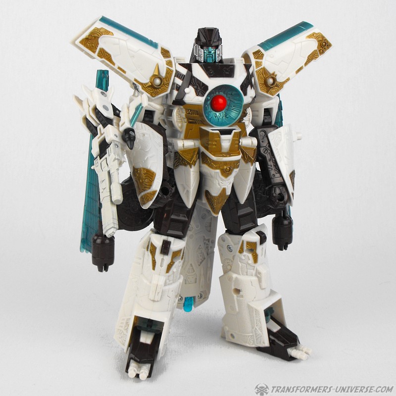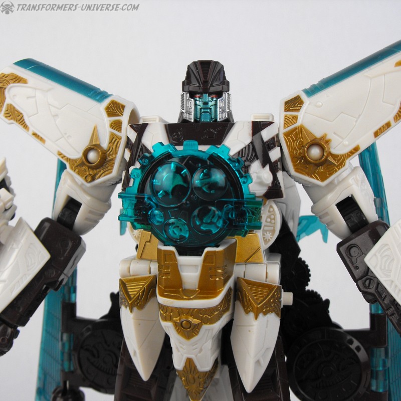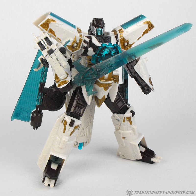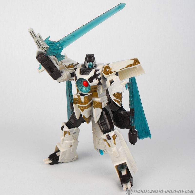 Roboter Modus: Vector Primes Robotermodus stellt eine Homage an zwei etablierte Charaktere des Transformers Universums dar. Zum einem an den mythischen "Letzten Autobot" aus der Marvel Comics Serie, zum anderen an Alpha Trion aus dem G1 Cartoon. Vector Prime ist aber auch ein eigenständiger Charakter und sein Aussehen drückt Alter und Würde aus. Er erinnert ein wenig an einen gealterten, gepanzerten Kreuzritter. Die gute Detaillierung seiner Hülle, sowie sein Schwert und sein generelles Layout unterstützen diesen Eindruck. Seine Beweglichkeit ist exzellent und das Design dieses Spielzeugs gefällt mir sehr gut. Nur die Qualität seiner Flügel und seines Schwertes lässt ein wenig zu wünschen übrig, diese sind aus relativ weichem Plastik. Diese kleine Sünde vergibt man ihm jedoch gerne.