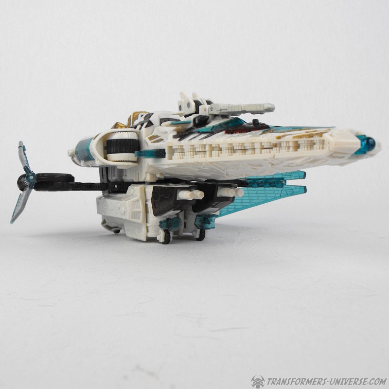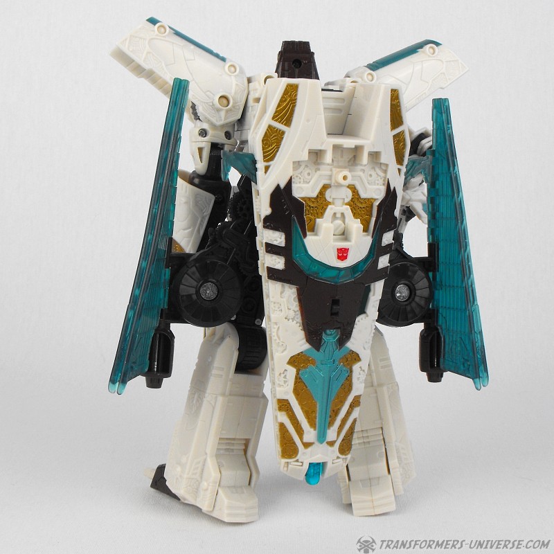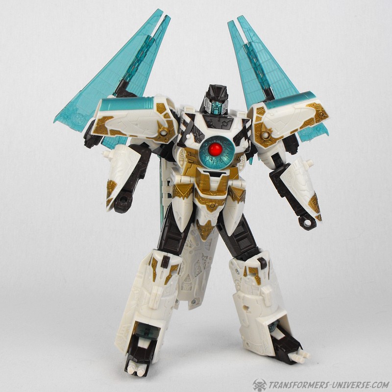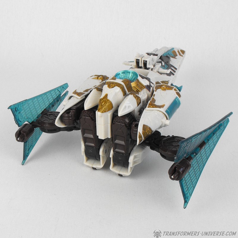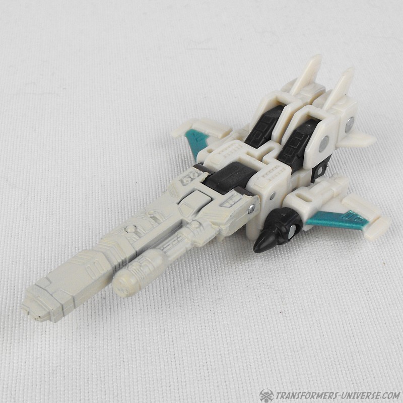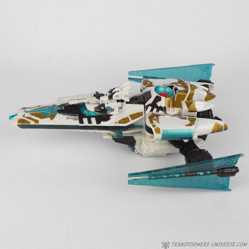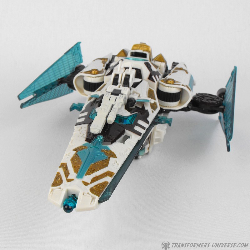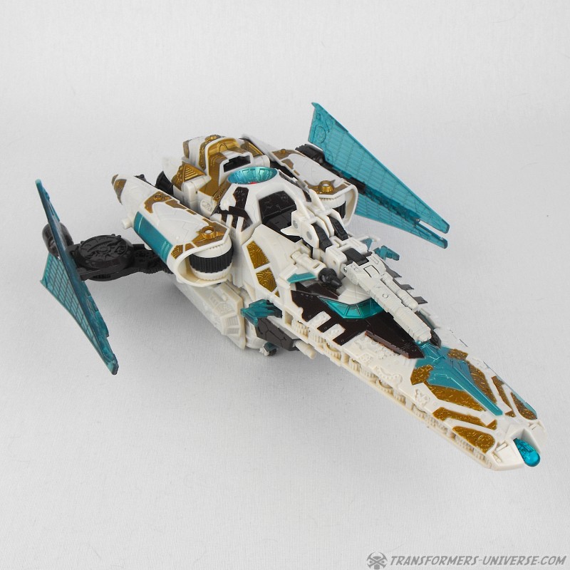 Fahrzeug Modus: Eine sehr einfache Verwandlung macht aus Vector Prime ein futuristisches Raumfahrzeug, das auch wieder eine gewisse Ähnlichkeit mit dem Letzten Autobot von Marvel aufweist, der einen ähnlichen Fahrzeugmodus hatte. Vector Primes Detaillierung ist in diesem Modus noch deutlicher erkennbar, aber leider schwächt seine weiße Farbe diese ein wenig ab. Hasbro hätte vielleicht lieber die etwas dunklerere Farbe des Takara Originals übernehmen sollen, aber das ist eine andere Diskussion. Der Jet wirkt solide und realistisch (sofern ein solches Raumfahrzeug realistisch wirken kann), zumindest von Vorne und den Seiten. Man sollte ihn nicht von hinten betrachten, denn dort wird seine robotische Natur leicht erkennbar.