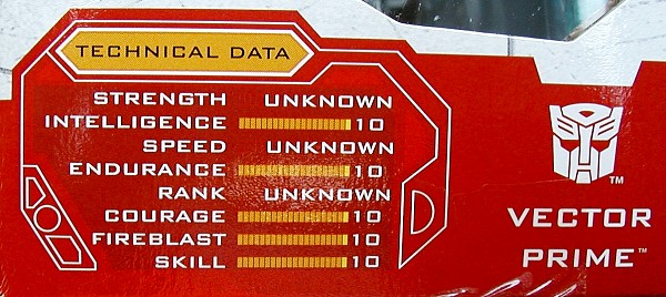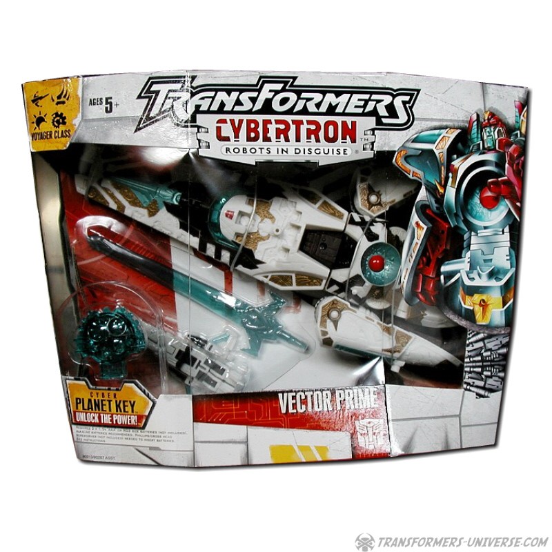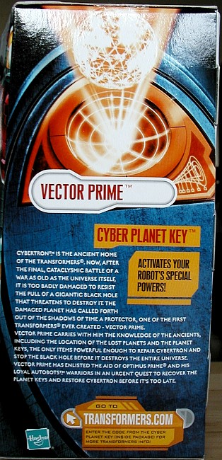 Vector Prime ist einer der ersten Transformer. Dieser mächtige, weise und unglaublich alte Krieger hat von Anfang an als Beschützer von Cybertron gedient. Ein Notsignal seines beschädigten Planeten ließ ihn aus den Schatten der Zeit hervortreten, doch leider kommt er zu spät, um Cybertron ohne Hilfe zu retten. Er kommt aus einer Zeit, in der alle Transformer in Harmonie lebten, deshalb weiß er nichts vom dem Konflikt zwischen Autobots und Decepticons. Megatron nutzte dies, um ihn zu täuschen und um die Karte zu den verlorenen Planeten und ihren Planetenschlüsseln zu rauben. Vector Prime hat seinen Fehler eingesehen und stellt nun sein Wissen und seine Fähigkeiten in den Dienst von Optimus Prime, um die Schlüssel vor Megatron zu finden.