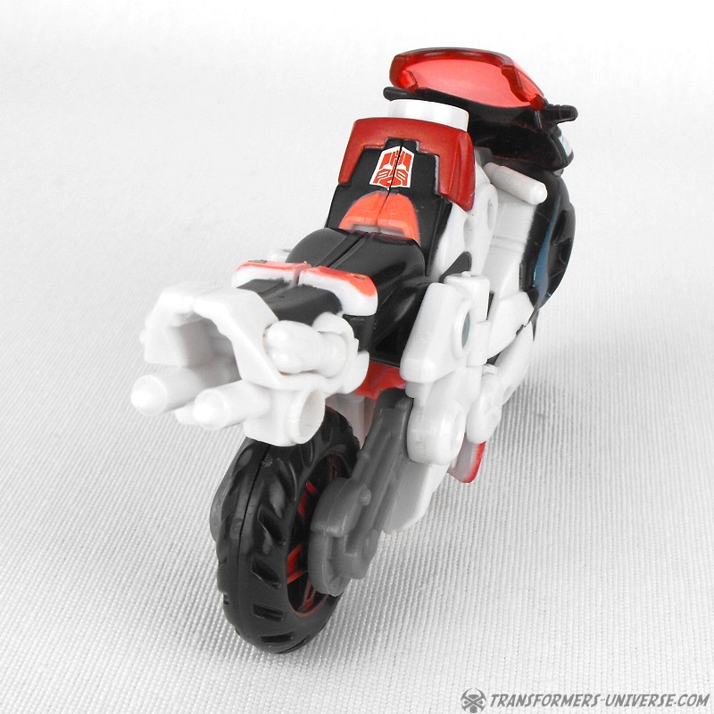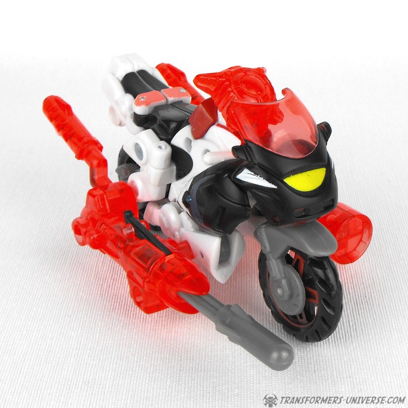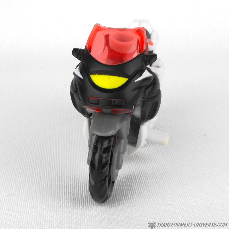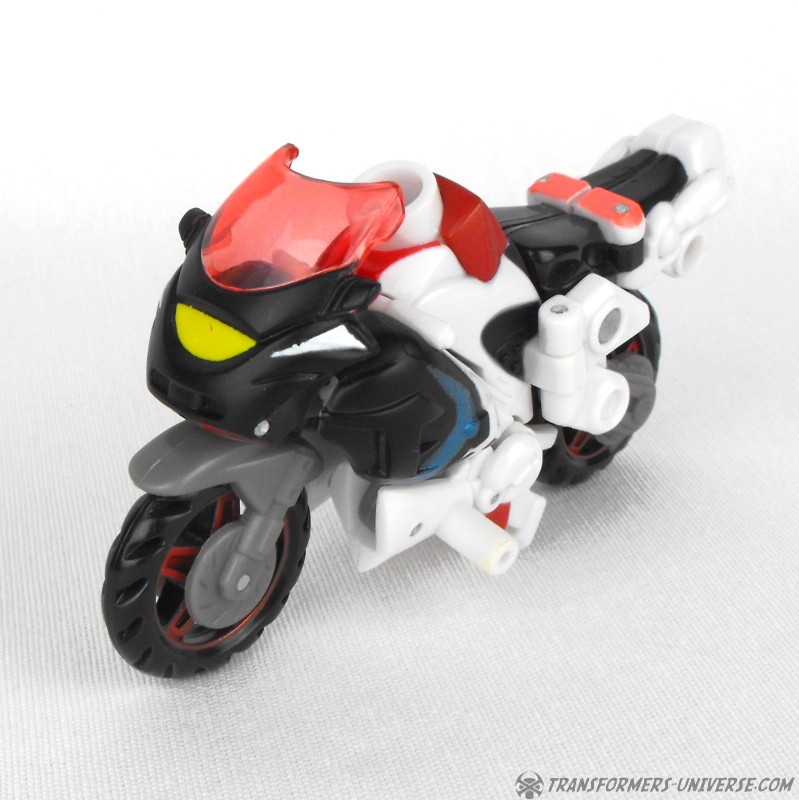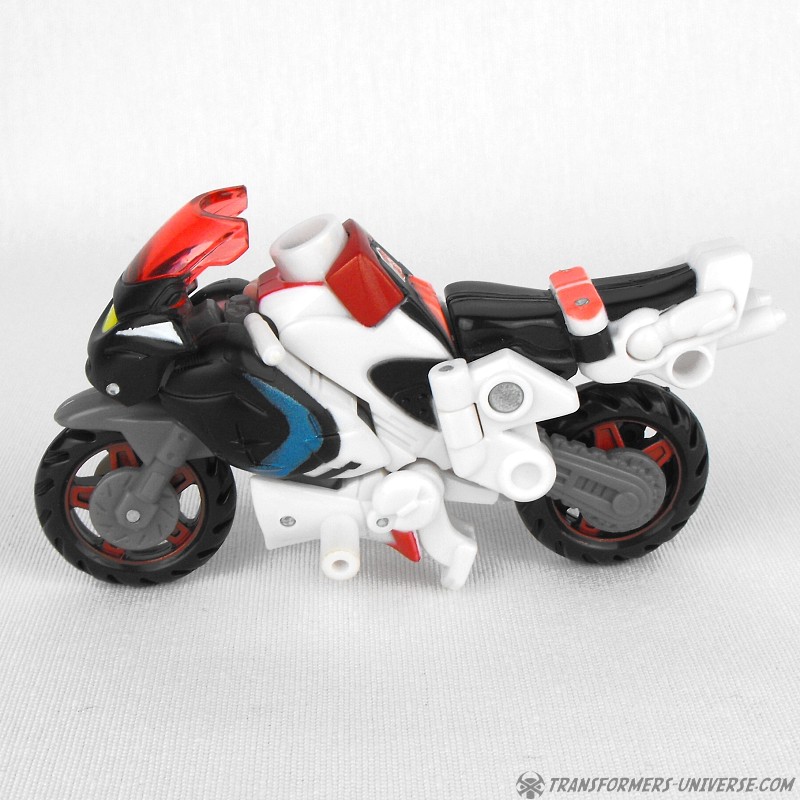 Alternativer Modus: Arcee verwandelt sich in ein Motorrad (ein sog. Bullet Bike), dass beim nächsten Honda Händler nicht weiter auffallen würde. Das Motorrad sieht sowohl in seiner normalen Form, als auch bestückt mit den Energonwaffen gut aus. In letzterer Form wirkt Arcee, als hätte sie ein verrückter Bastler einem Tune-Up unterzogen, aber nicht schlecht. Ein guter Fahrzeugmodus.