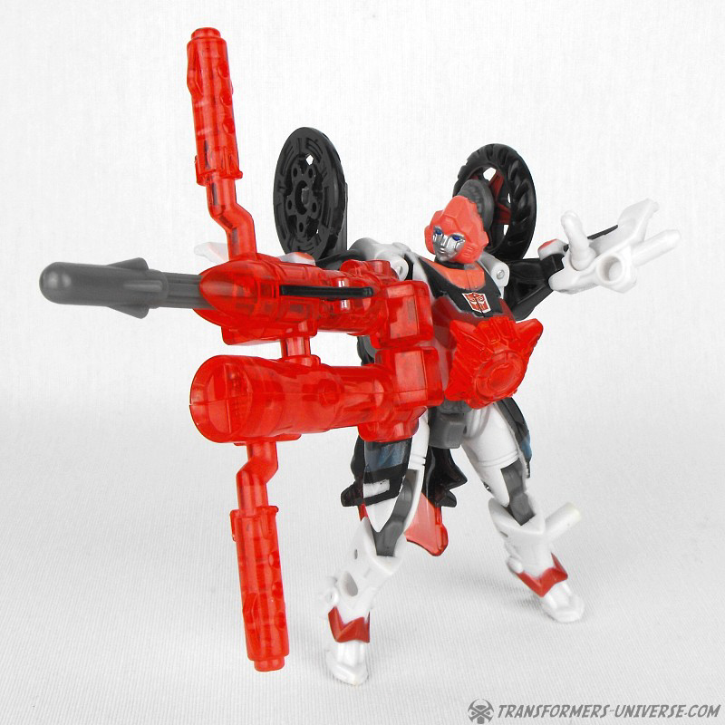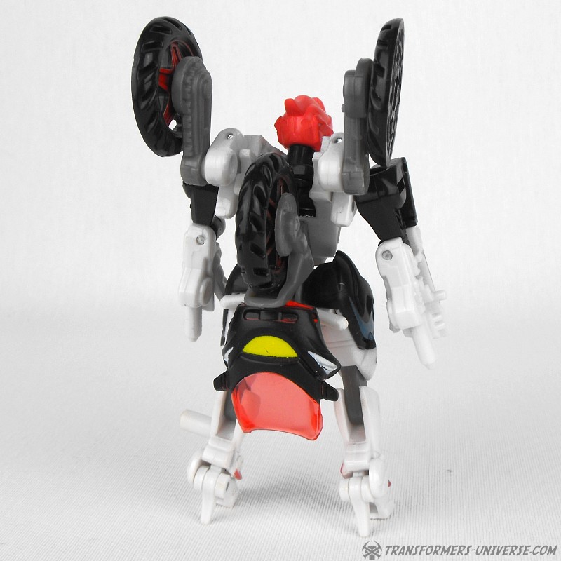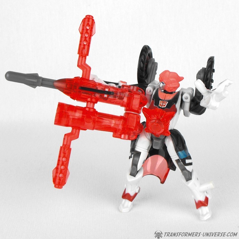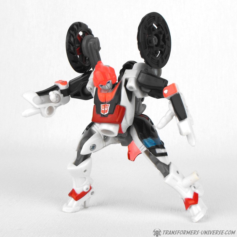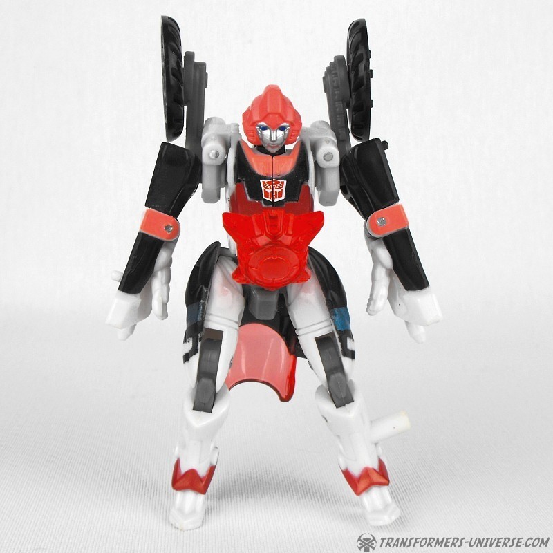 Alternativer Modus: Arcee verwandelt sich in ein Motorrad (ein sog. Bullet Bike), dass beim nächsten Honda Händler nicht weiter auffallen würde. Das Motorrad sieht sowohl in seiner normalen Form, als auch bestückt mit den Energonwaffen gut aus. In letzterer Form wirkt Arcee, als hätte sie ein verrückter Bastler einem Tune-Up unterzogen, aber nicht schlecht. Ein guter Fahrzeugmodus.
