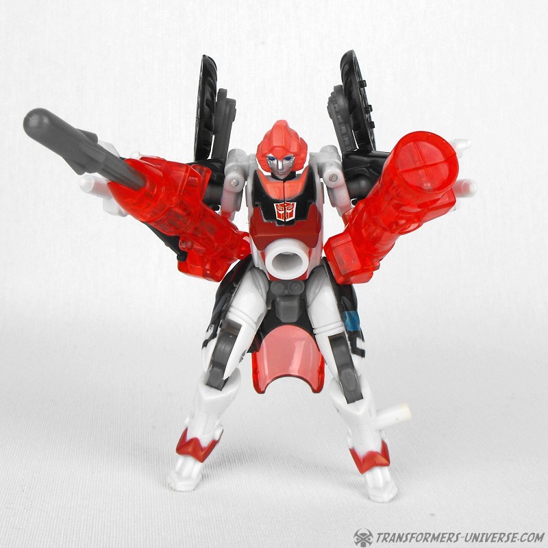 Roboter Modus: Arcees Robotermodus ist eine gute Mischung aus dem recht kurvigen Chassis, welches sie im Transformers Film hatte, und den etwas massigeren Körpern der meisten Transformer. Das Resultat sieht immer noch weiblich, aber nicht weibisch aus. Ihr Kopf ist fast eine 1 zu 1 Kopie aus G1, der Rest ist neu. Sie ist relativ beweglich (wenn auch nicht so beweglich wie andere Energon Spielzeuge ihrer Größenklasse), nur ihre Füße mit den hohen Absätzen machen sie ein wenig instabil. Alles in allem ein guter Robotermodus, der für Fans deutlich als Arcee erkennbar ist. Ein kleiner Nachteil ist ihre Waffe, der Energonbogen, der fast genauso groß ist wie sie selbst. Sie kann ihn deshalb nur seitlich halten, nicht nach vorne. Sieht als Pose aber fast wie ein Bogenschütze aus, macht also nichts. Sie hätten ihr allerdings richtige Hände geben können anstatt dieser kleinen Noppen am Ende ihrer Arme.