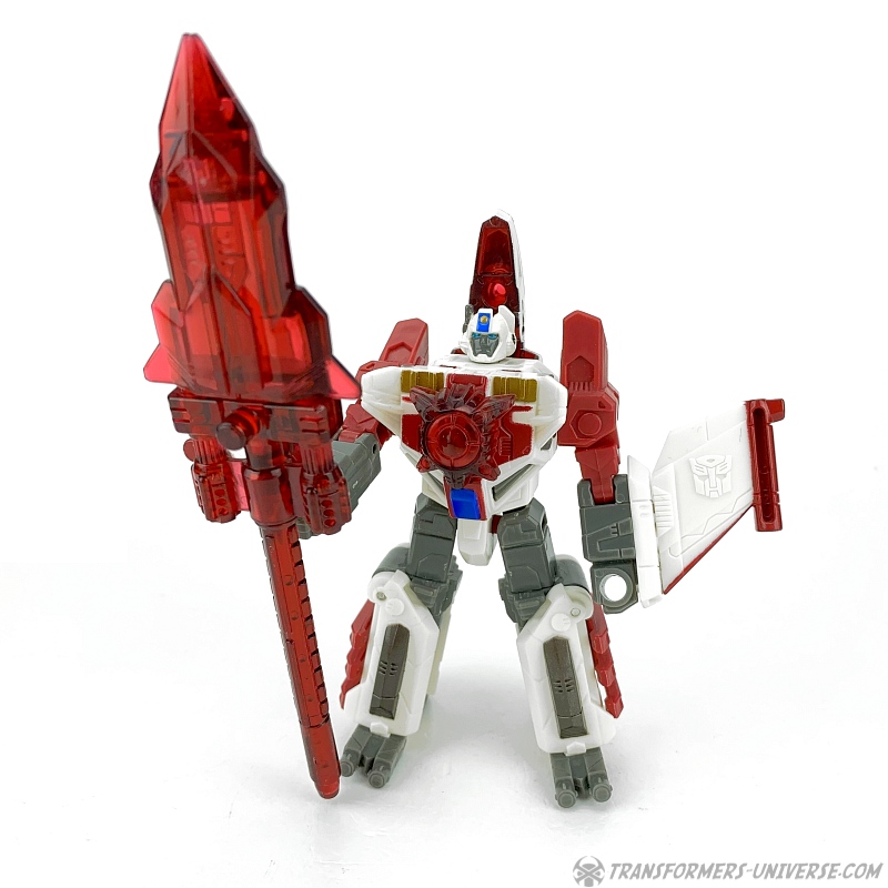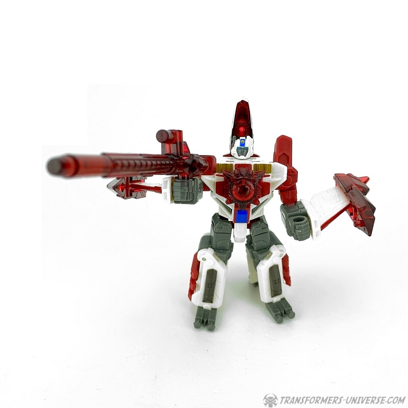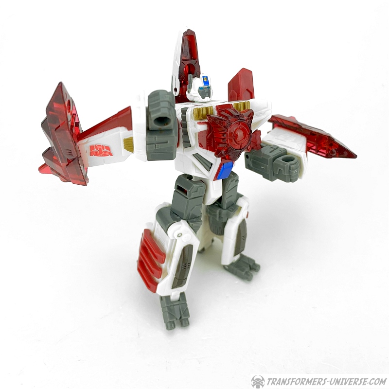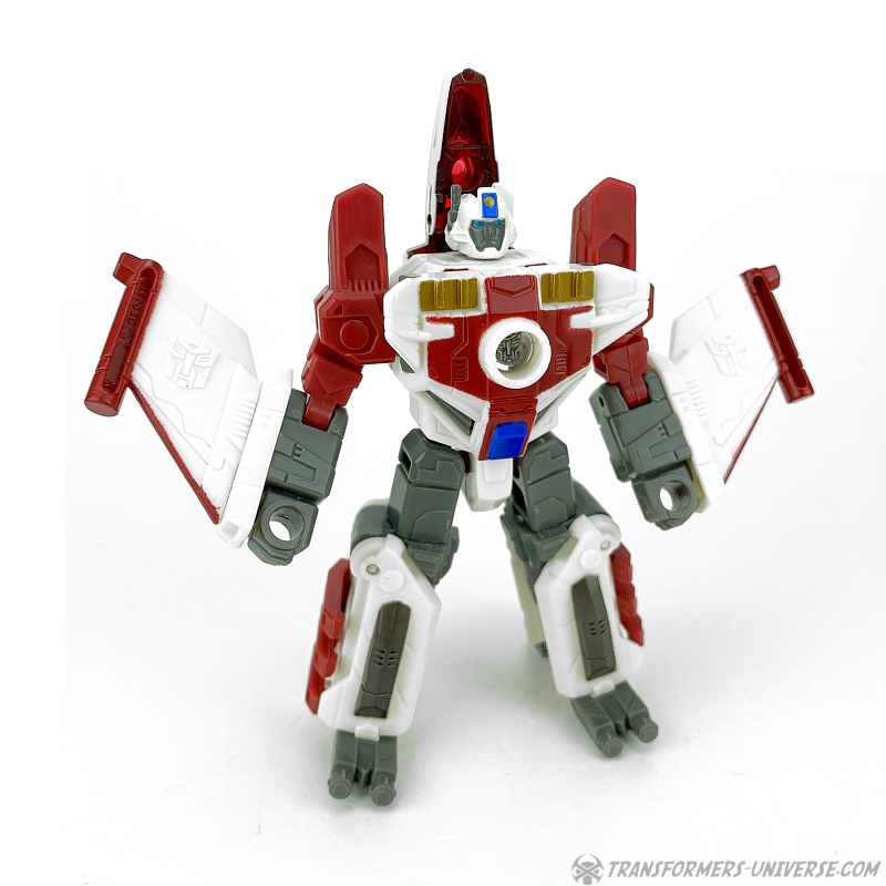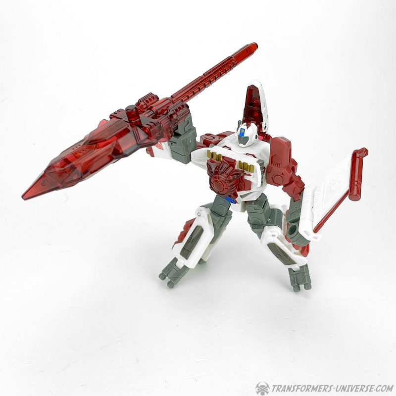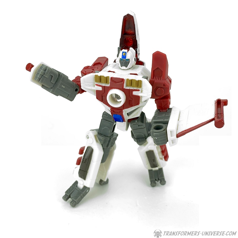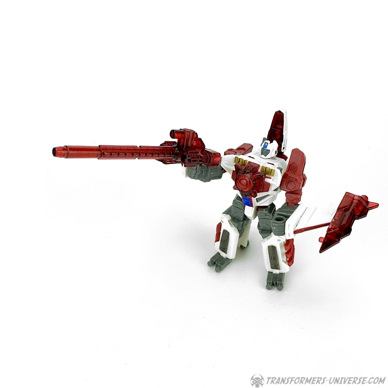 Roboter Modus: Skyblast gibt einen gutaussehenden Roboter ab, eine gute Kombi aus Flugzeug-Flair und seiner größtenteils weißen Färbung gibt ihm die Ausstrahlung eines fliegenden Helden, speziell wenn er dazu noch seine Energonwaffe als Speer trägt. Für eine Figur der Basic-Größe ist seine Beweglichkeit gut (wenn er auch seine Knie nicht beugen kann, was mich immer ein wenig stört). Ein rundum guter Roboter ohne nennenswerte Mängel, mit gutem Aussehen und einer ziemlich geilen Waffe.