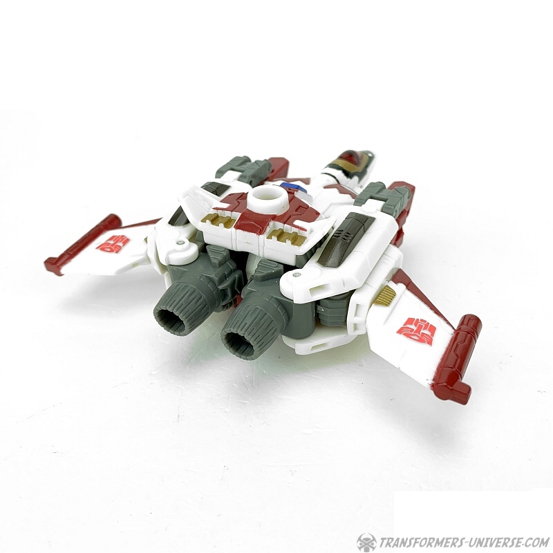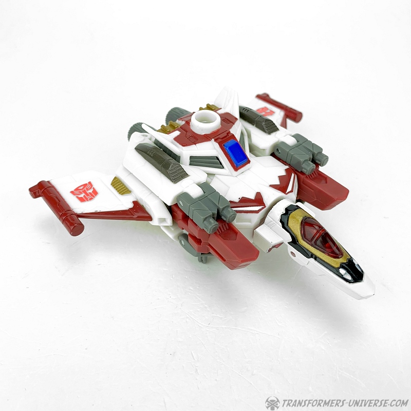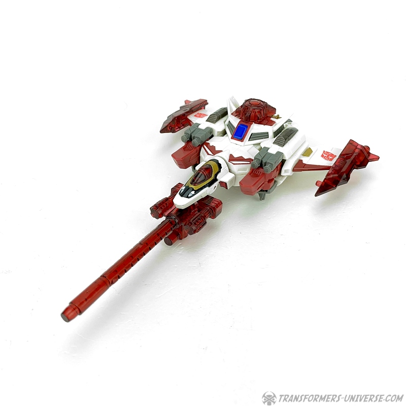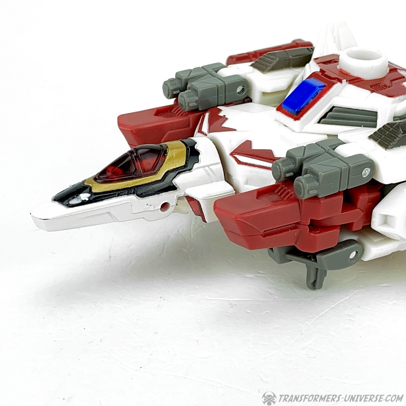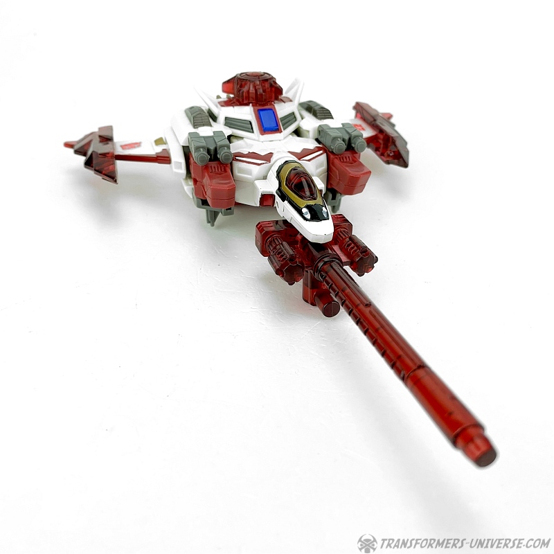 Fahrzeug Modus: Als Flugzeug, das mehr wie ein Raumjet aussieht, gibt Skyblast auch in diesem Modus eine gute Figur ab. Die Verwandlung in den Jet ist einfach und elegant. Die Detaillierung ist ziemlich gut für ein Spielzeug dieser Größe, so weist er u.a. ein Fahrwerk, einzelne Düsen, und andere nette Kleinigkeiten auf. Der Jet kann durch die Teile der Energonwaffe noch aufgemotzt werden. Allerdings halten die Flügelteile nicht besonders gut und die große Waffe unterm Cockpit wirkt einfach zu groß für meinen Geschmack. Ich lasse ihn lieber im einfachen Jetmodus, da sieht er gut genug aus.