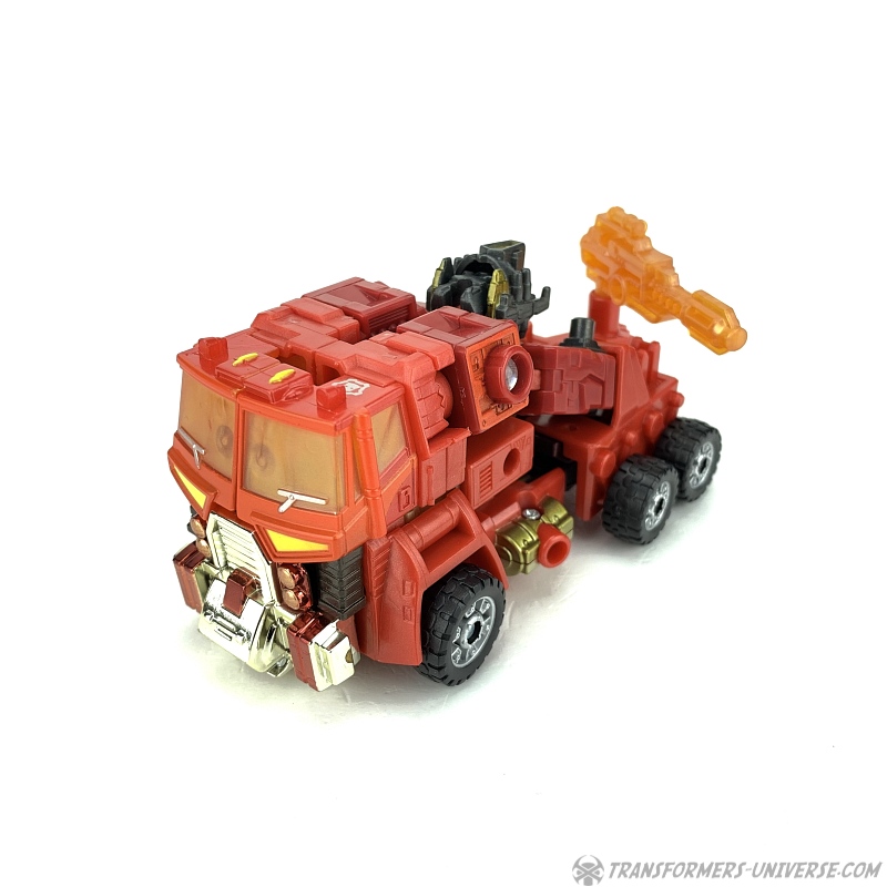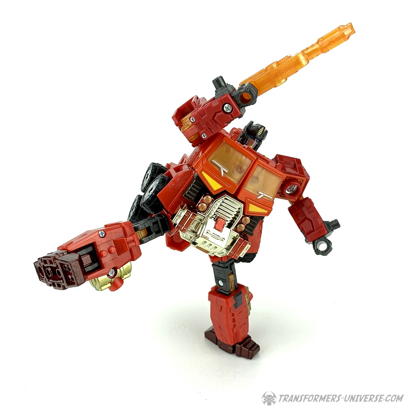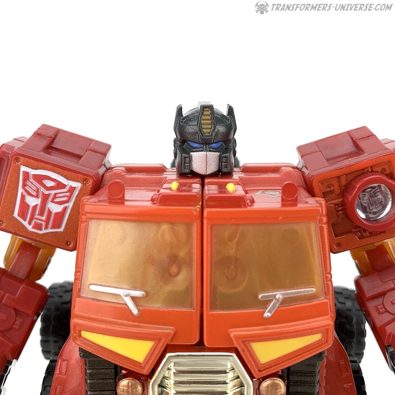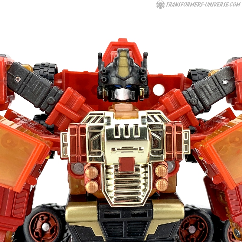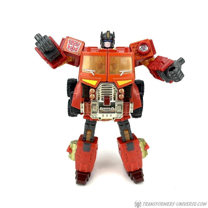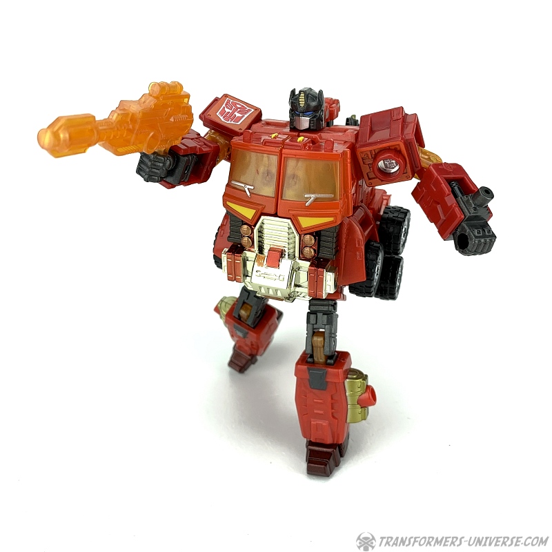Grand Convoy Fire ist eine Deluxe-große Inkarnation von Energon Optimus Prime, ein gutes Stück kleiner als die Originalfigur und hier mit einem exklusiven roten Anstrich, aufgelockert durch ein paar orange und verchromte Highlights. So wie auch die anderen Versionen von Energon Prime / Grand Convoy ist her vom Design her eher kantig, wirkt irgendwie stark übergewichtig, trägt einen riesigen Rucksack, und steht auf vergleichsweise dürren Beinchen.