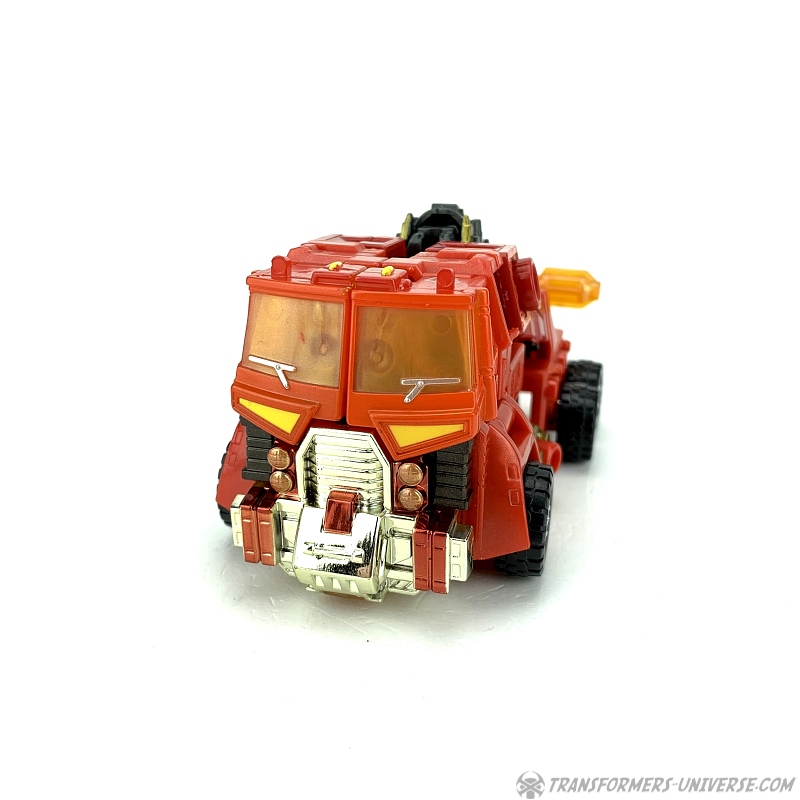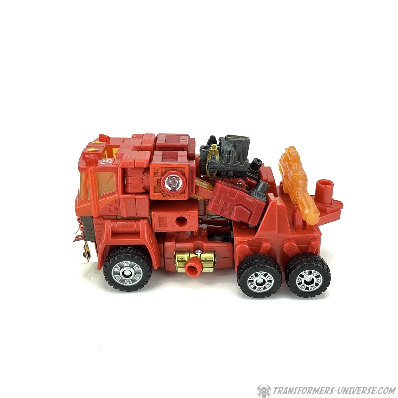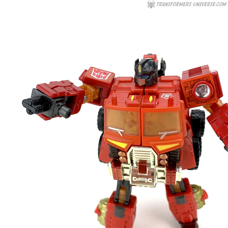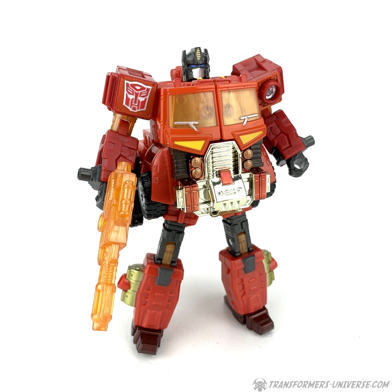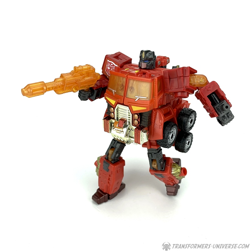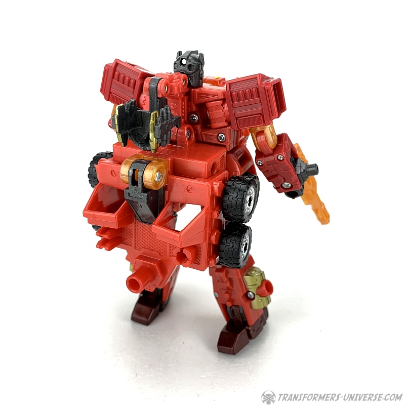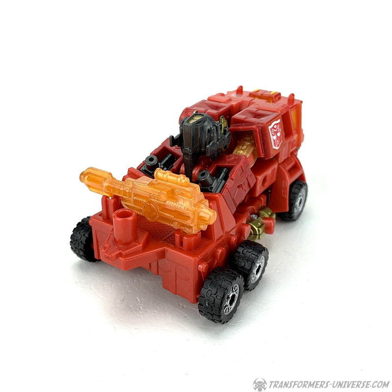 Grand Convoy Fire ist eine Deluxe-große Inkarnation von Energon Optimus Prime, ein gutes Stück kleiner als die Originalfigur und hier mit einem exklusiven roten Anstrich, aufgelockert durch ein paar orange und verchromte Highlights. So wie auch die anderen Versionen von Energon Prime / Grand Convoy ist her vom Design her eher kantig, wirkt irgendwie stark übergewichtig, trägt einen riesigen Rucksack, und steht auf vergleichsweise dürren Beinchen.