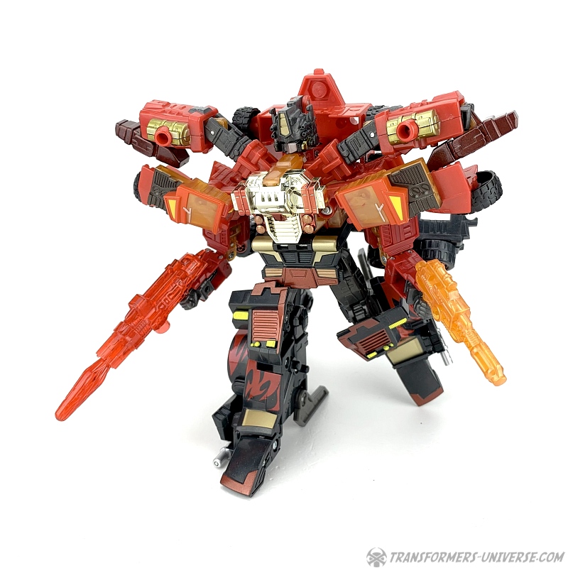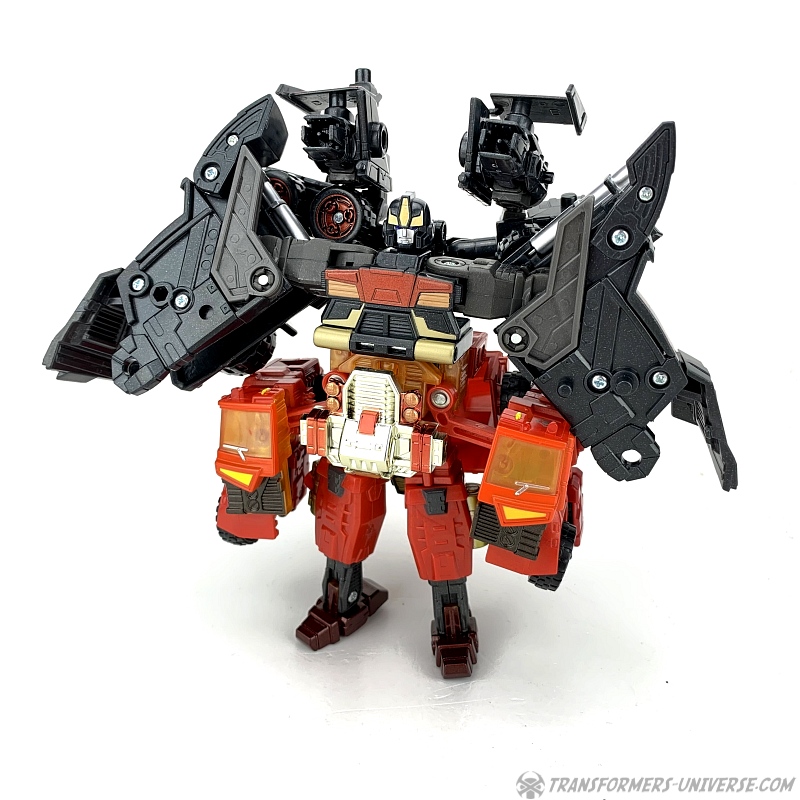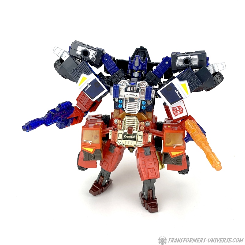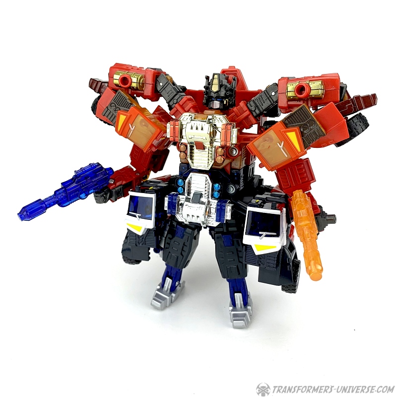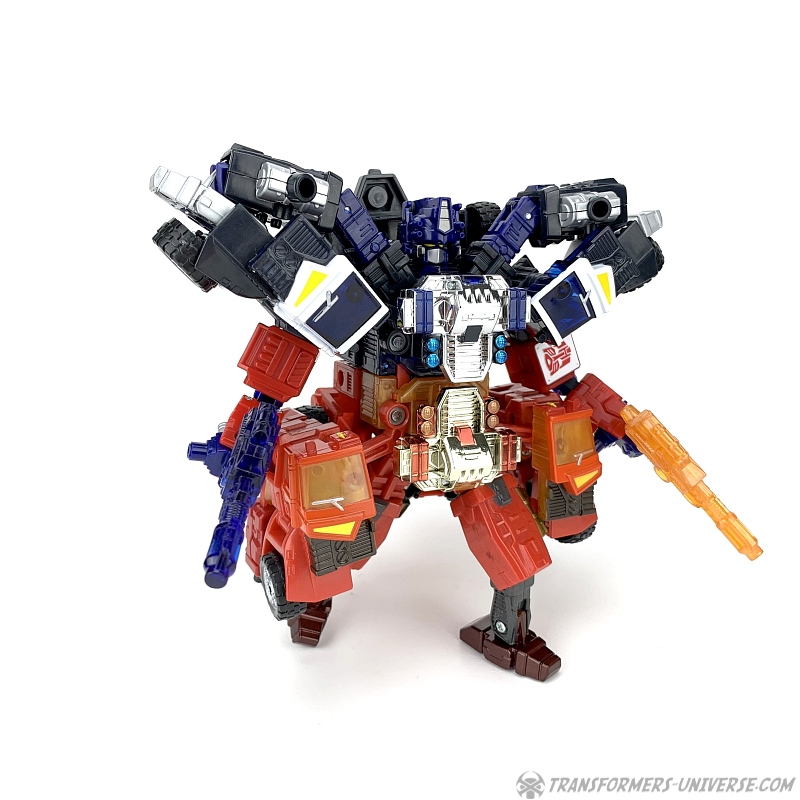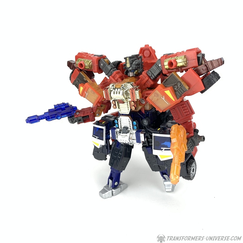 Kombinationsmodus: Grand Convoy Fire ist ein Energon Powerlinx Combiner, was heißt er kann sich mit einer anderen Figur entweder als Ober- oder Unterkörper kombinieren. Wenn man das Energon Powerlinx Combiner Gimmick so ganzheitlich betrachtet, dann gab es da Höhen und Tiefen. Einige Figuren (wie z.B. Inferno) waren in beiden Kombinationsmodi gut, ein paar andere (wie Rodimus) sagen nur als Oberkörper gut aus, und wieder andere wie… na ja, wie Grand Convoy eben, sind in beiden Varianten Mist.