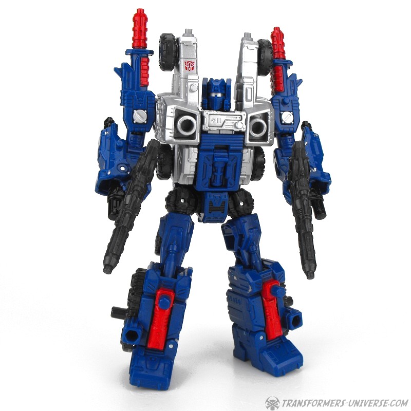 Während die beiden Fahrzeuge G1-akkurat sind, ist das eigentliche Alleinstellungsmerkmal dieser Version von Cog das Weaponizer Gimmick. Man nehme Cog auseinander und er wird zu einer Reihe von Waffen und Zusatzmodulen, die von anderen Siege Figuren genutzt werden kann (oder jeder beliebigen Figur mit ausreichend 5mm Ports). Alle Module kriegen sogar eigene Namen. Cogs Arme werden zu Elektro-Störern (ein Paar Kanonen), seine Beine zu Spektrum-Disruptoren (ein Paar Stiefel), seine Schultern zu einem Neutronen-Synthese-Schild und sein Torso zu einem Thermal-Booster (ein Rucksack). Alle Waffen/Module haben in Cogs Anleitung auch eigene Werte für Feuerkraft, Reichweite, etc.