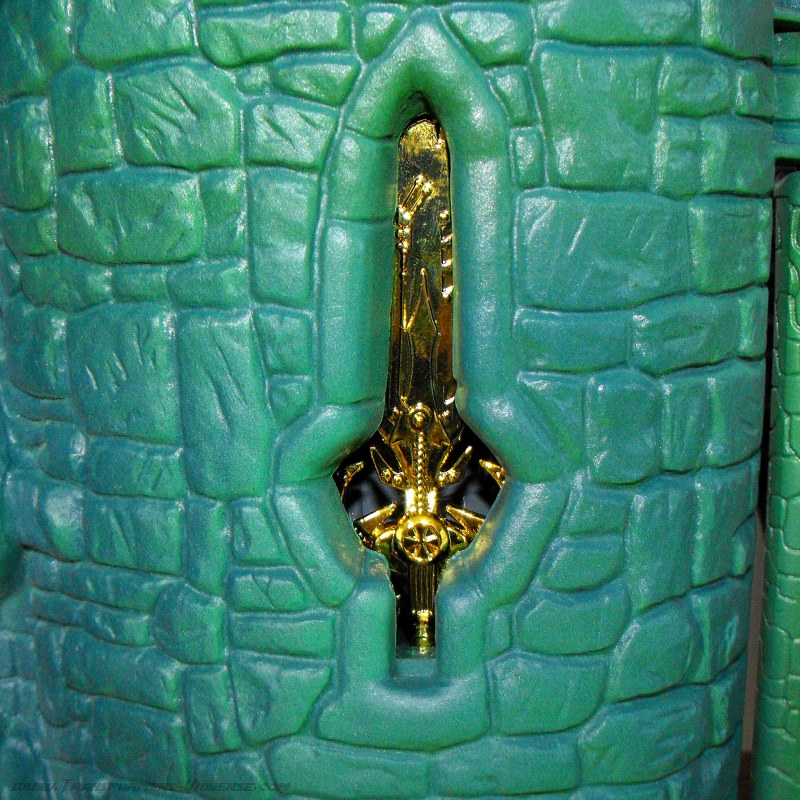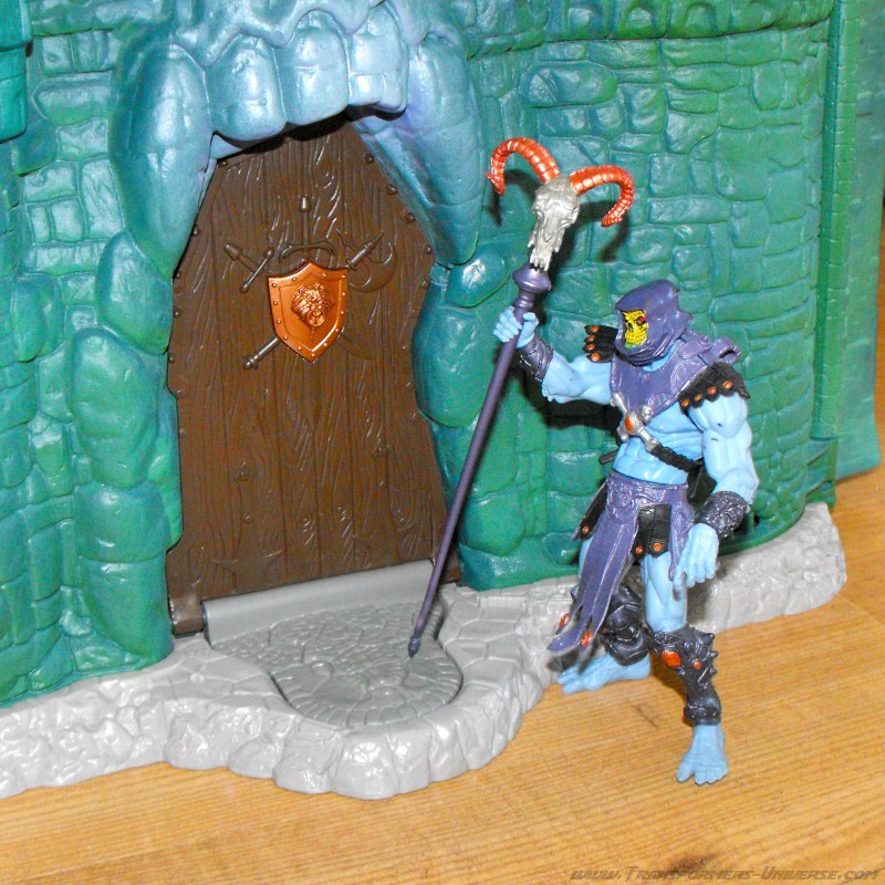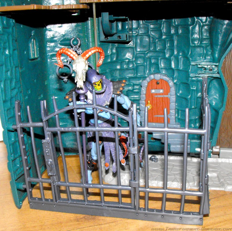 The 2002 Castle Grayskull playset was a new playset based on the castle as it was shown in the 2002 cartoon series. Much like the original playset, it could fold together into a kind of carry case, though a slimmer one than the one from the 80s. It had many of the same play features, though, such as the blaster on the turret (with launching missiles), the jaw bridge, the flag, a trap door that led into a jail cell, and a number of weapons that you could outfit your figures with. Unlike the original it featured light and sound action.