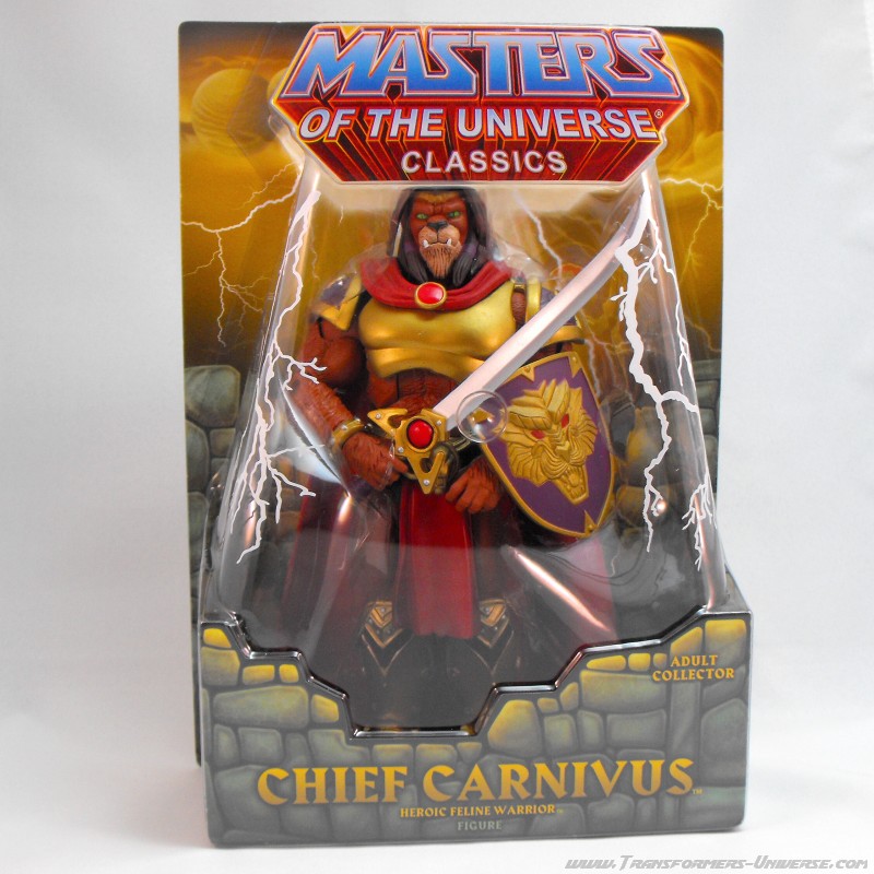 Review: Chief Carnivus is, for once, not a character from the original Masters of the Universe comics, cartoon, or toyline, but a new character created for the 200X cartoon series. He did not receive a figure in the accompanying toyline, so he had to wait until the Classics series to finally appear in toy form. Like all Classics figures he is very nicely poseable and he can remove both his cape and chest armor. He comes with a saber and a shield for weapons.