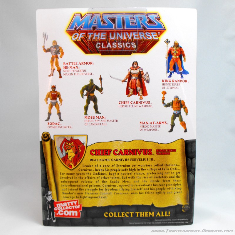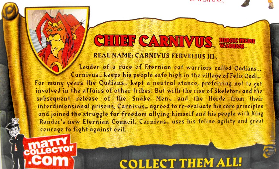 Leader of a race of Eternian cat warriors called Qadians, Carnivus keeps his people safe high in the village of Felis Qadi. For many years the Qadians kept neutral stance, preferring not to get involved in the affairs of other tribes. But with the rise of Skeletor and the subsequent release of the Snake Men and the Horde from their inter-dimensional prisons, Carnivus agreed to re-evaluate his core principles and joined the struggle for freedom allying himself and his people with King Randor’s new Eternian Council. Carnivus uses his feline agility and great courage to fight evil.