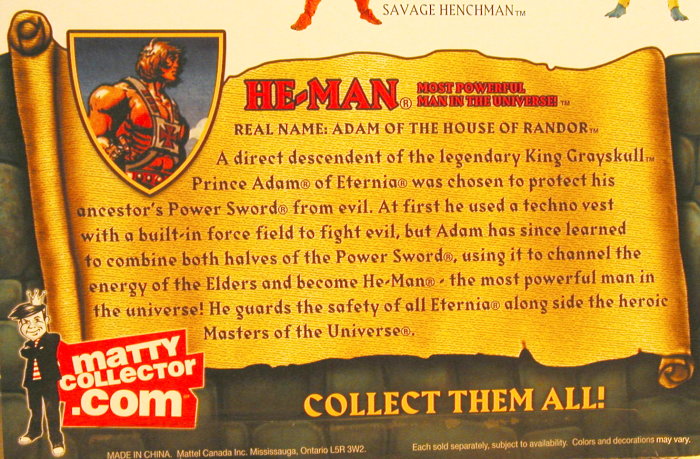 A direct descendent of the legendary King Grayskull, Prince Adam of Eternia was chosen to protect his ancestor's Power Sword from evil. At first he used a techno vest with a built-in force field to fight evil, but Adam has since learned to combine both halves of the Power Sword, using it to channel the energy of the Elders and become He-Man, the most powerful man in the universe! He guards the safety of all Eternia along side the heroic Masters of the Universe.