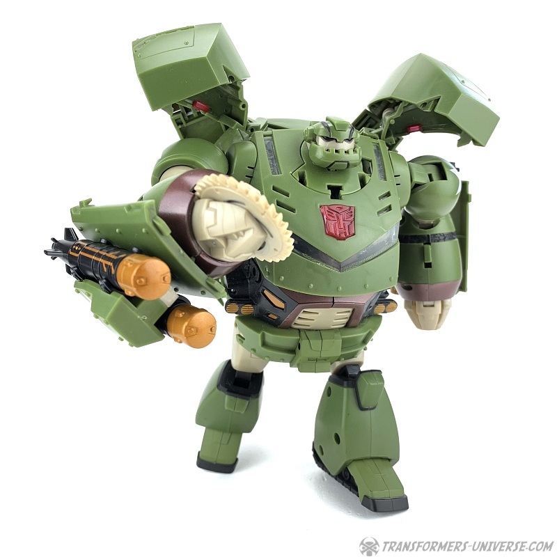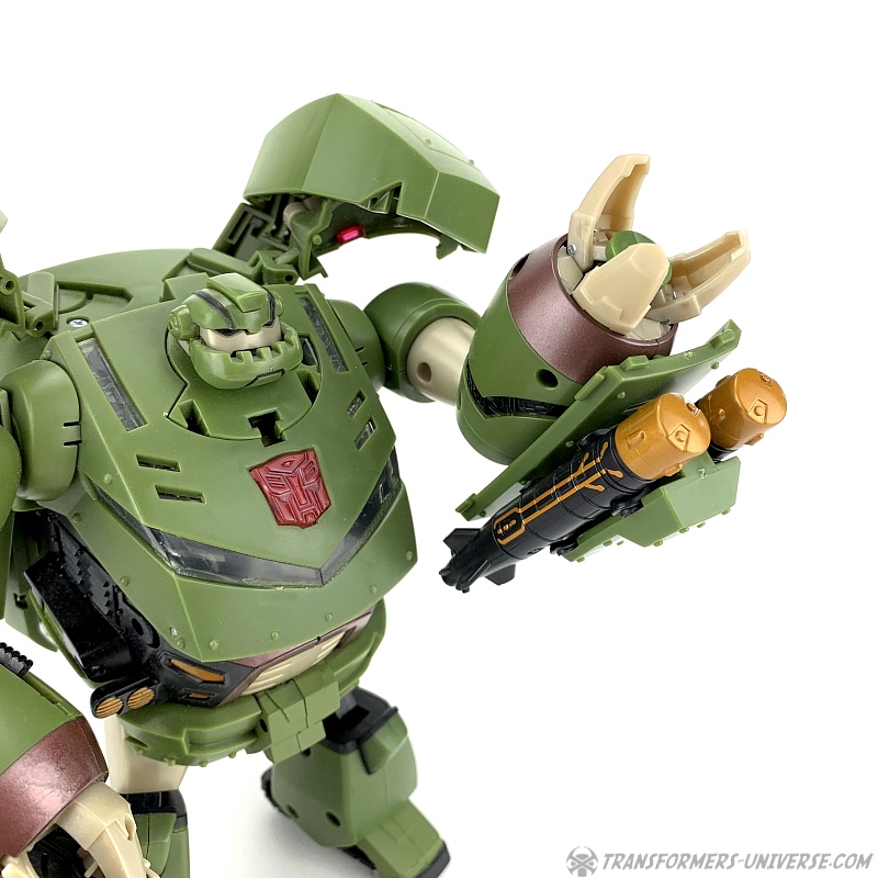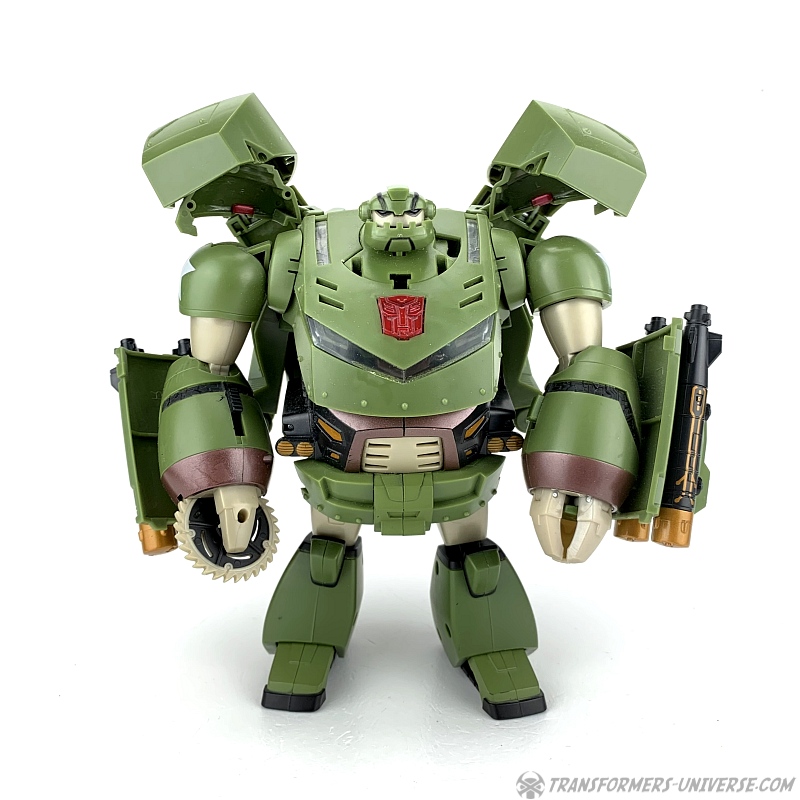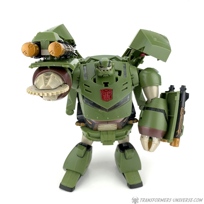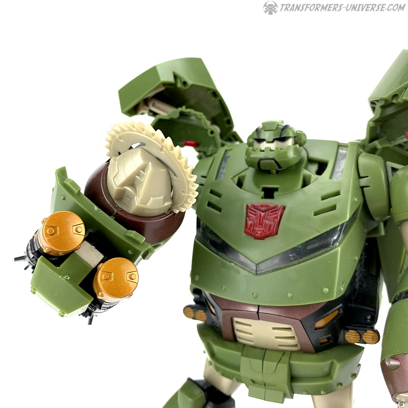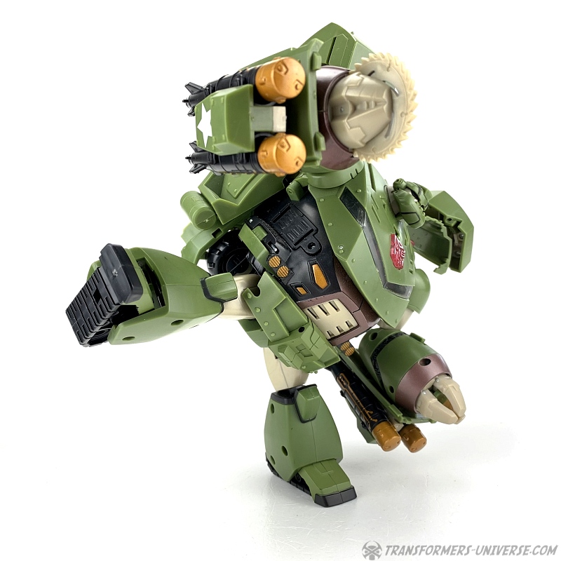 The other gimmicks Bulkhead features in robot mode are a buzzsaw on his right hand, which can be made to spin via a lever on his forearm, as well as twin missile launchers on each forearm. Also, his left arm features a lever as well, which causes his clawed hand to open. Now don't get me wrong, all these gimmicks are fine and nicely implemented. The problem is, they're the wrong gimmicks. Bulkhead never had missile launchers in the cartoon and if he ever had a buzzsaw, I don't remember it. His major feature, though, the wrecking ball, is completely absent here. I get that they probably wanted this figure to be somewhat different from the Voyager version, but why leave out one of Bulkhead's main characteristics?