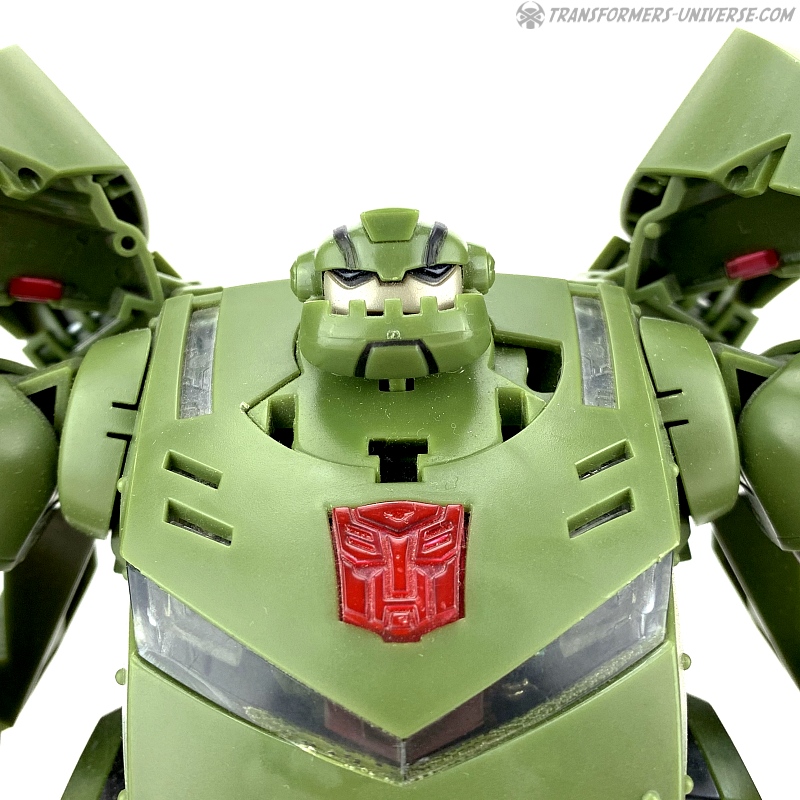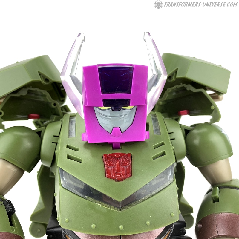 While I don't particularly like the look of this replacement head, it is very close to the cartoon counterpart and features a special added sound effect. Pressing on Bulkhead's Autobot symbol now produces one of the Headmaster's favourite lines: "Ownage! Total Ownage!". The Headmaster helmet can also be used with Leader Megatron, though without any added sound effects there. We'll see if it fits on Leader-class Ultra Magnus as well.