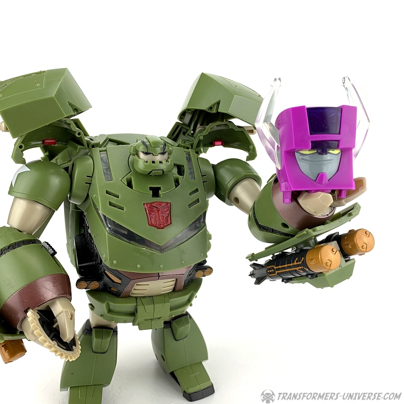 Which brings me to my one big gripe about this figure: The gimmicks. The voice gimmick is pretty good, no complaints there. Three sentences spoken by the original voice actor are played when you press the Autobot symbol on his chest. "Time for the Big Guns.", "Sorry, my bad." and "Let's do it, buddy!". There is a fourth sentence included that can only be heard when Bulkhead is taken over by the Headmaster (see below).