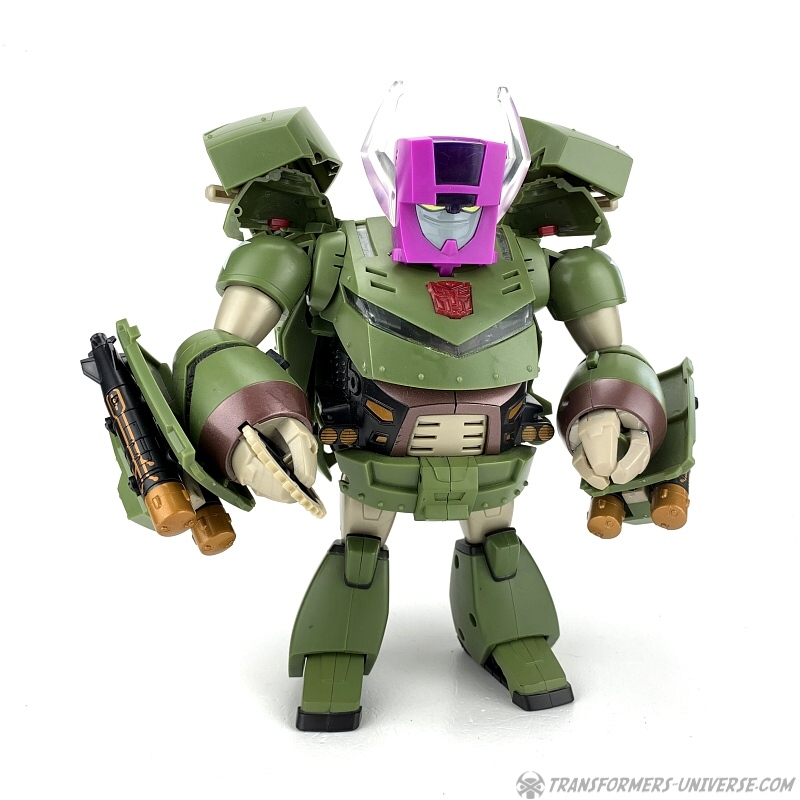 Alternate Mode: Bulkhead transforms into a kind of military armoured transport vehicle, not sure what it's called. It's basically a big green brick on wheels, but it does look pretty good and all the robot parts fold away nicely. The one major difference between Leader Bulkhead and the Voyager version is that Bulkhead's robot head doesn't flip down into the inside of the torso. Rather it is covered by a kind of helmet that serves as a small gun turret on top of the vehicle. I don't really have a problem with that, but it is another deviation from the cartoon counterpart.