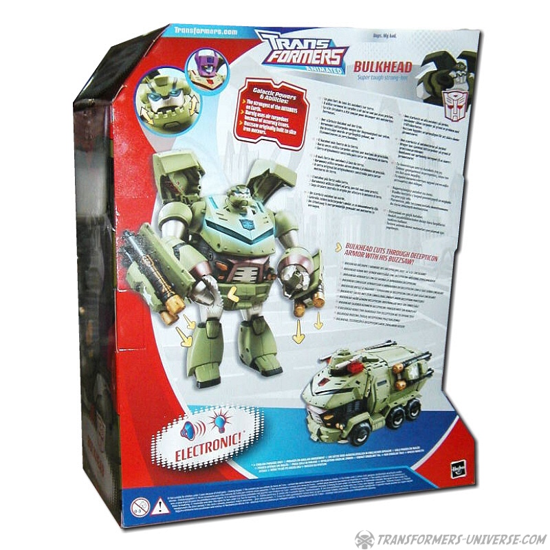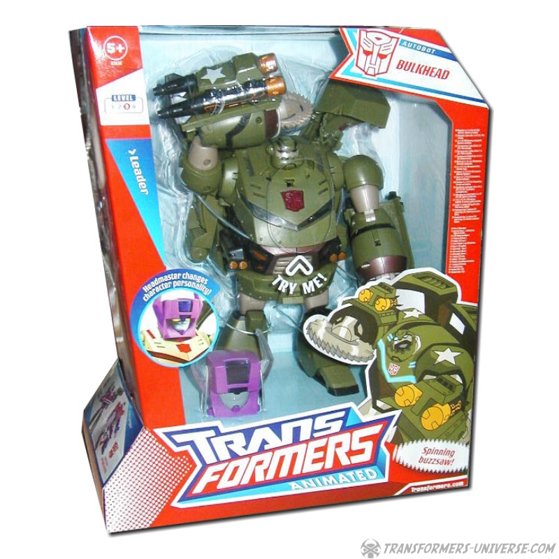 Partners / Add-Ons: In one episode of the cartoon Bulkhead got his head cut off and his body was then taken over by the Headmaster, a juvenile madman who built a flying head-unit that could control all kinds of robots. This Headmaster unit is included with Bulkhead. You don't have to cut off Bulky's head, though, the Headmaster fits over it like a helmet.