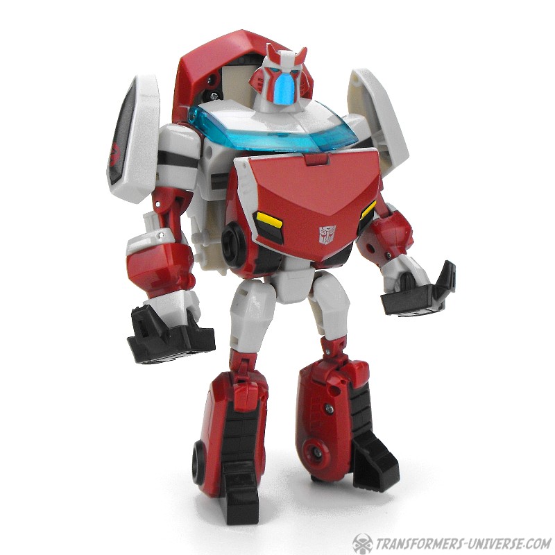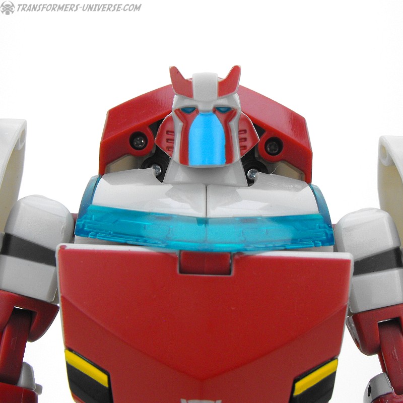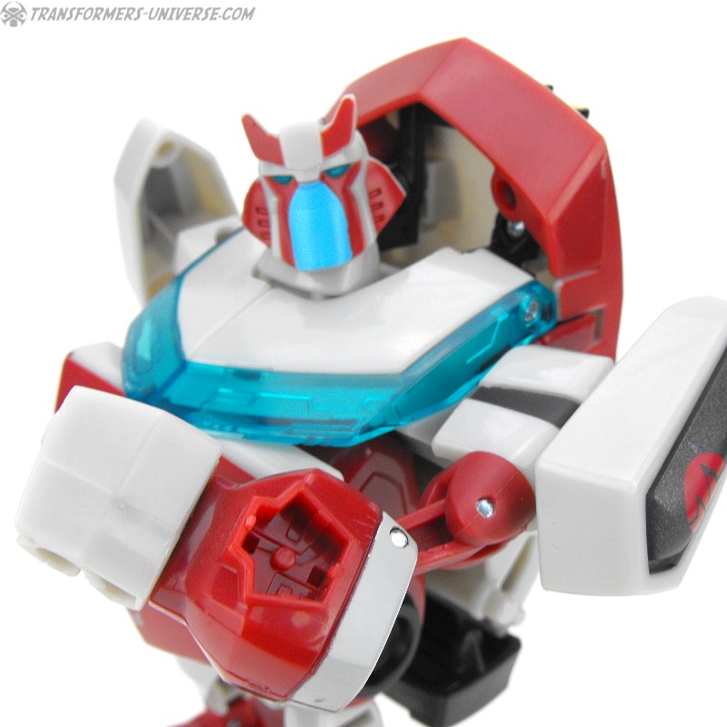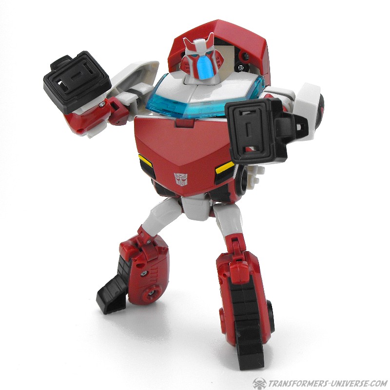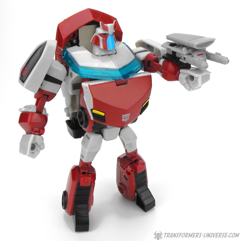 Robot Mode: This is where this figure really shines. The overall build is that of a boxer. He has a muscular upper torso with strong arms and face, while the legs are smaller and more nimble appearing. Adding to this image is that the only accessories he has are the shock paddles. His face is decent, shows a confident image, but lacks a solid mouth and a few extra paint apps to make it shine. Most specifically, his chevrons are only painted on the front and the grooves on his cheeks aren’t black.