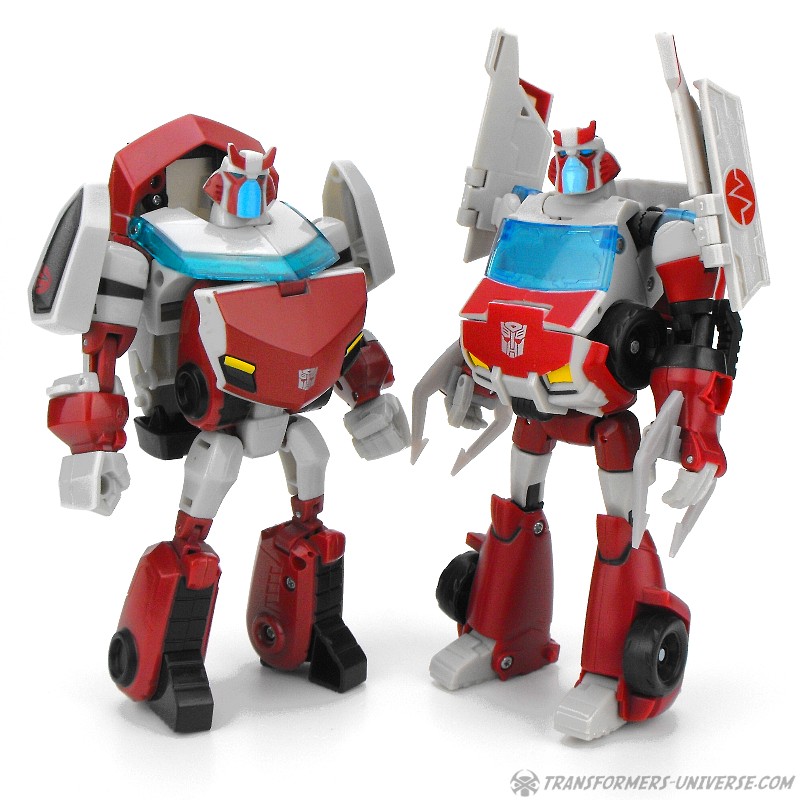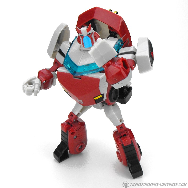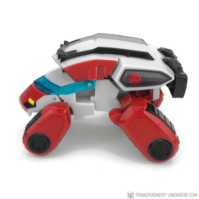 The colors are done well with the lights being painted and the reds and grey balancing out. You can see his life sign emblem on each side of the shell. While it looks nice and unique, the shape was a little difficult to pull off. Along with the hip issue stated above, the paddles could have a better method of securing themselves to their storage hooks. They just hang on via a thin peg that doesn’t fit well. Unlike Optimus Prime or Bumblebee, the coloring is the only concept identifying this mold as Ratchet. Change the coloring and he could be any bot (Ironhide jokes aside). Great mode without a set deal breaker, it will just be seen as odd by a lot of people.